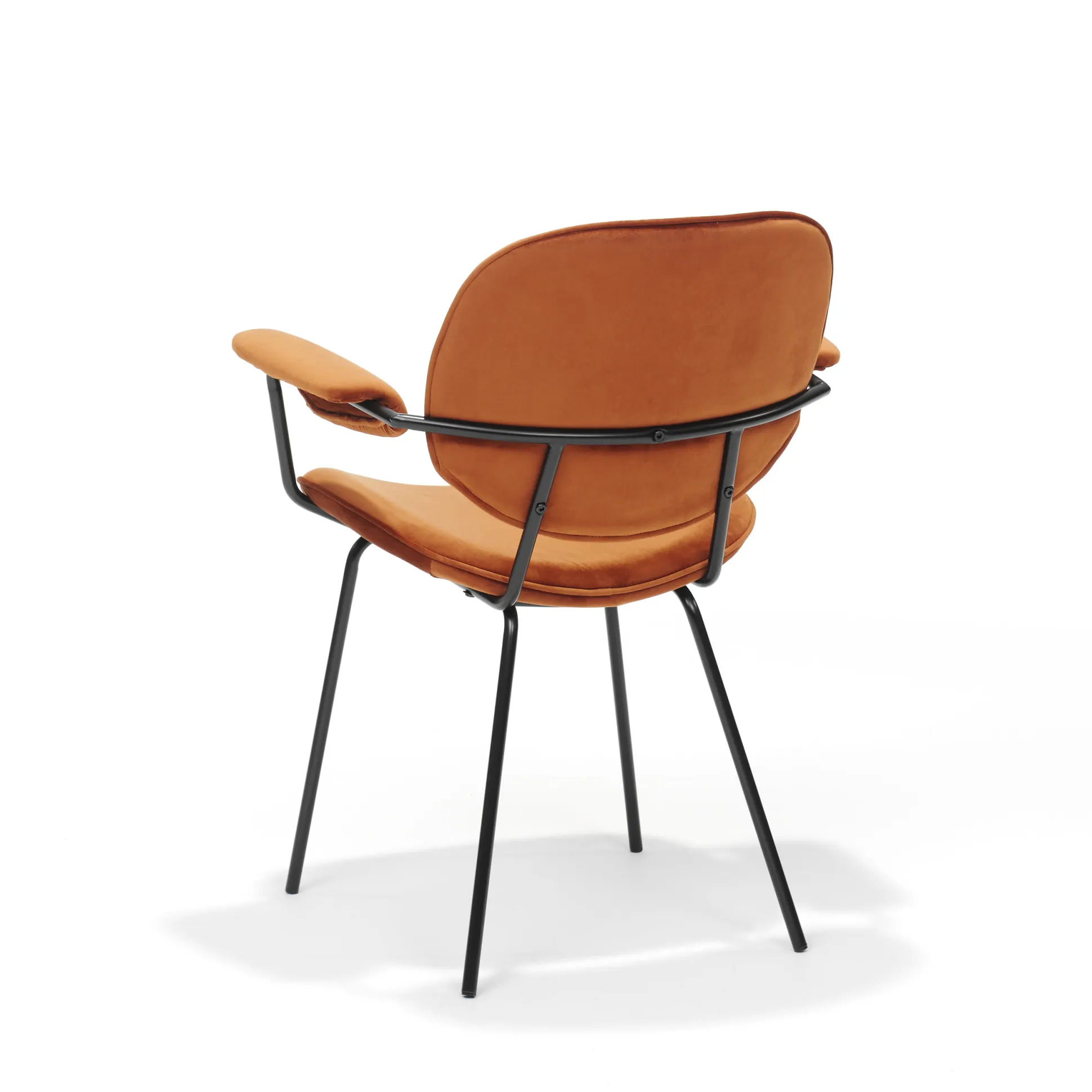 Deze unieke retrostoel heeft een ontzettend hippe en stijlvolle uitstraling door het gebruik van zwart metaal voor de poten en de gekleurde gestoffeerde zitting en rugleuning. De zitting, rugleuning en armleuningen zijn gemaakt van prachtig glanzend velours materiaal. De stoel heeft een zithoogte van 46 cm, een zitdiepte van 41 cm de armleuningen zijn 66,5 cm hoog. Armstoel Emma is verkrijgbaar in de kleuren Zwart, Grijs, Oker, Groen, Roze en Oranje en zijn per twee stuks te bestellen.