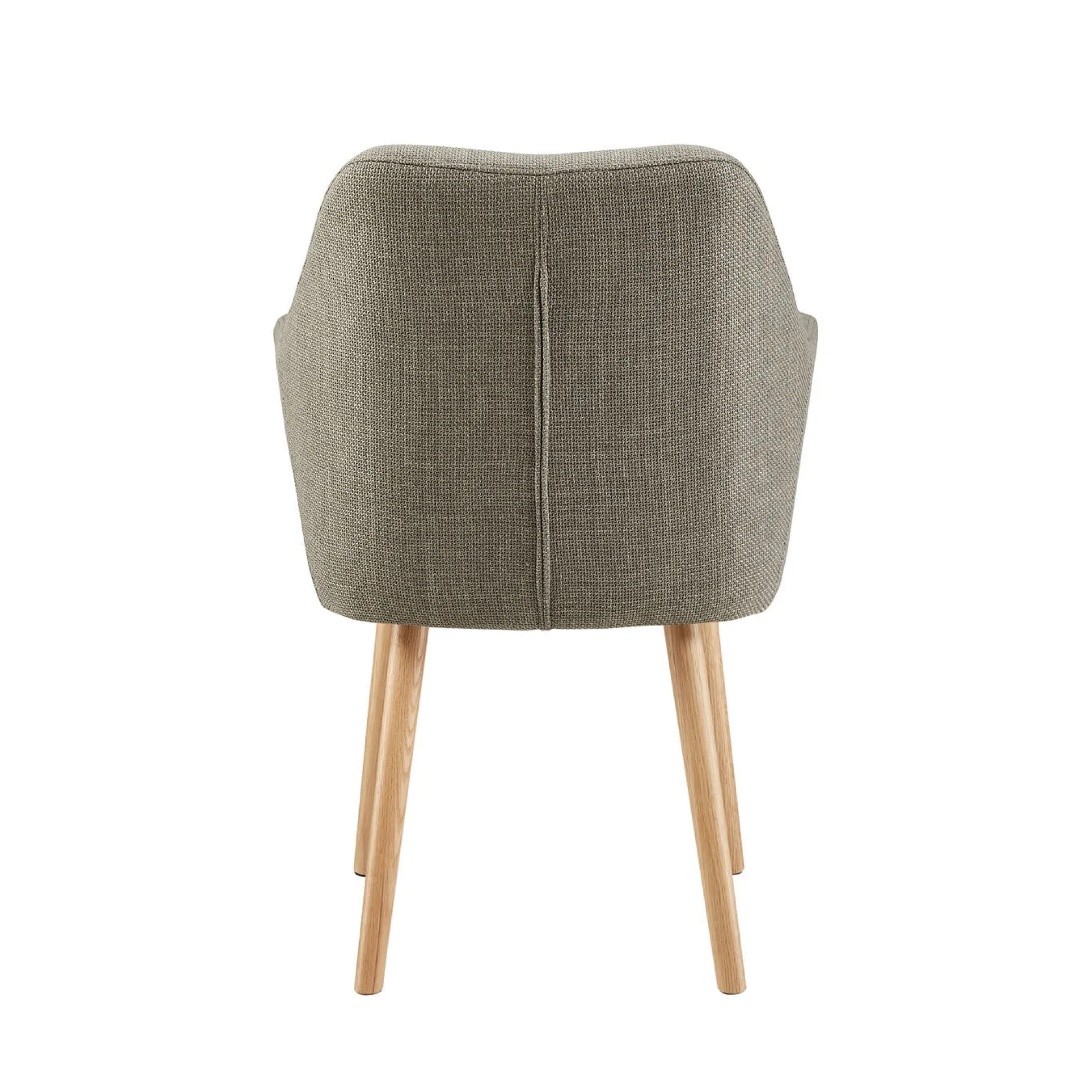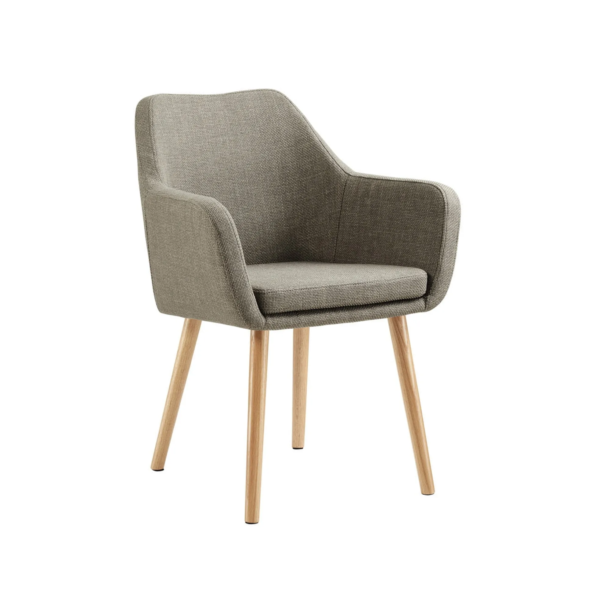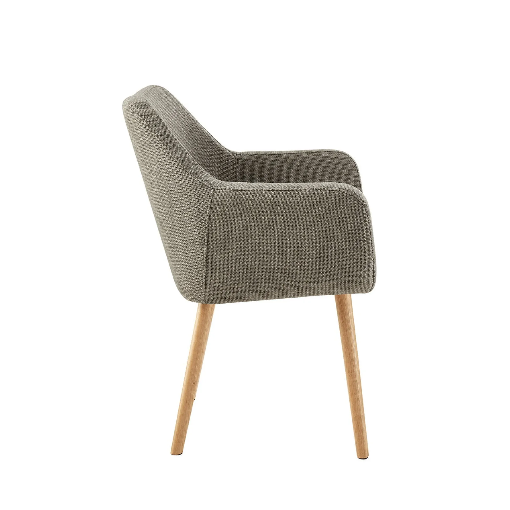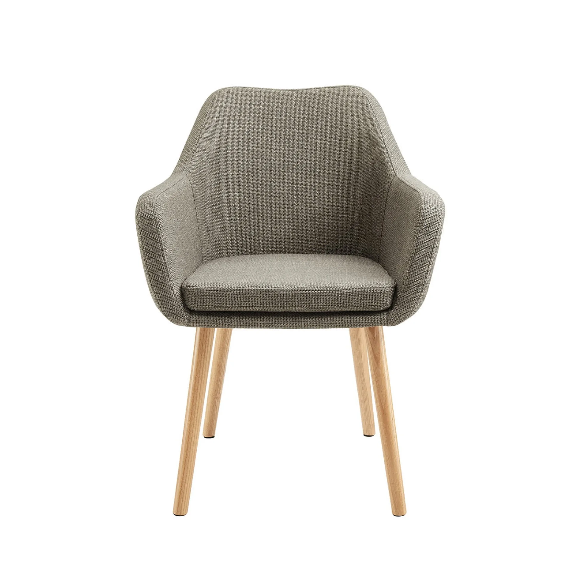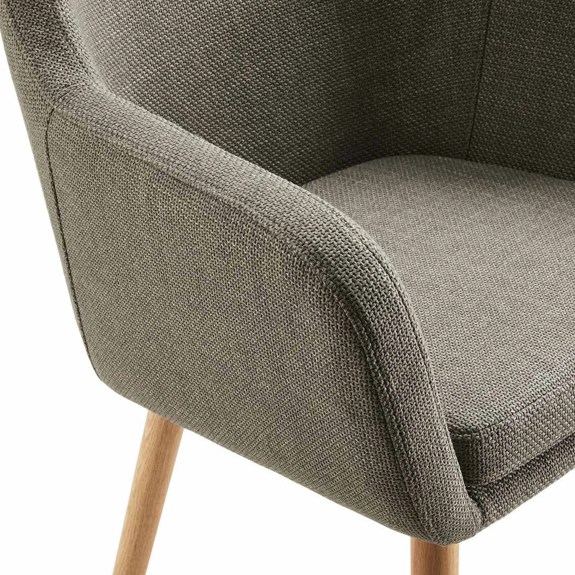 Deze fauteuil in bruine gestructureerde stof biedt een combinatie van comfort en natuurlijke elegantie, ondersteund door stoelpoten van massief eikenhout. Met een zithoogte van ongeveer 48,5 cm, een zitbreedte van 44 cm en een zitdiepte van 44,5 cm, is deze stoel ontworpen voor optimaal zitcomfort. De armleuningen hebben een hoogte van 67 cm en de rugleuning is 42 cm hoog. De poten, met een hoogte van 39 cm, bieden een stevige en stabiele basis.