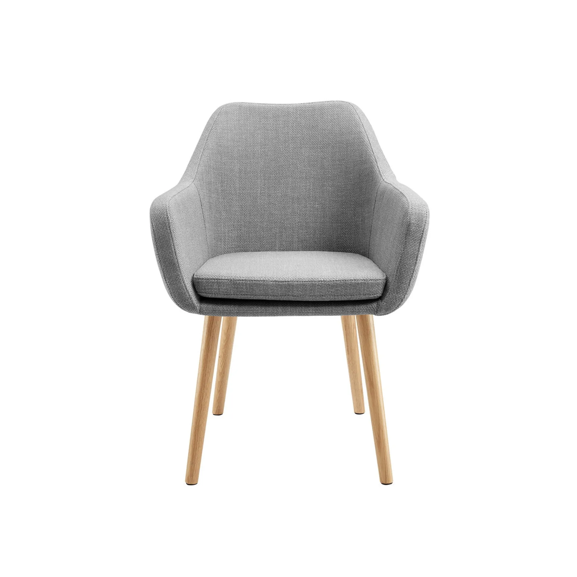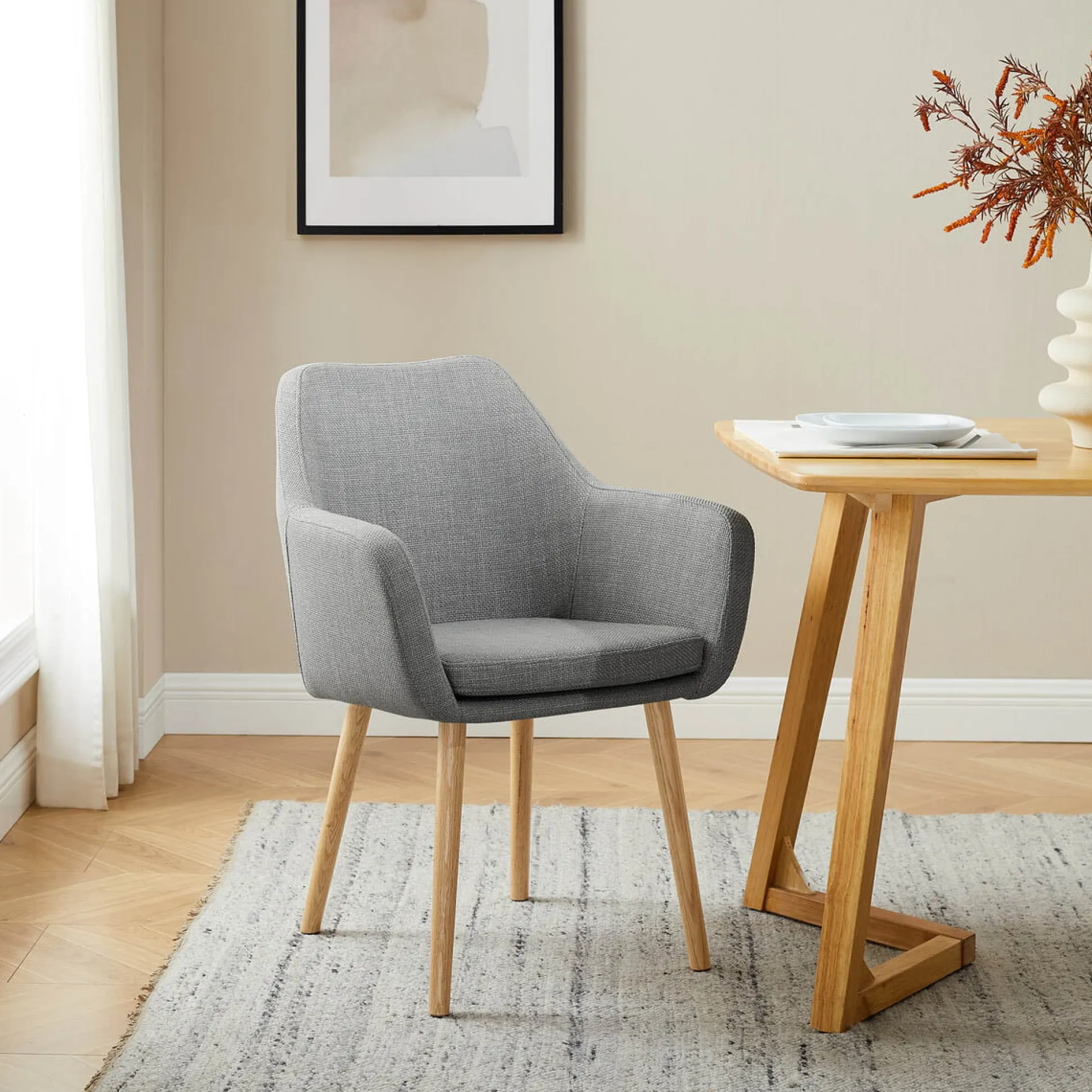 Deze fauteuil in lichtgrijze gestructureerde stof biedt zowel comfort als een verfijnde uitstraling, ondersteund door poten van massief eikenhout. Met een zithoogte van ongeveer 48,5 cm, een zitbreedte van 44 cm en een zitdiepte van 44,5 cm, biedt deze stoel een ergonomische zitervaring. De armleuningen hebben een hoogte van 67 cm en de rugleuning is 42 cm hoog. De stevige poten, met een hoogte van 39 cm, zorgen voor stabiliteit en duurzaamheid.