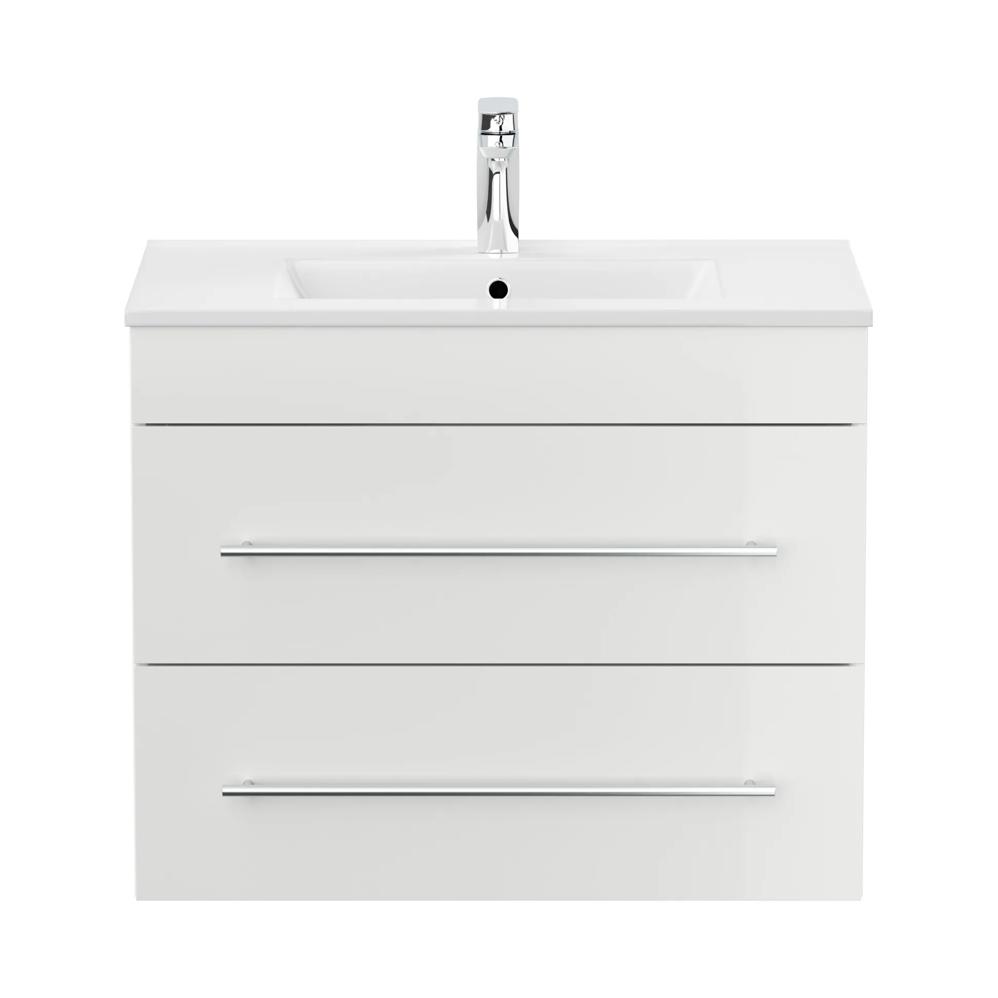 Het Badmeubel Vegas Wit Hoogglans 75 cm is een moderne en complete oplossing voor je badkamer. Ontworpen in Duitsland en gemaakt van hoogwaardig spaanplaat, biedt dit meubel een frisse uitstraling dankzij de hoogglanzende witte afwerking. De keramische wastafel met overloop is gemakkelijk te onderhouden, terwijl de twee laden met softclose-systeem voor een geruisloze sluiting zorgen.