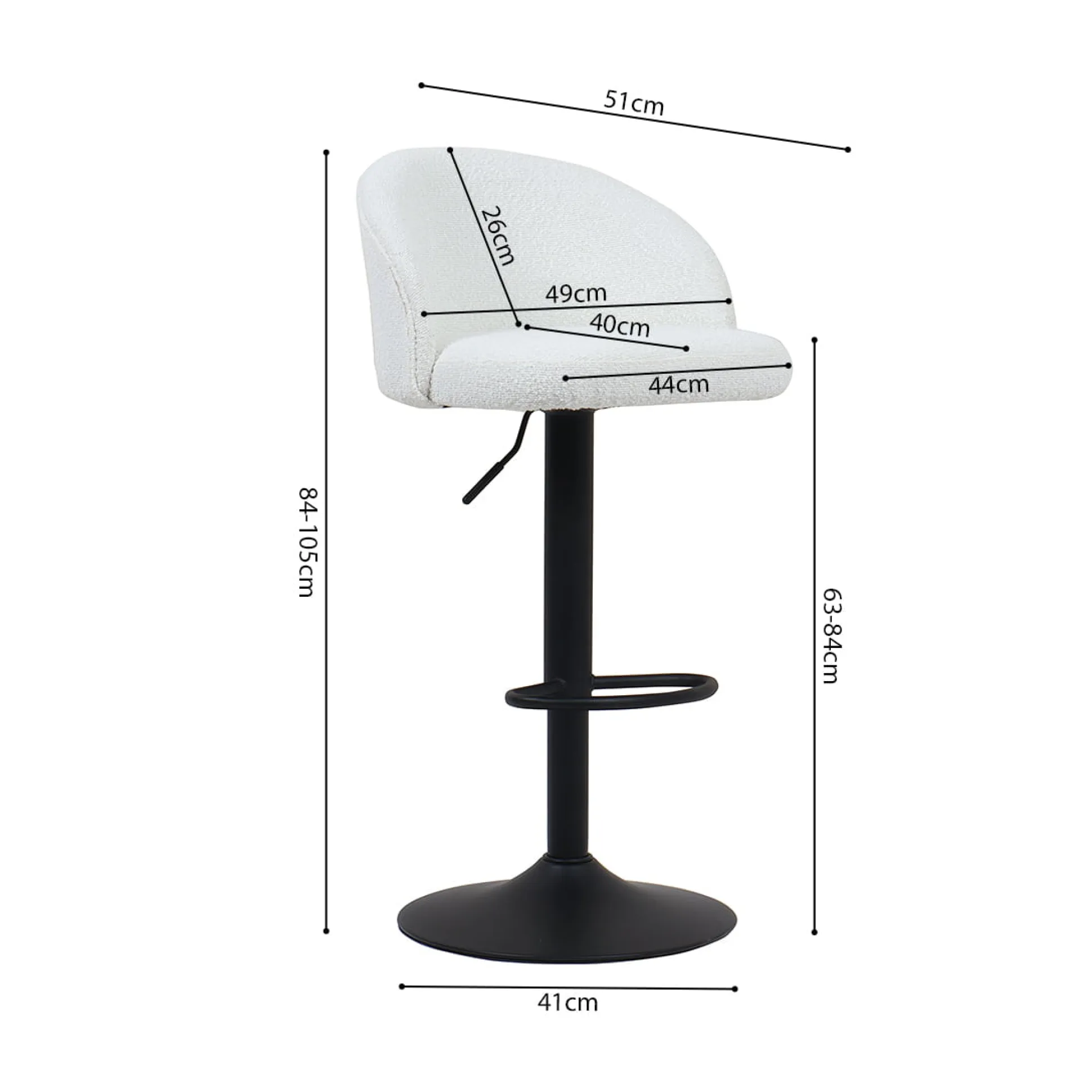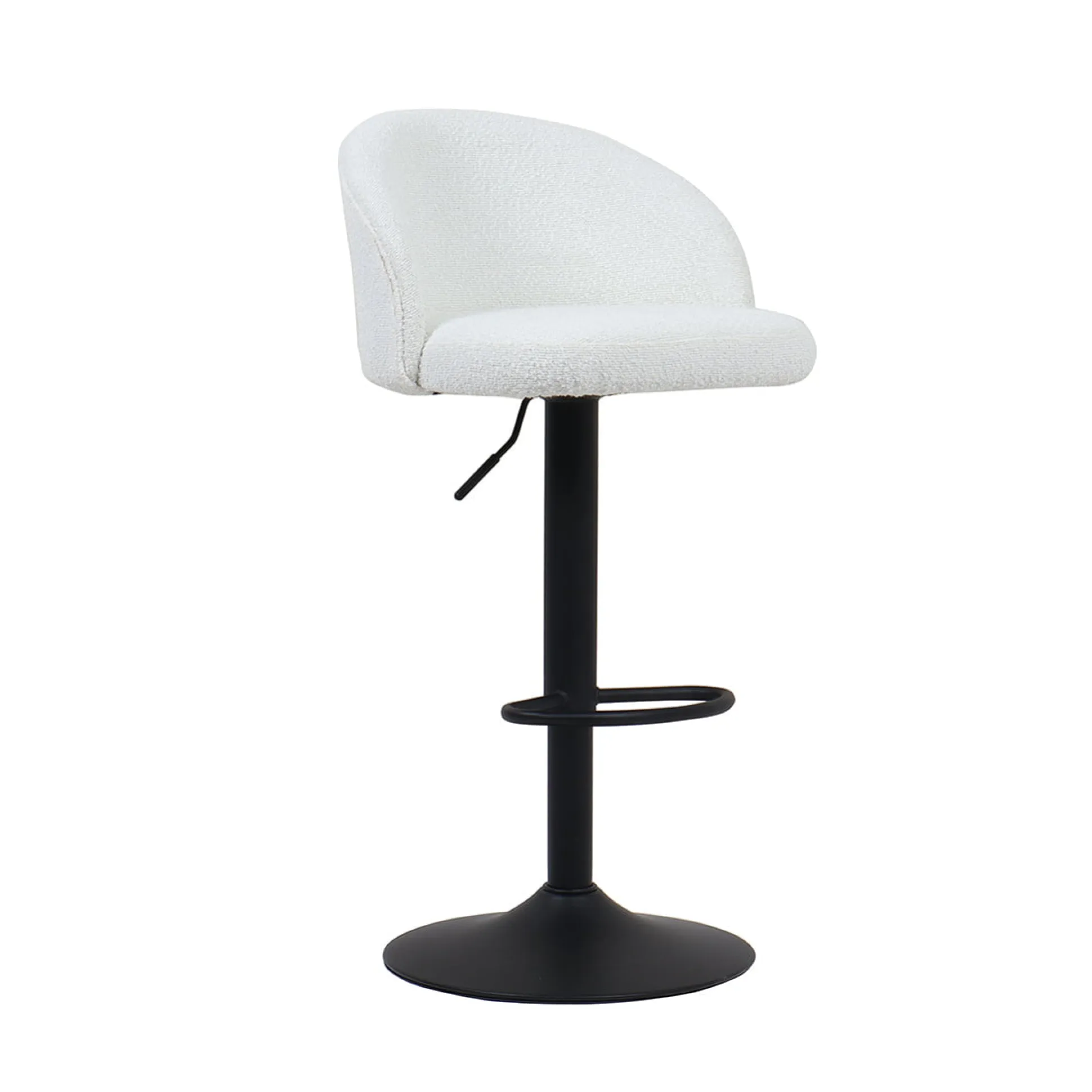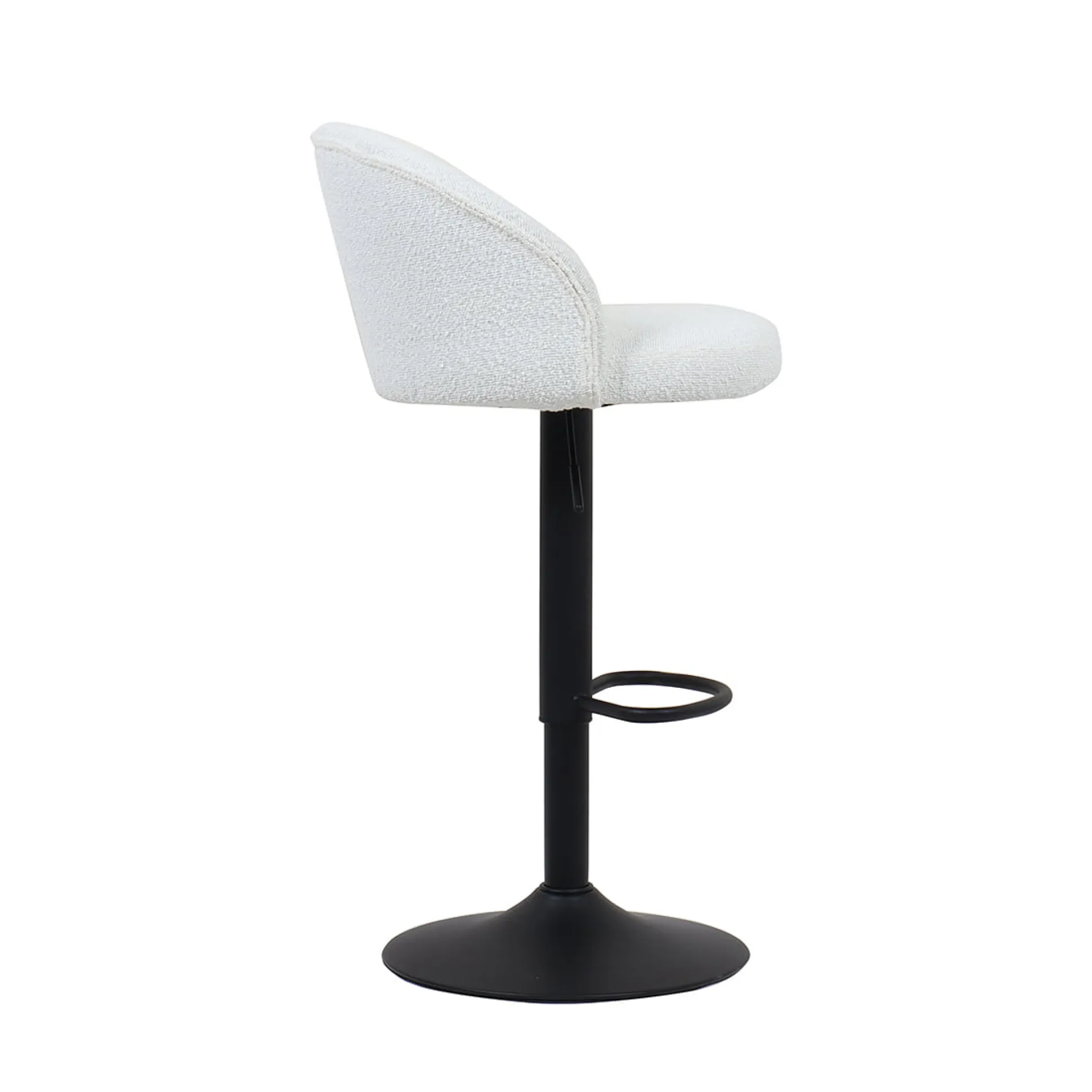 Deze set van twee witte Babet barkrukken voegt stijl en comfort toe aan je keuken of bar. Met hun moderne Bouclé bekleding en in hoogte verstelbare ontwerp, zijn ze perfect voor elke gelegenheid. De minimale zithoogte is 63 cm en de maximale zithoogte is 84 cm, waardoor je ze kunt aanpassen aan jouw keukeneiland of bartafel. De zitdiepte is royaal, met 46 cm ruimte om comfortabel te zitten.