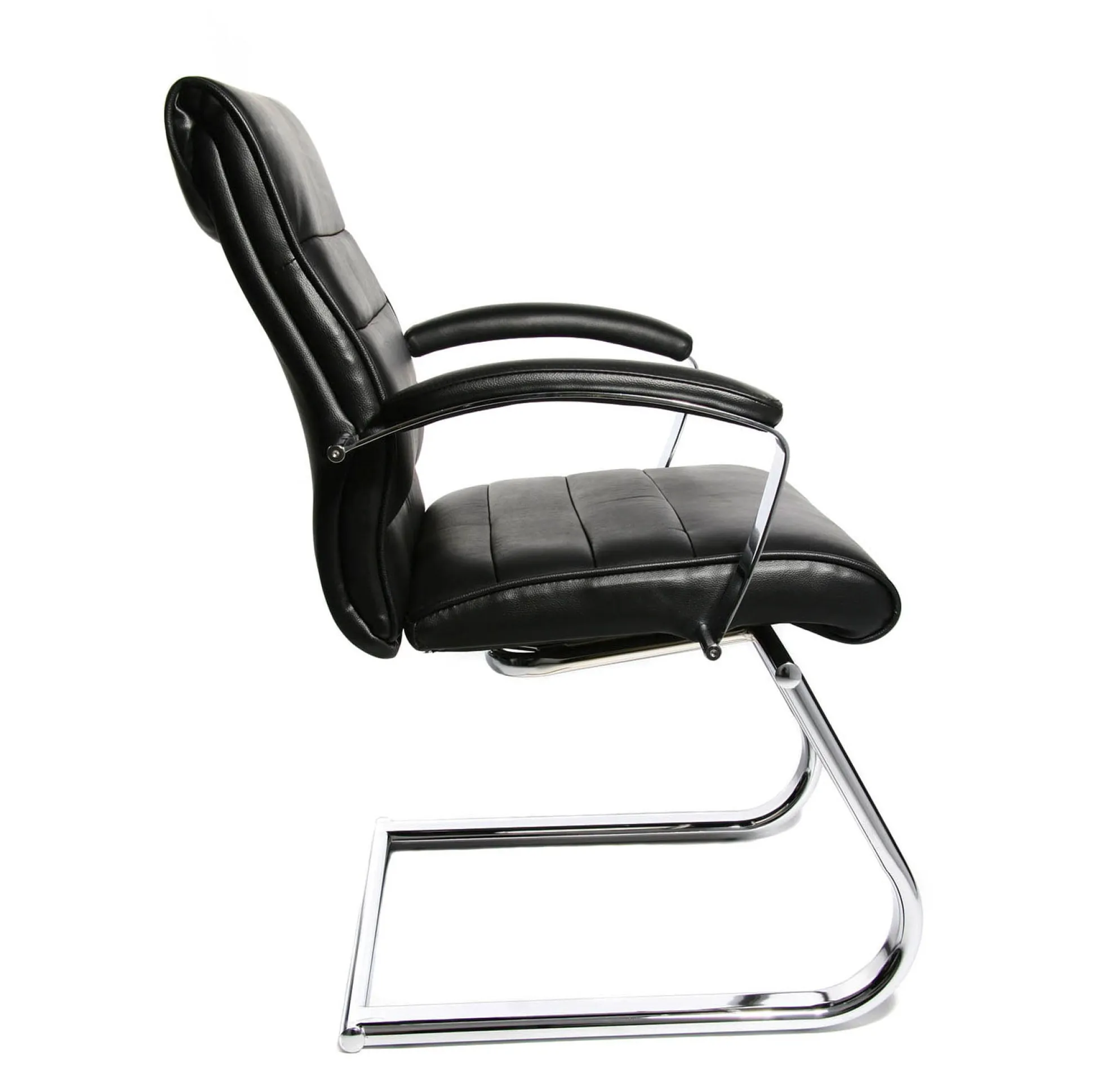 Deze bezoekers fauteuil is uitgevoerd in zwart zacht leer met een mooi gestileerd verchroomd onderstel. De achterrug en zijkanten zijn afgewerkt in een zelfde leatherlook. In de rug zit een geïntegreerde lendenwervel ondersteuning en zijn mooie verticale stiknaden verwerkt.