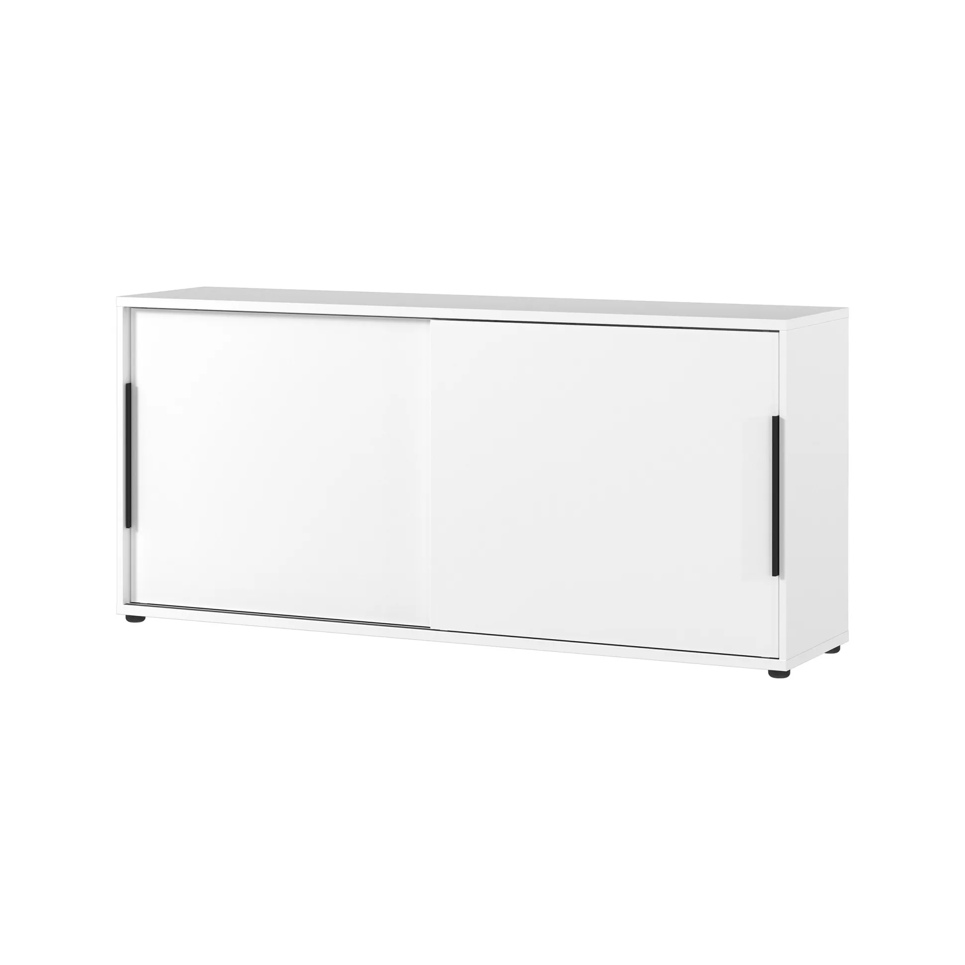 De kast is uitgevoerd in de kleur wit en heeft twee zwarte handgrepen van poeder gecoat metaal. Naast zijn duurzame oppervlaktecoating en schok- en stootbestendige randen, biedt deze kast ook flexibiliteit met zijn schuifdeuren voor gemakkelijke toegang tot de inhoud.