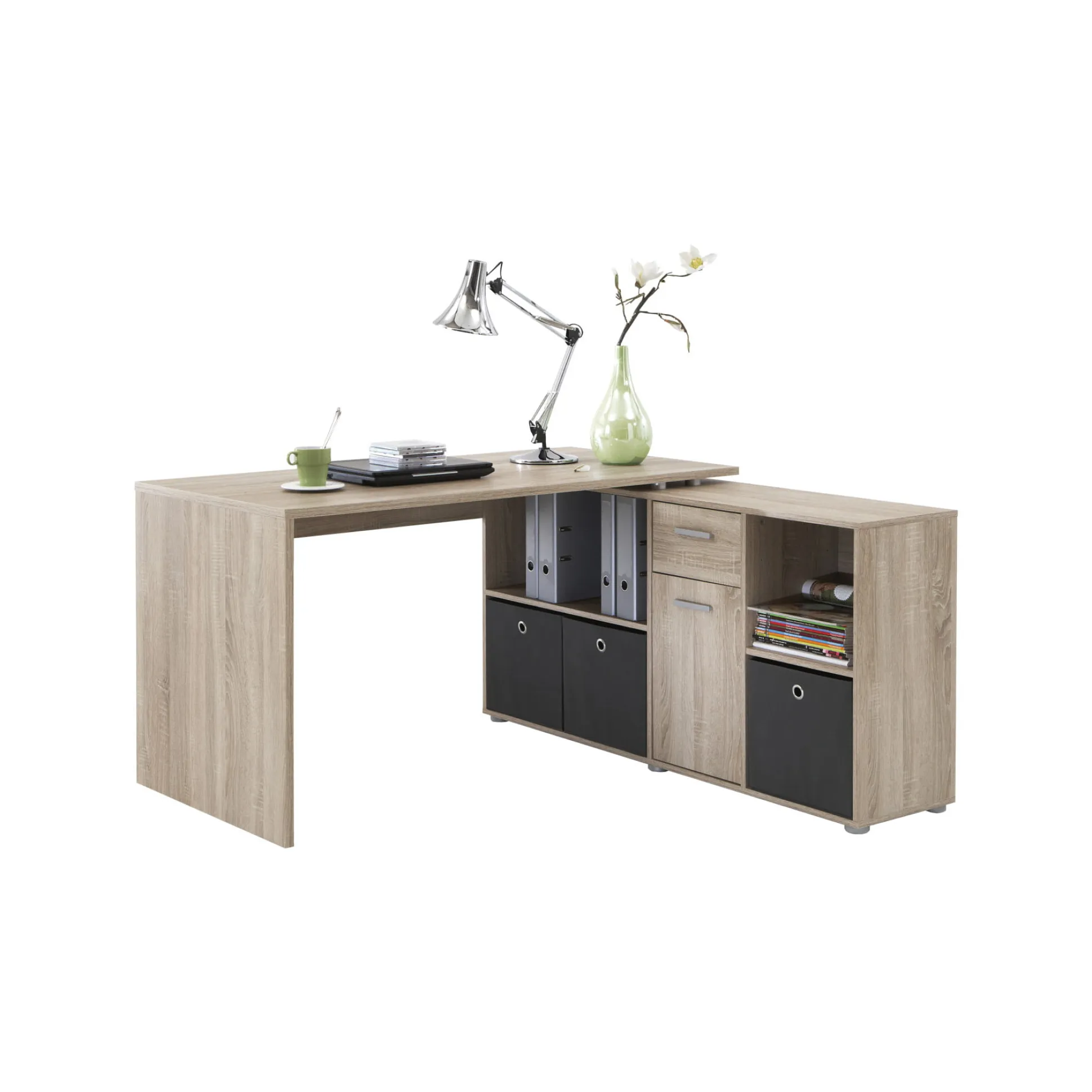 Het bureau kan in 4 verschillende opstellingen opgebouwd worden, is vervaardigd uit een stevige spaanplaat en afgewerkt met een sterke melamine. Door zijn speelse opstelling is dit bureau goed te plaatsen in zowel de woonkamer, slaapkamer als studeerkamer. Gemakkelijk te monteren door middel van de bijgeleverde montagehandleiding. Achter de deur bevindt zich 1 verstelbare legplank. In de bureaukast is voldoende opbergruimte voor bijvoorbeeld mappen, boeken en andere kantoorartikelen. Verkrijgbaar in meerdere kleuren.
