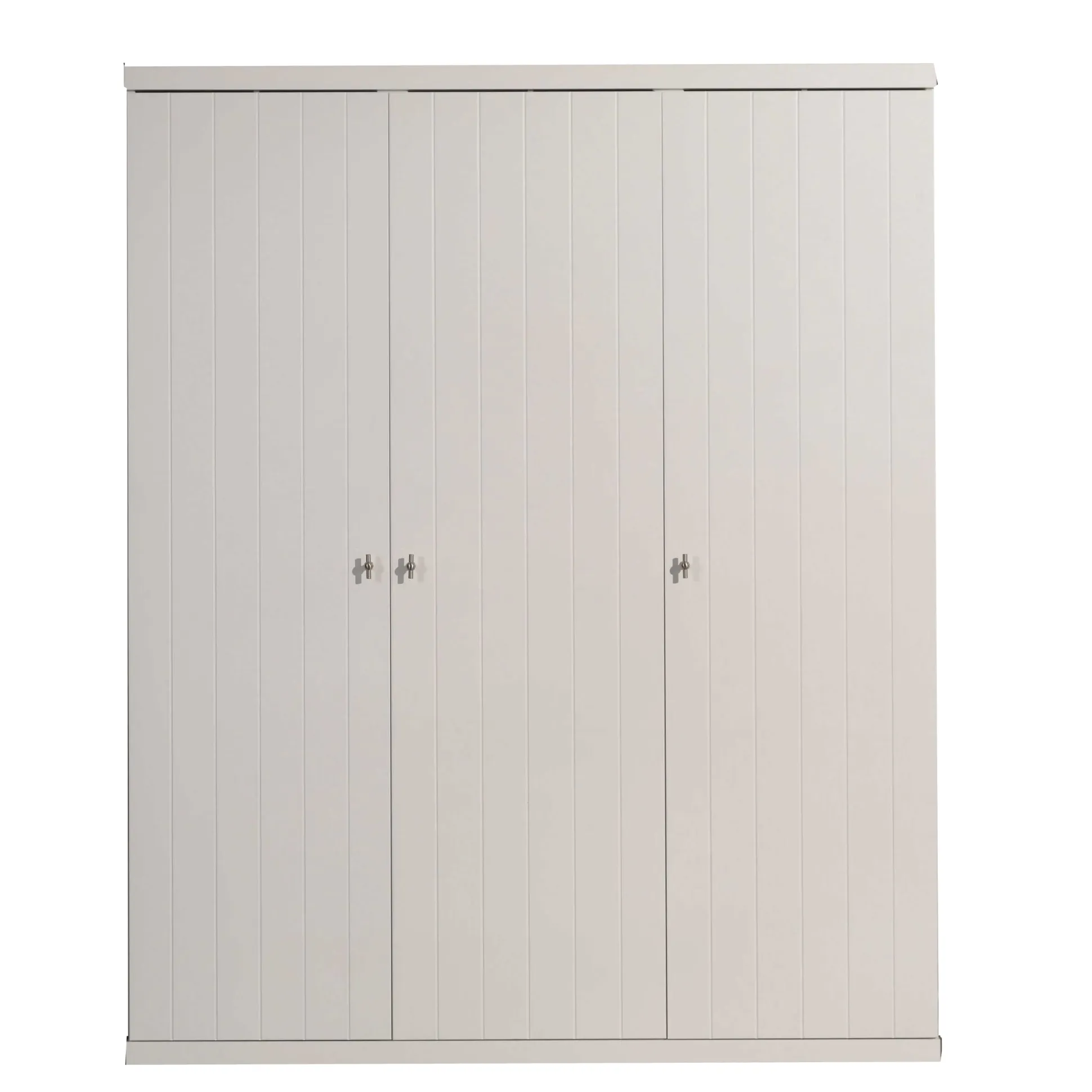 Deze 3-deurs-kledingkast heeft achter de 2 linkerdeuren links boven een legpank, waaronder een kledingroede, achter de rechter deur bevinden zich 4 legplanken. Achter de rechterdeur bevindt zich boven een legplank en daaronder een kledingroede. De deuren en zijkanten van de kast zijn vervaardigd uit hoogwaardig MDF met verticale infrezingen, wat de kast een aparte look geeft.