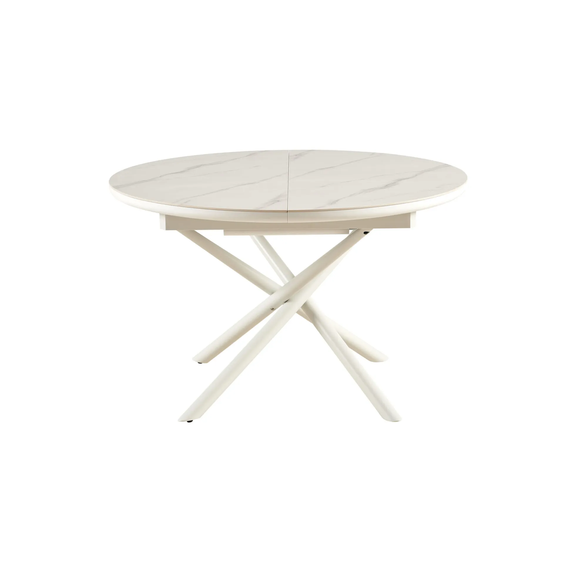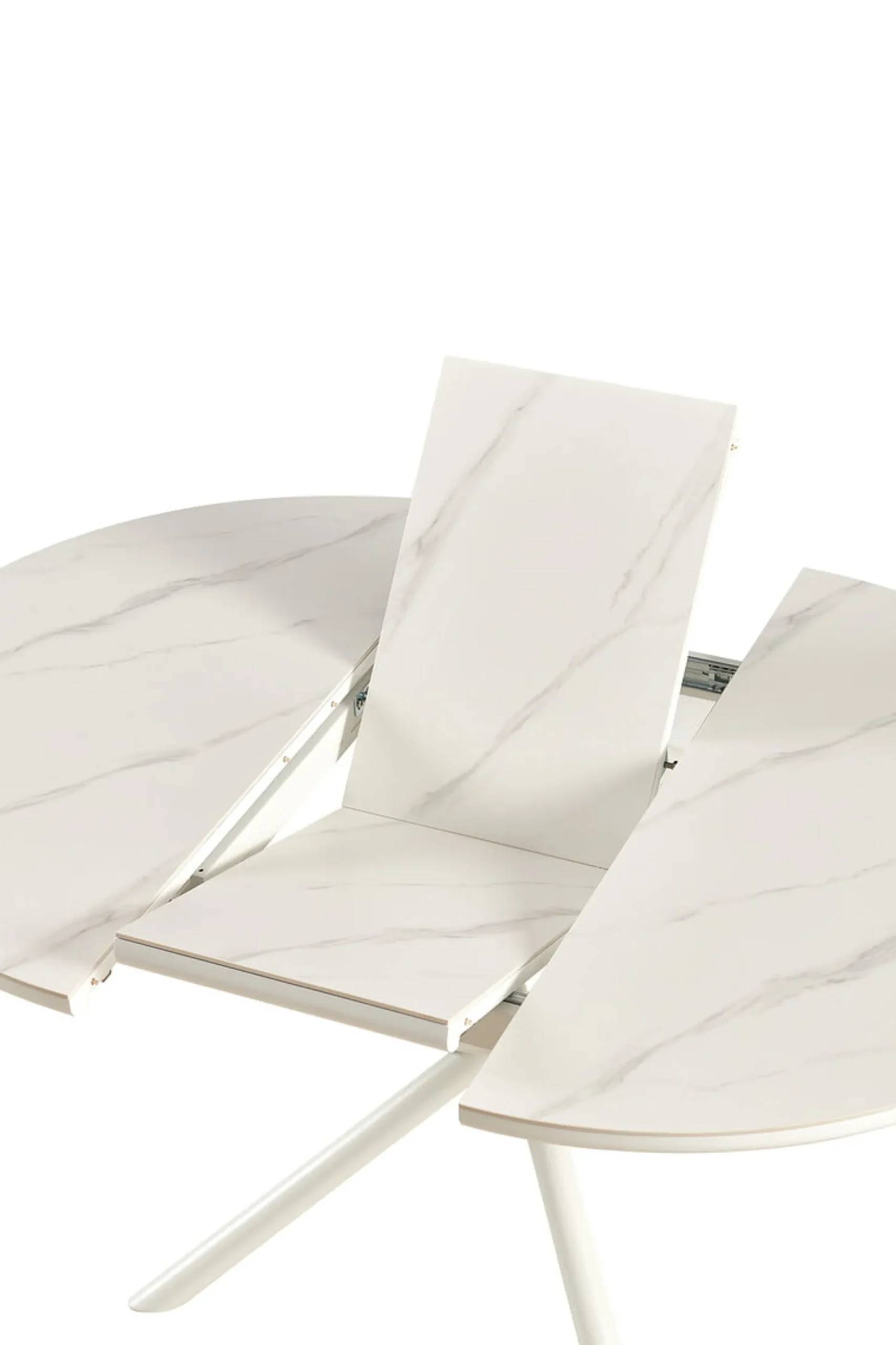 Een elegante witte eetkamertafel met een praktisch uitschuifmechanisme en een luxueuze marmerlook.