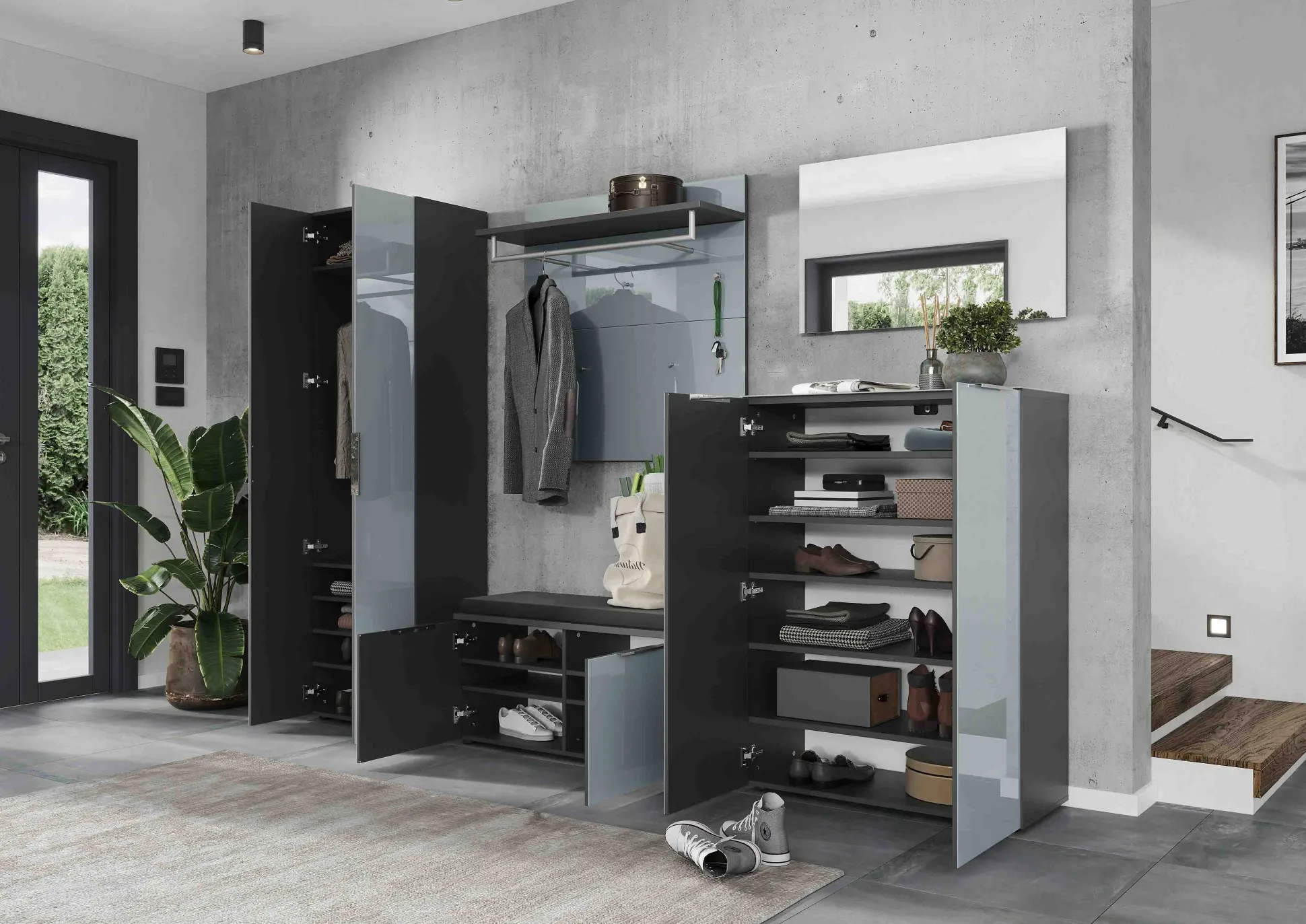 Stijlvolle halbank met voldoende opbergruimte voor ongeveer 12 paar schoenen. Zodra je de juiste schoenen hebt uitgekozen kun je deze gemakkelijk zittend aantrekken. Achter de deuren bevinden zich 2 verstelbare legplanken. De glazen fronten in combinatie met de grafieten kast maakt deze halbank een echte eyecatcher. Zitkussen is separaat bij te bestellen. Gemakkelijk te monteren door middel van de bijgeleverde montagehandleiding. Bekijk ook de andere producten uit deze serie!