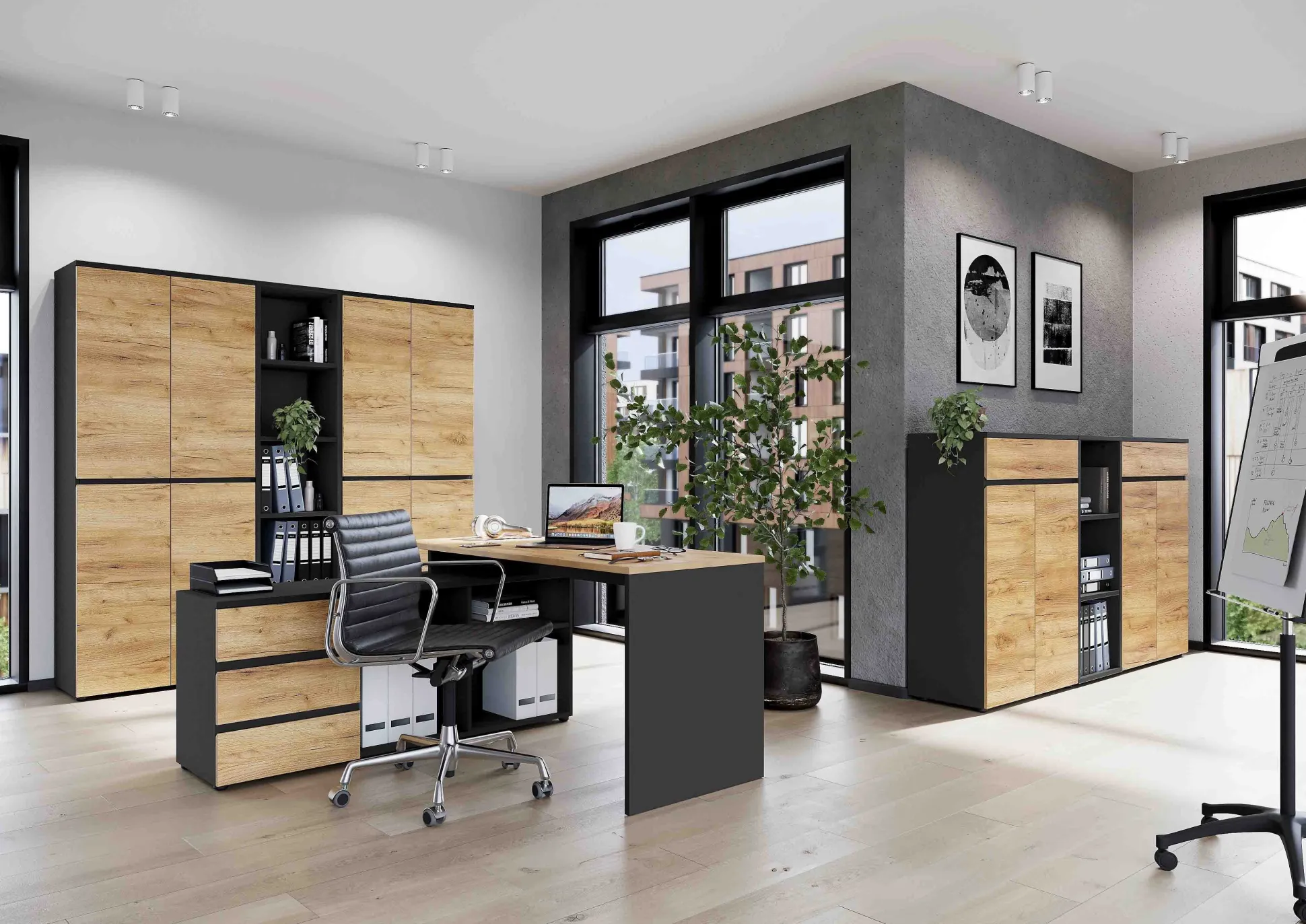 Dit degelijke bureau kan gespiegeld worden gemonteerd, de laden zijn voorzien van greep loze fronten. Middels de 2 verstelbare legplanken heb je voldoende opbergruimte voor ordners en andere dagelijks benodigdheden. Kleine accessoires kun je gemakkelijk kwijt in 1 van de 3 laden. De laden sluiten geruisloos en de randen van het bureau zijn afgewerkt met ABS-kantafwerking waardoor deze tegen een stootje kunnen. Gemakkelijk te monteren door middel van bijgeleverd montagehandleiding. Bekijk de andere elementen uit deze serie en richt je kantoor in één keer helemaal in!