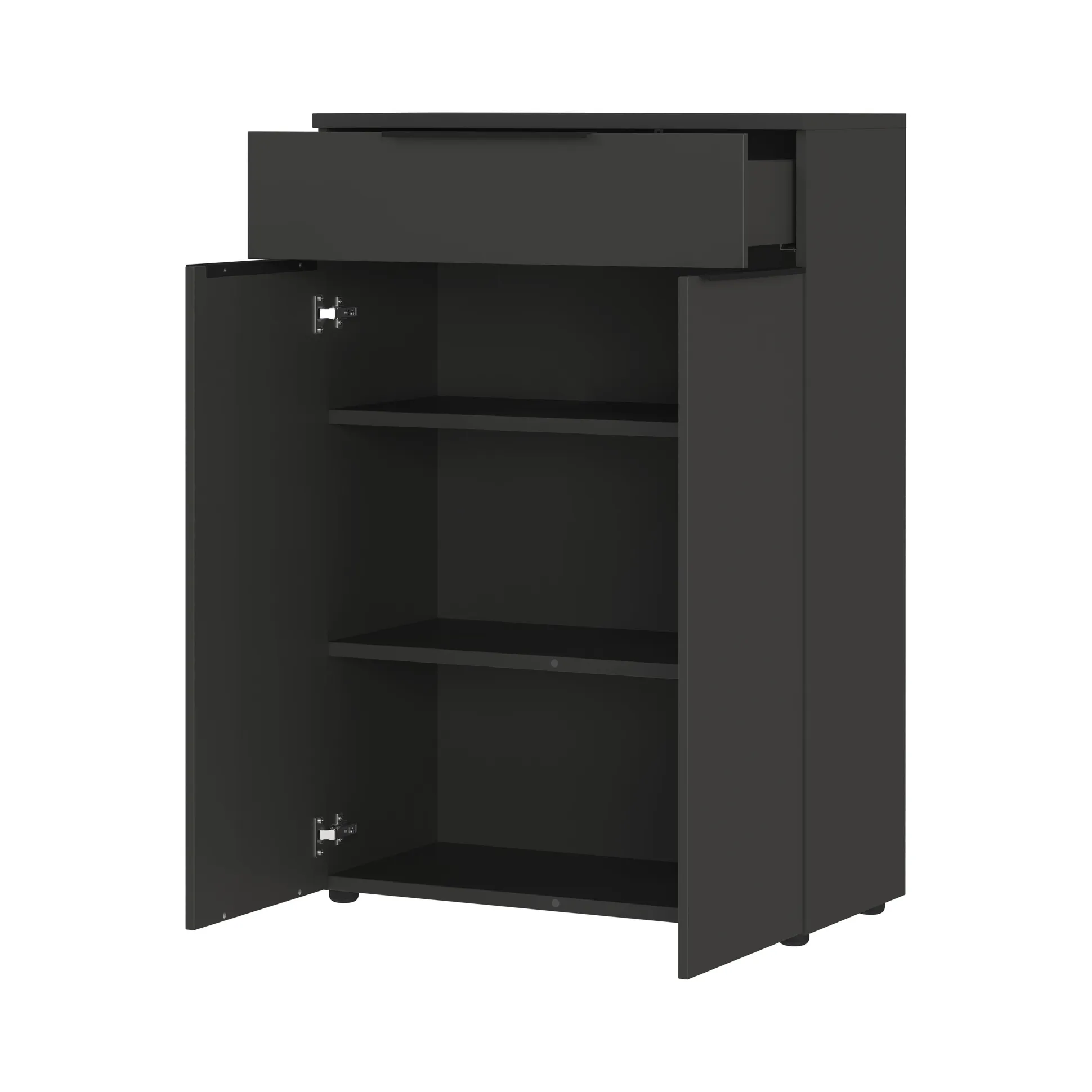 Met één lade en twee deuren biedt deze kast voldoende ruimte om documenten, kantoorbenodigdheden en andere materialen op te bergen. Achter de deuren bevinden zich twee verstelbare planken, elk belastbaar tot 10 kg, waardoor verschillende opbergconfiguraties mogelijk zijn.
