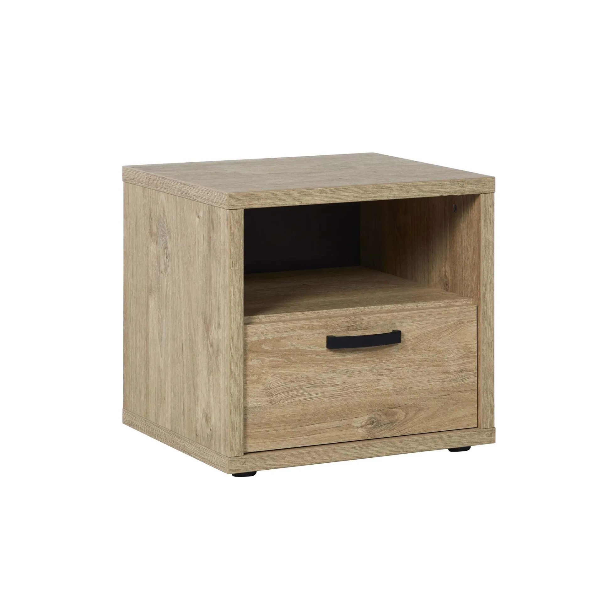 Dit nachtkastje heeft een warme uitstraling door zijn zwart metalen handvat gecombineerd met de goudeiken afwerking. Een stevig nachtkastje waarmee je verzekerd bent van een lange levensduur. Gemakkelijk te monteren door middel van bijgeleverde montagehandleiding. Dit meubel is vervaardigd uit een stevige spaanplaat en afgewerkt met een sterke melamine. Bekijk ook de andere meubelen uit deze serie en richt je slaapkamer in één keer helemaal in!