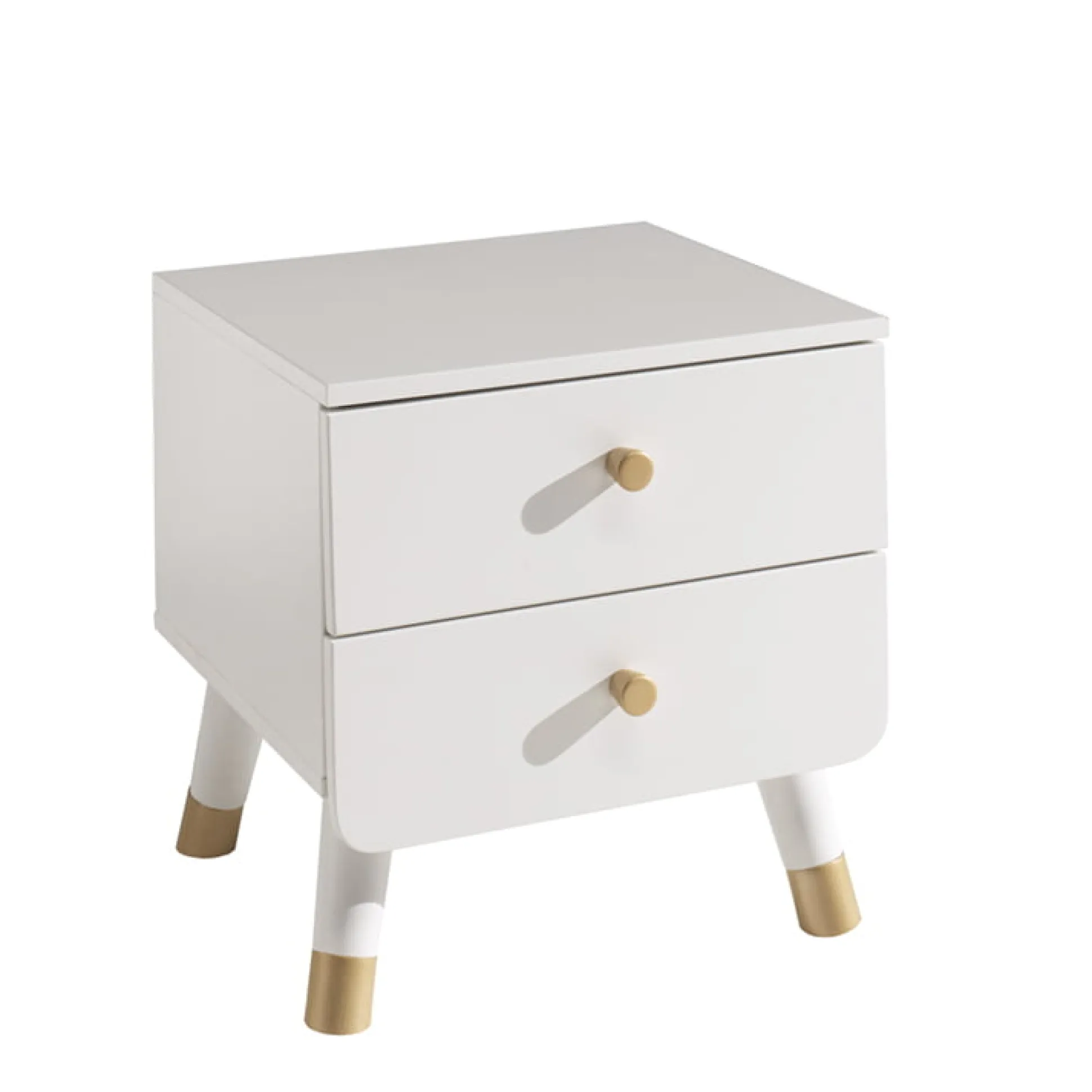 Het nachtkastje heeft 2 laden en is gemaakt van MDF.