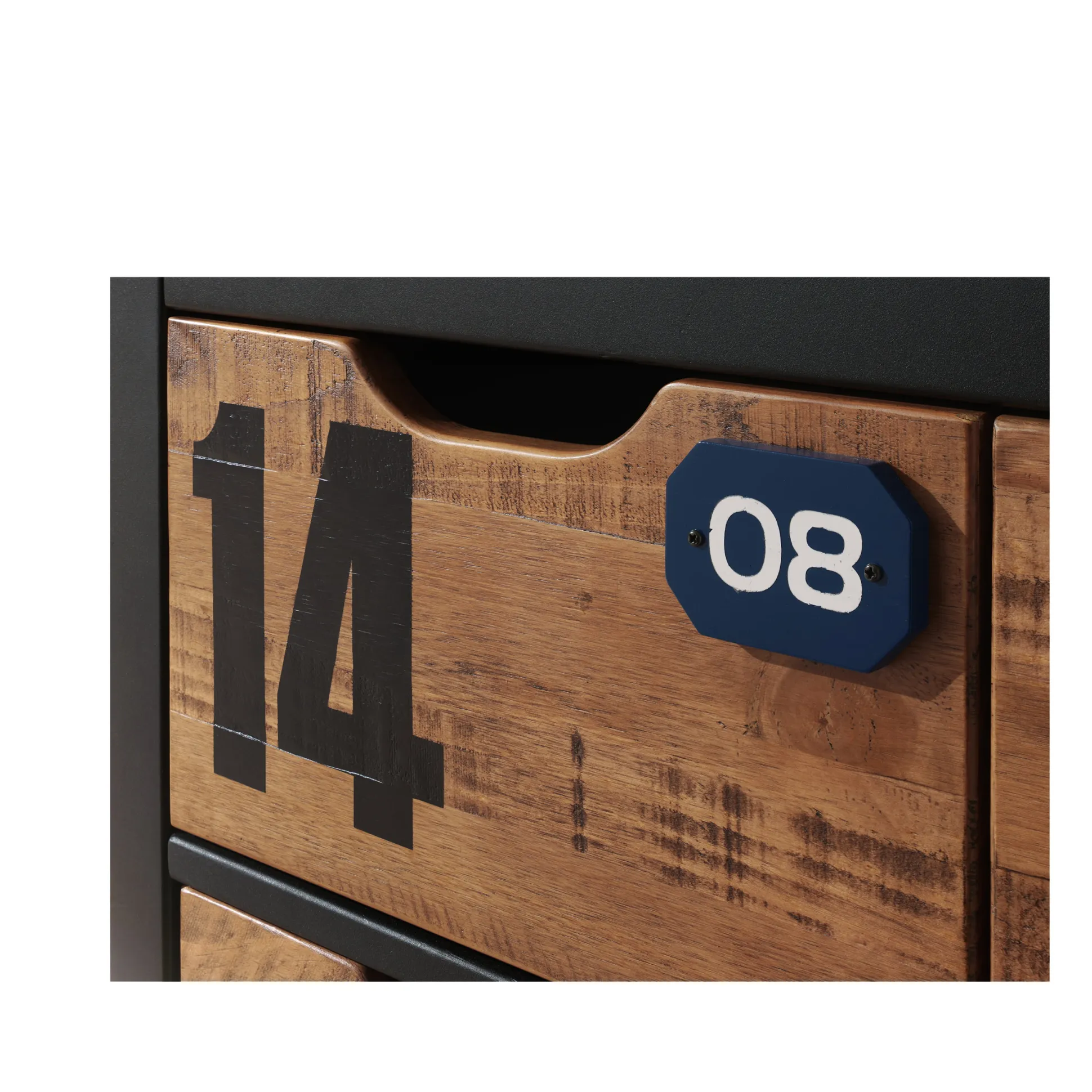 Dit stevige nachtkastje is voorzien van 2 laden met handige handgrepen. De ladefronten en zijkanten van het kastje zijn vervaardigd uit bruin gebeitst massief grenen en de stijlen uit zwart gelakt MDF.