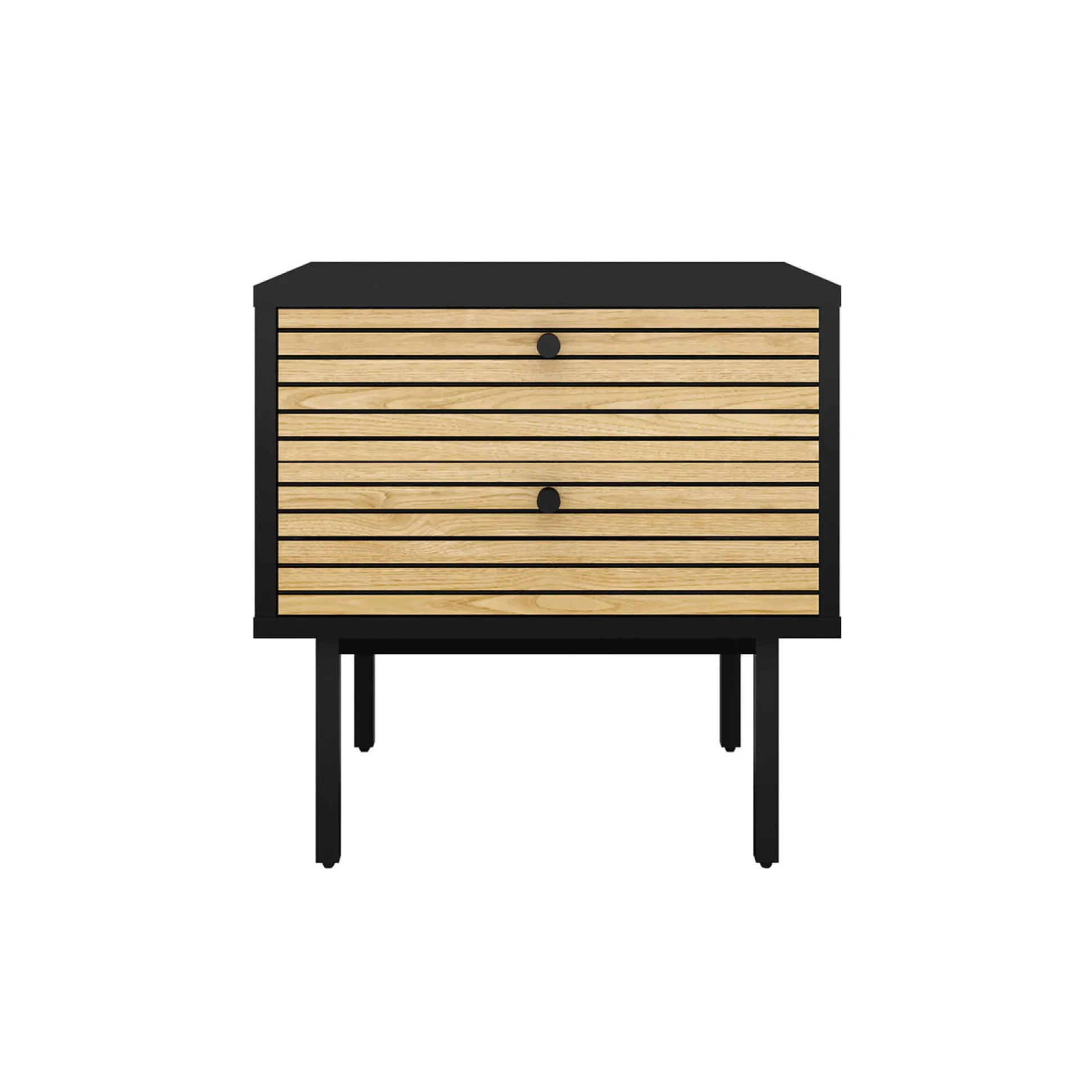Dit handige nachtkastje is een echte eyecatcher in je interieur. De ombouw van de kast is vervaardigd uit een sterke MDF en afgewerkt met een stevige melamine coating. De fronten van de kast zijn afgewerkt met een eiken fineer. Voldoende opbergruimte voor al je spullen in de twee laden, bovenop de kast is plaats voor enkele accessoires. Gemakkelijk te monteren doormiddel van bijgeleverde montagehandleiding. Bekijk ook de andere elementen uit deze serie!
