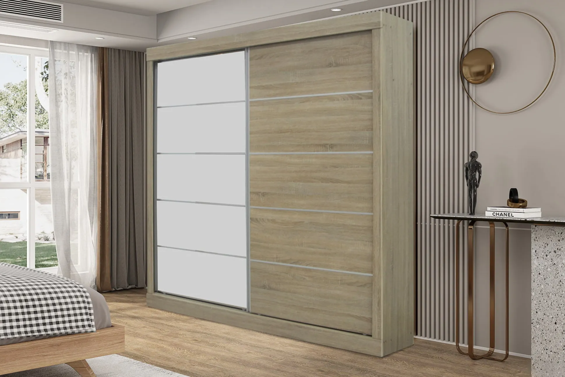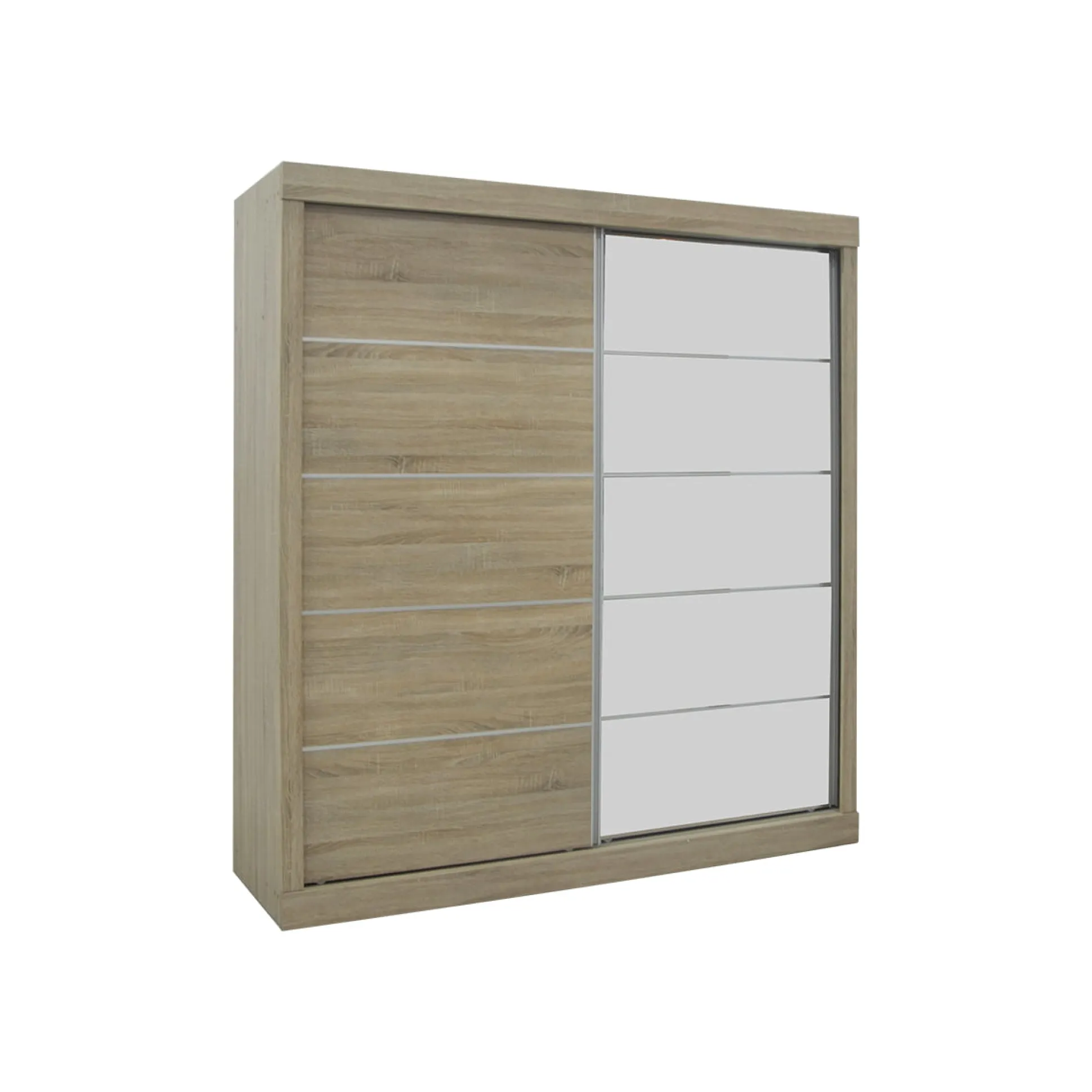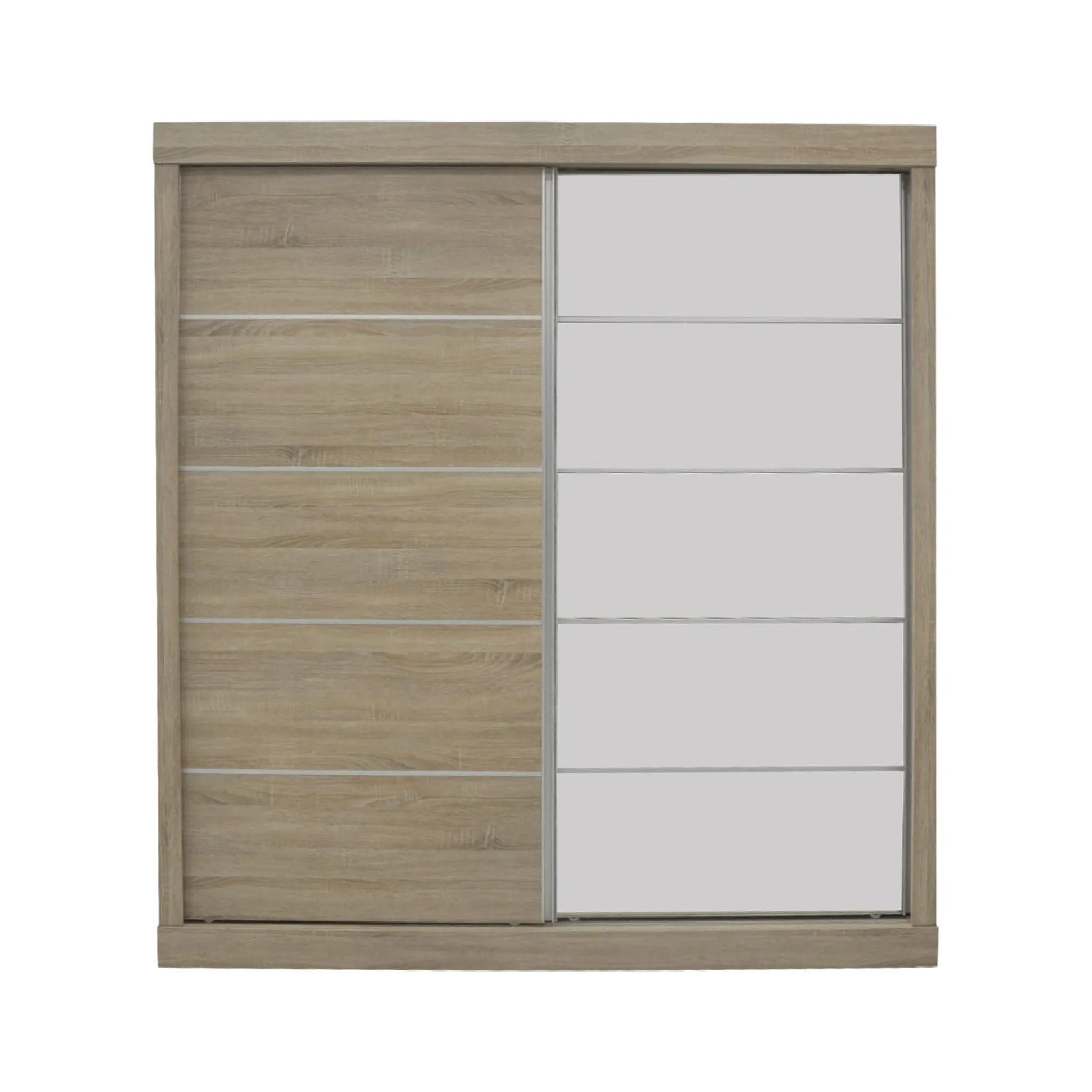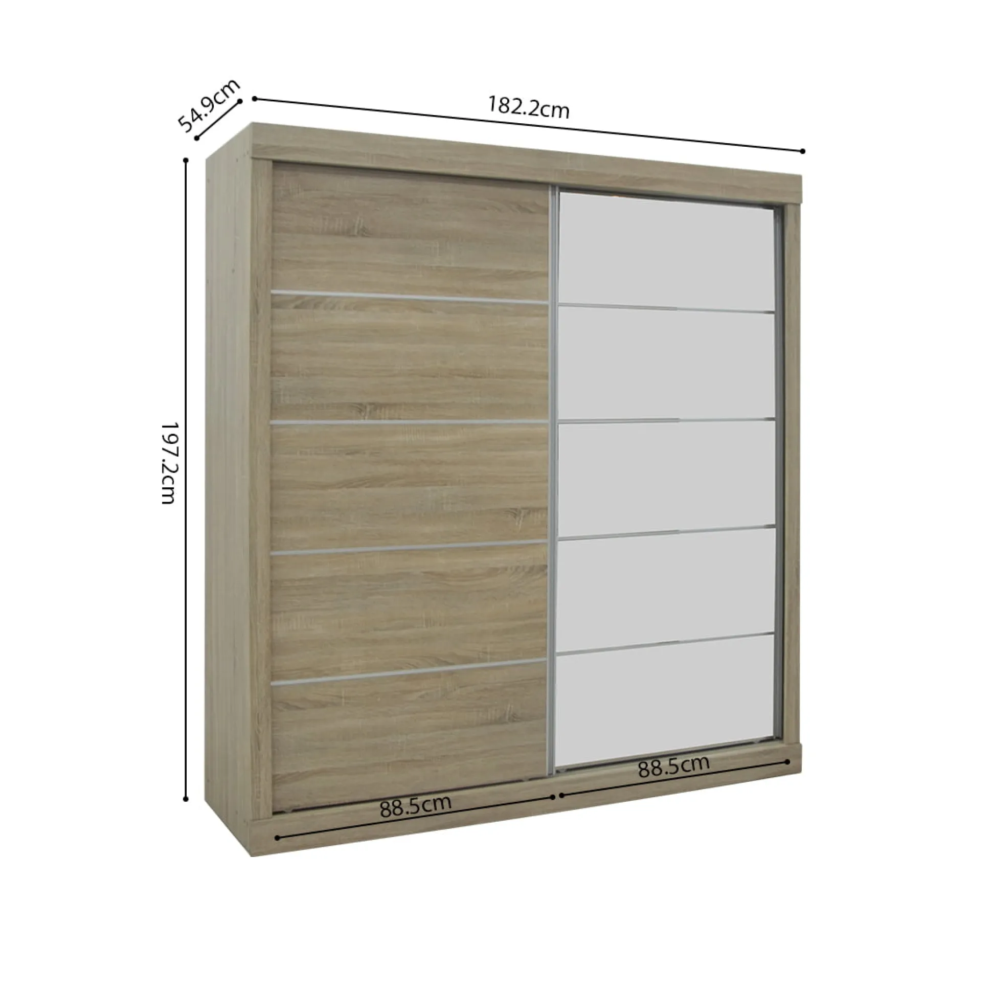 De Schuifdeurkast Graham Sonoma – Spiegel voegt de perfecte combinatie van functionaliteit en stijl toe aan je slaapkamer. Met een breedte van 182,5 cm, een hoogte van 197,5 cm en een diepte van 52,5 cm, biedt deze kast voldoende opbergruimte voor al je kleding en accessoires. Achter de linkerdeur van de kast vind je een handige indeling met een legplank en een kledingroede, ideaal voor het netjes opbergen van je kleding, zoals jurken, overhemden en jassen. Er is zelfs ruimte onderin voor bijvoorbeeld je schoenen.