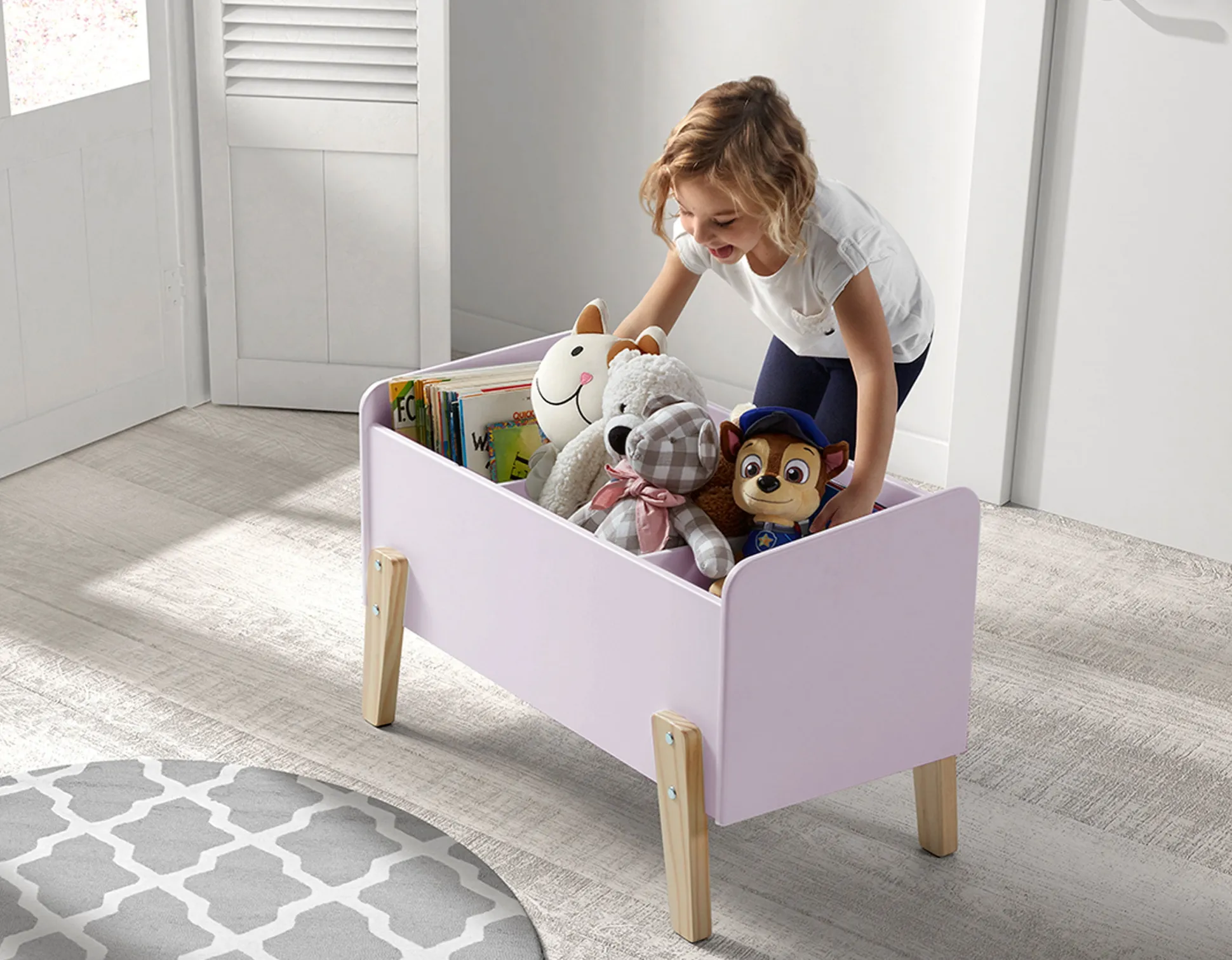 Deze speelgoedkoffer zorgt ervoor, dat de kamer steeds opgeruimd zal zijn. Speelgoed, boeken en andere leuke dingetjes zullen er ordelijk in worden opgeborgen. De koffer is vervaardigd uit hoogwaardig oudroze gelakt MDF met massief grenen, schuin ingezette poten.