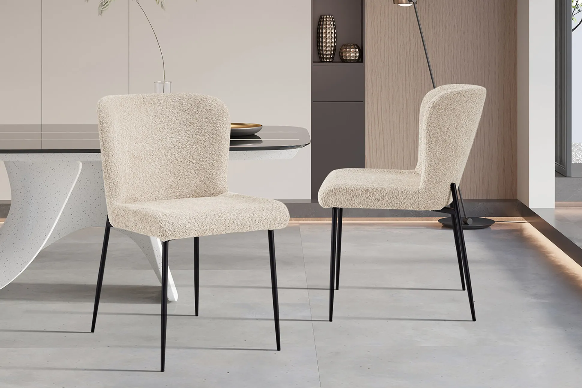Deze trendy eetkamerstoel heeft metalen ronde zwarte poten en staat stevig op de grond. De stoel heeft een goed zitcomfort en is voorzien van een mooie Bouclé stoffering. Bouclé is een stof dat bestaat uit geweven patronen, draden en lussen van verschillende stoffen, hierdoor ontstaat een grovere structuur welke zacht aanvoelt. Verkrijgbaar in verschillende moderne kleuren waardoor deze gemakkelijk in je interieur plaats neemt. De stoel heeft een zithoogte van 49,5 centimeter en een zitdiepte van 45 centimeter.