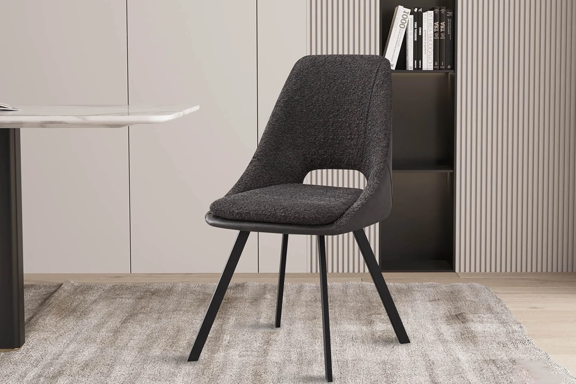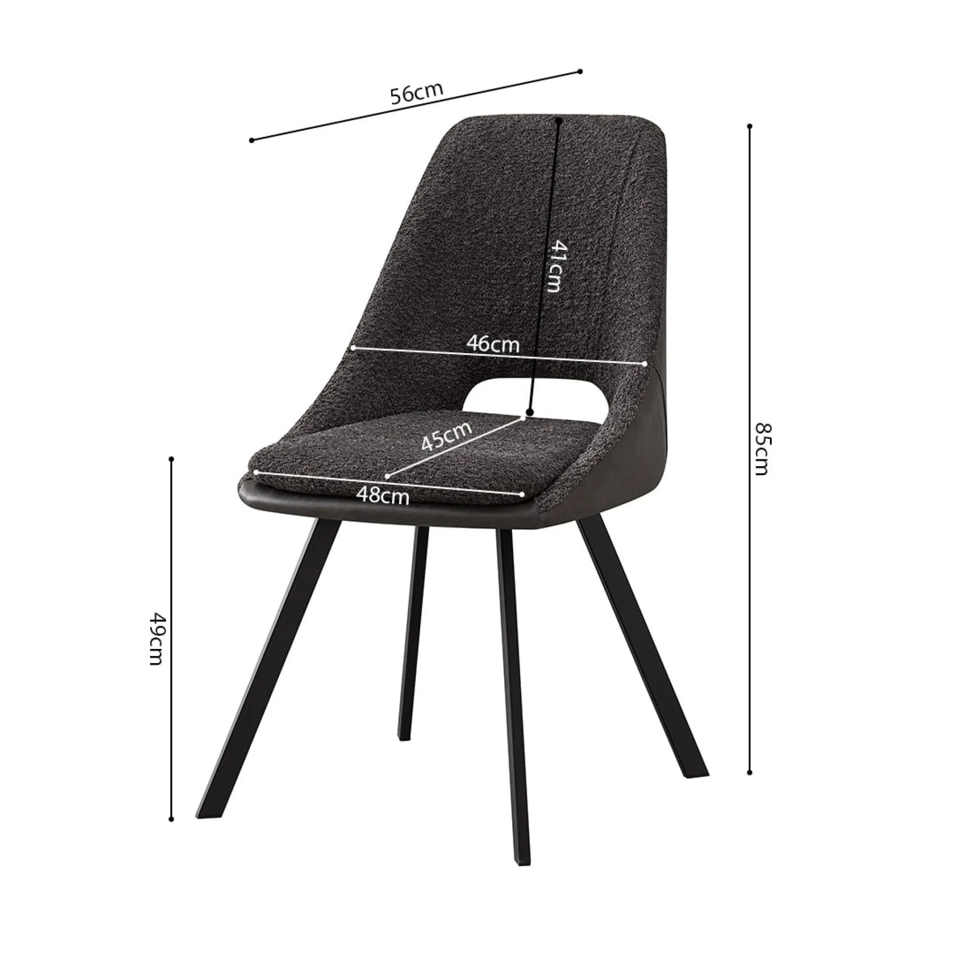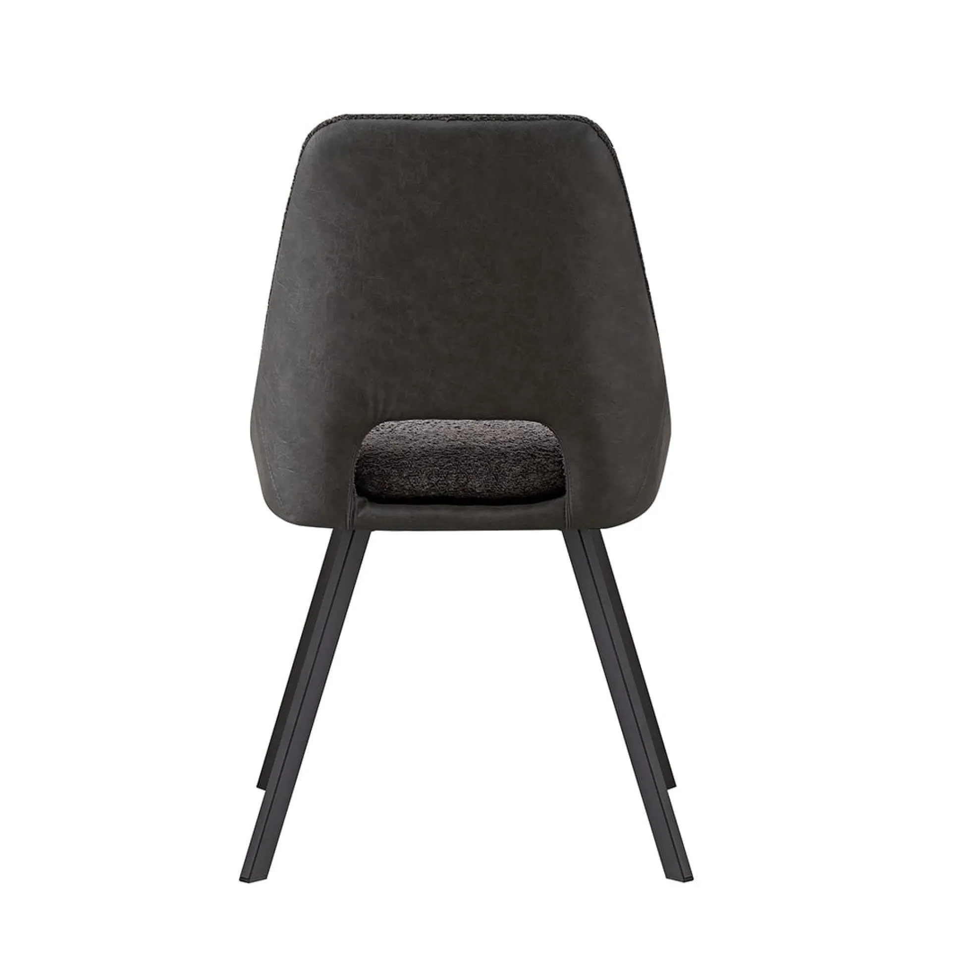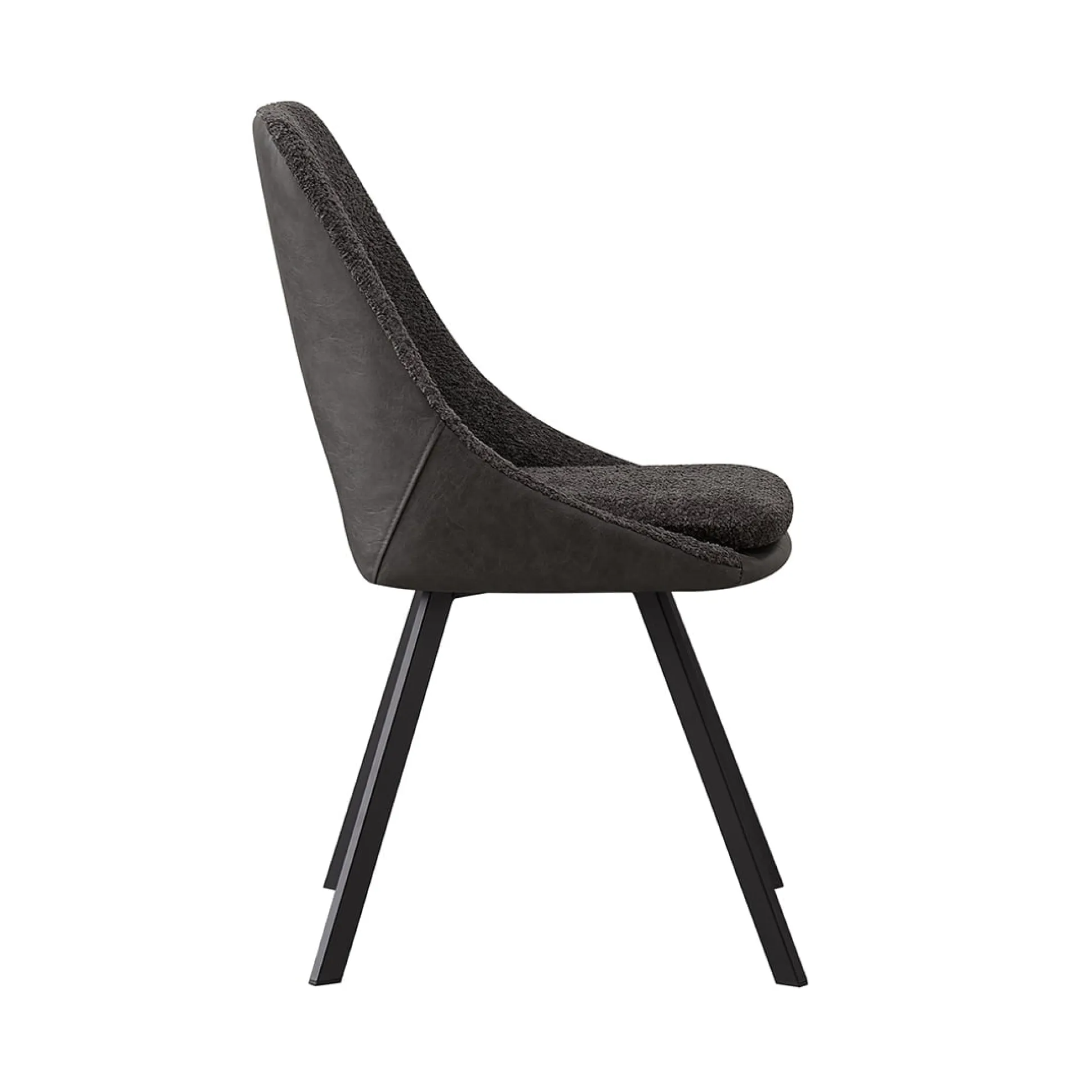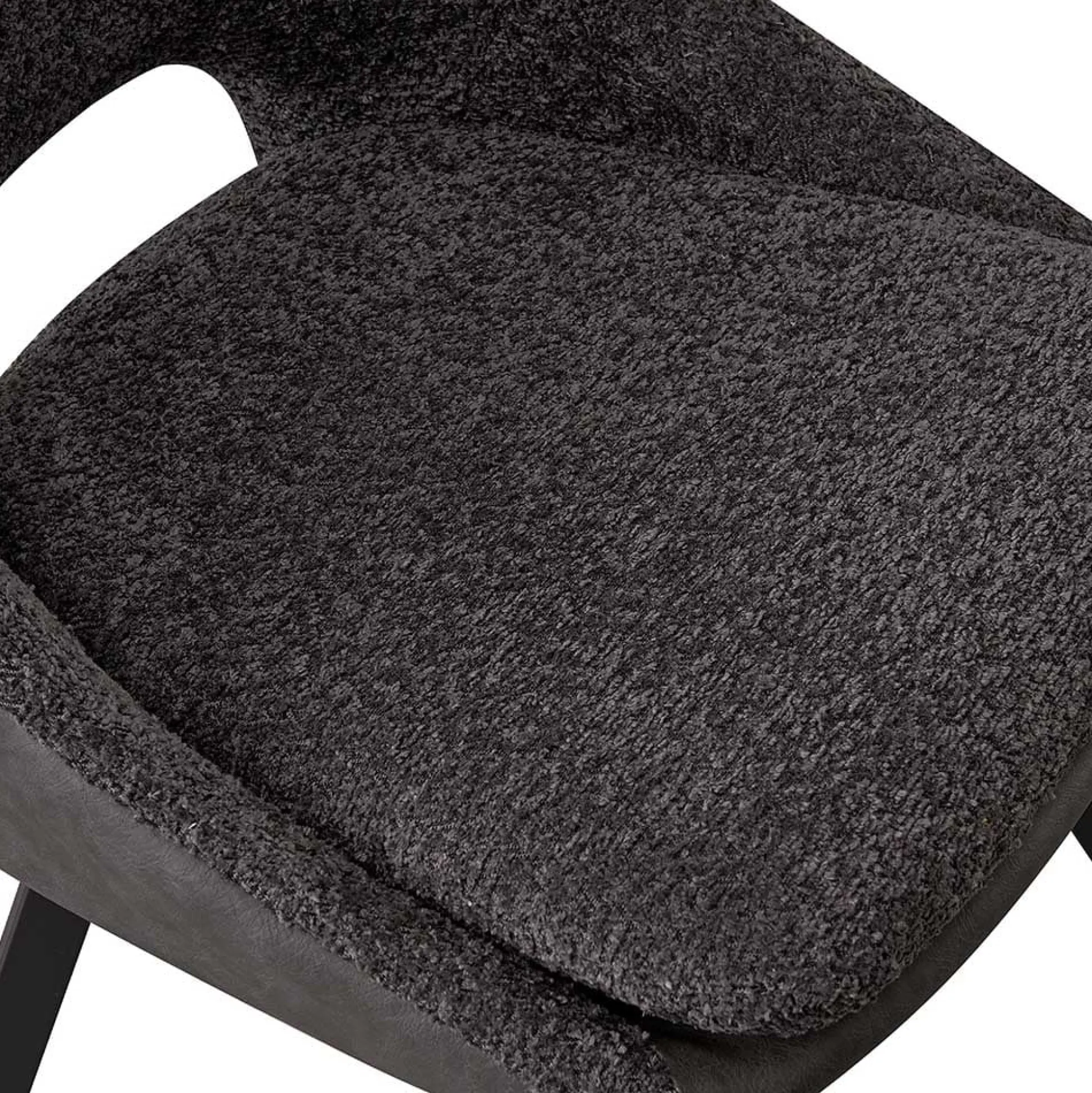 Deze trendy eetkamerstoel heeft metalen rechthoekige zwarte poten en staat stevig op de grond. De stoel heeft een goed zitcomfort, het zitvlakte is voorzien van een mooie Bouclé stoffering, de rugleuning is uitgevoerd in kunstleder. Bouclé is een stof dat bestaat uit geweven patronen, draden en lussen van verschillende stoffen, hierdoor ontstaat een grovere structuur welke zacht aanvoelt. Verkrijgbaar in verschillende moderne kleuren waardoor deze gemakkelijk in je interieur plaats neemt. De stoel heeft een zithoogte van 49 centimeter en een zitdiepte van 45 centimeter.