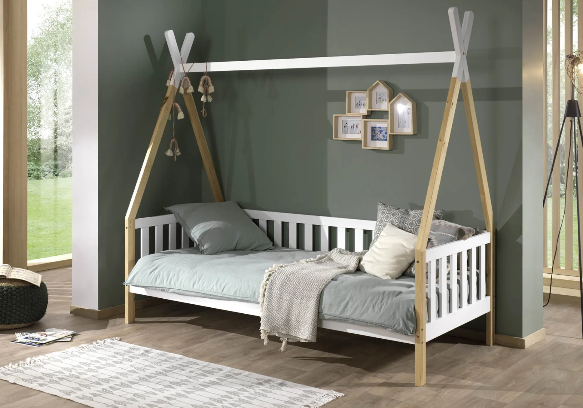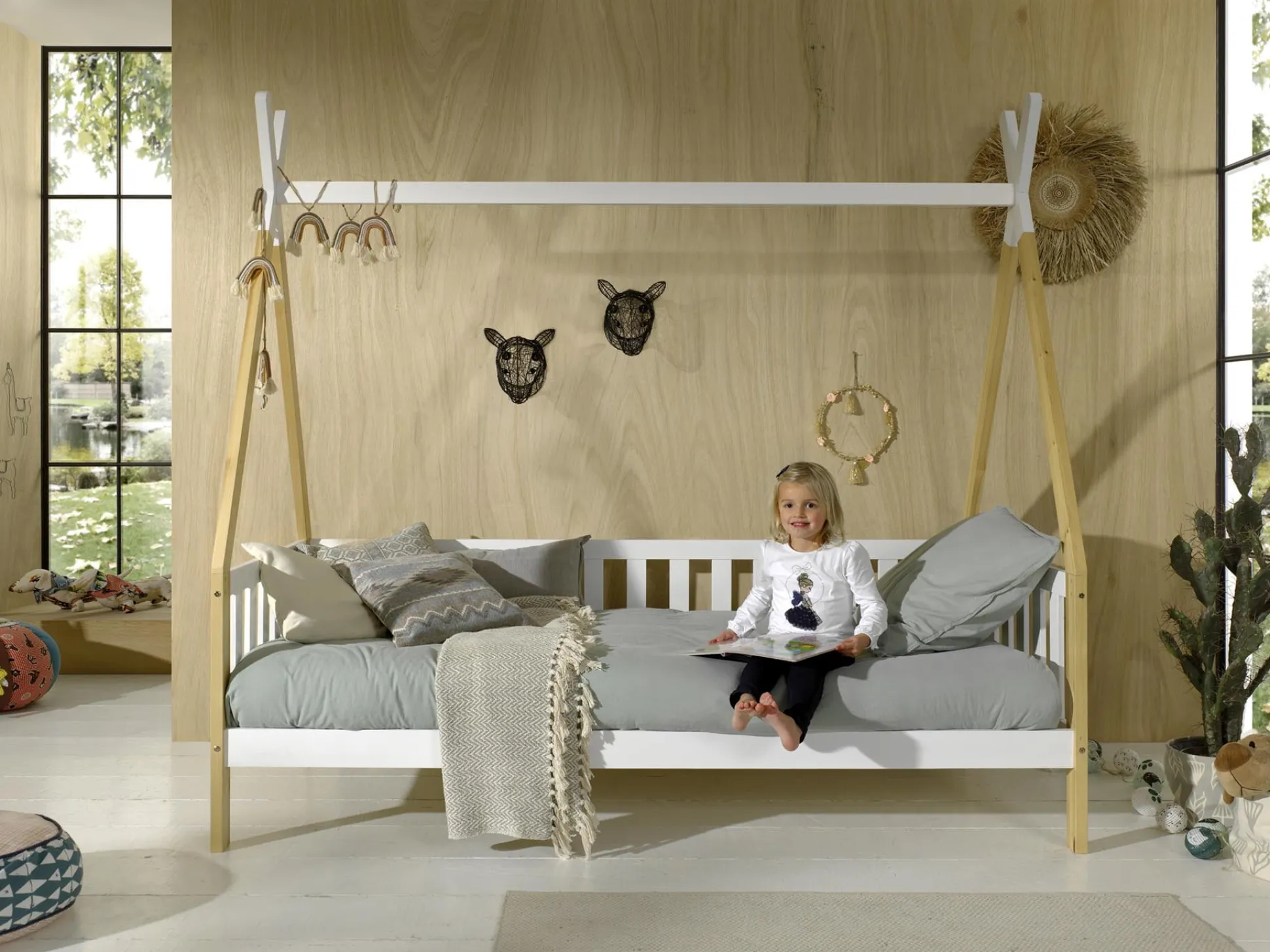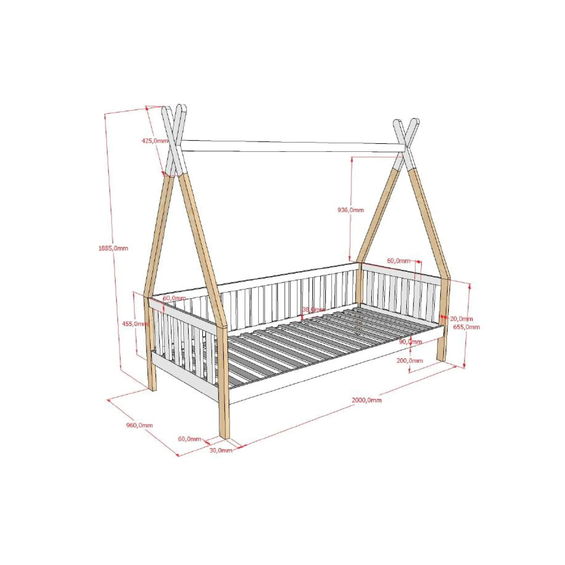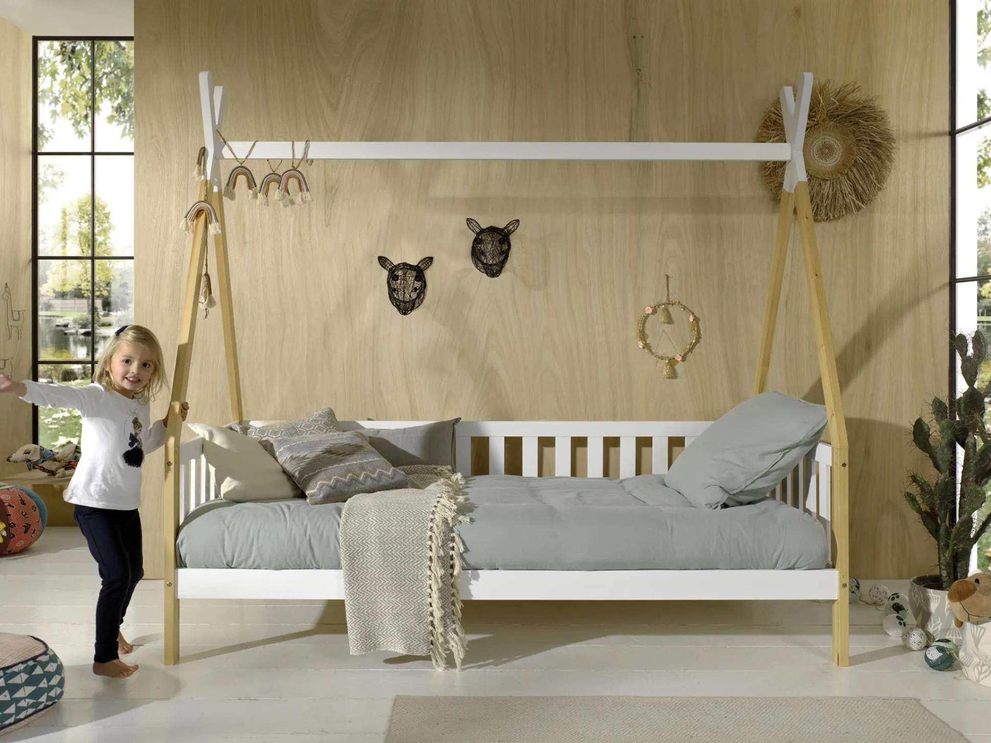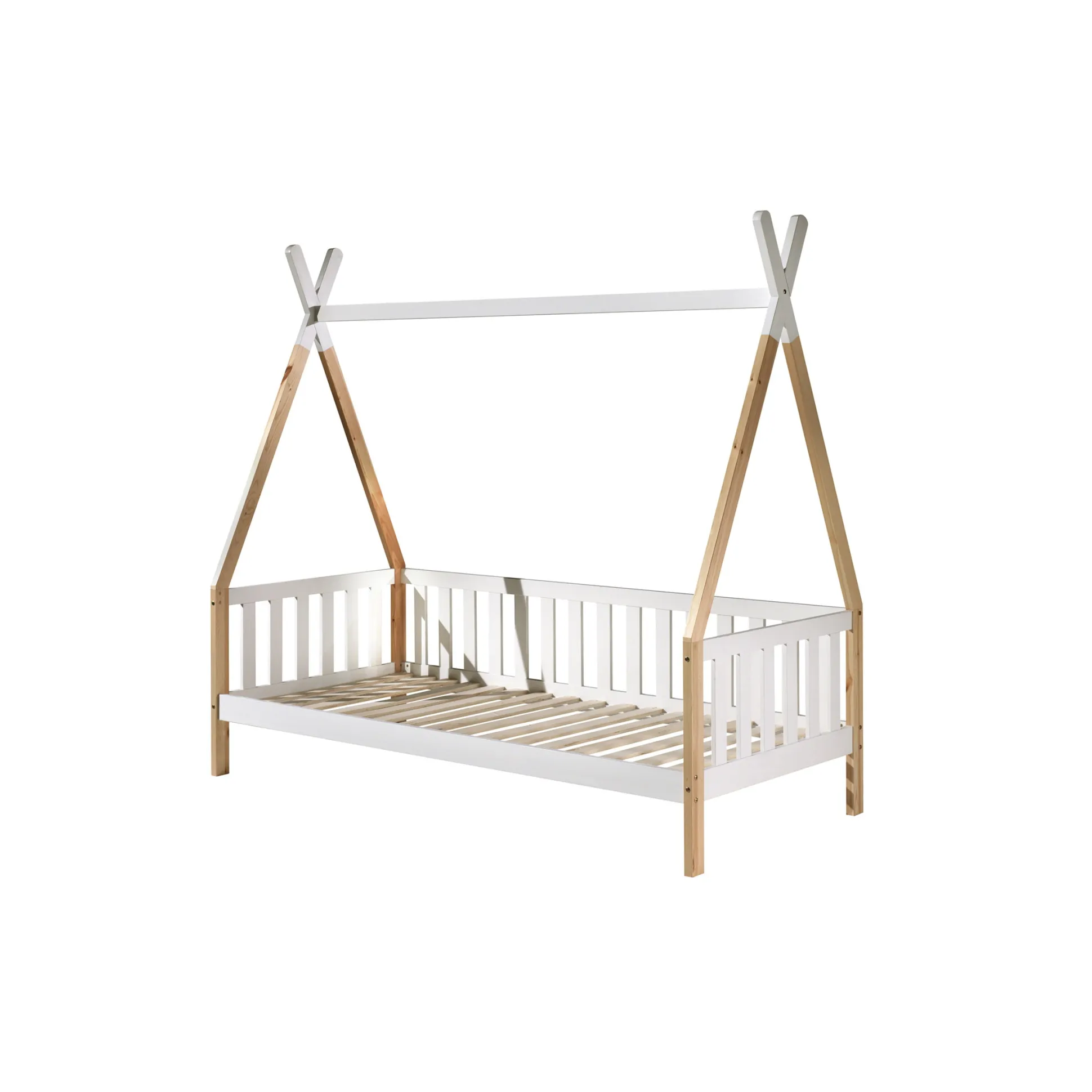 Met dit prachtige tipibed is je kind helemaal gelukkig! Door het bed omgekeerd tegen de muur te zetten ben je in het begin direct van een uitvalbeveiliging voorzien. Door het bed te versieren met kleurrijke kussens, dekentjes en andere attributen maak je het al gauw gezellig. Het bed is vervaardigd uit Scandinavisch grenen en afgewerkt met een sterke lak. Het bed wordt geleverd inclusief lattenbodem. Maximaal toelaatbare gewicht per slaapplaats is 75KG. Onder het bed voldoende opbergruimte voor speelgoed of voor het plaatsen van een rolbed. Gemakkelijk te monteren door middel van bijgeleverde montagehandleiding.
