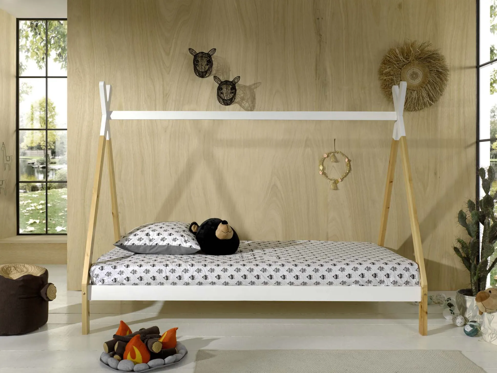 Met dit prachtige tipibed is je kind helemaal gelukkig! Door het bed te versieren met kleurrijke kussens, dekentjes en andere attributen maak je het al gauw gezellig. Het bed is vervaardigd uit Scandinavisch grenen en afgewerkt met een sterke lak. Het bed wordt geleverd inclusief lattenbodem. Maximaal toelaatbare gewicht per slaapplaats is 75KG. Onder het bed voldoende opbergruimte voor speelgoed of voor het plaatsen van een rolbed. Gemakkelijk te monteren door middel van bijgeleverde montagehandleiding.