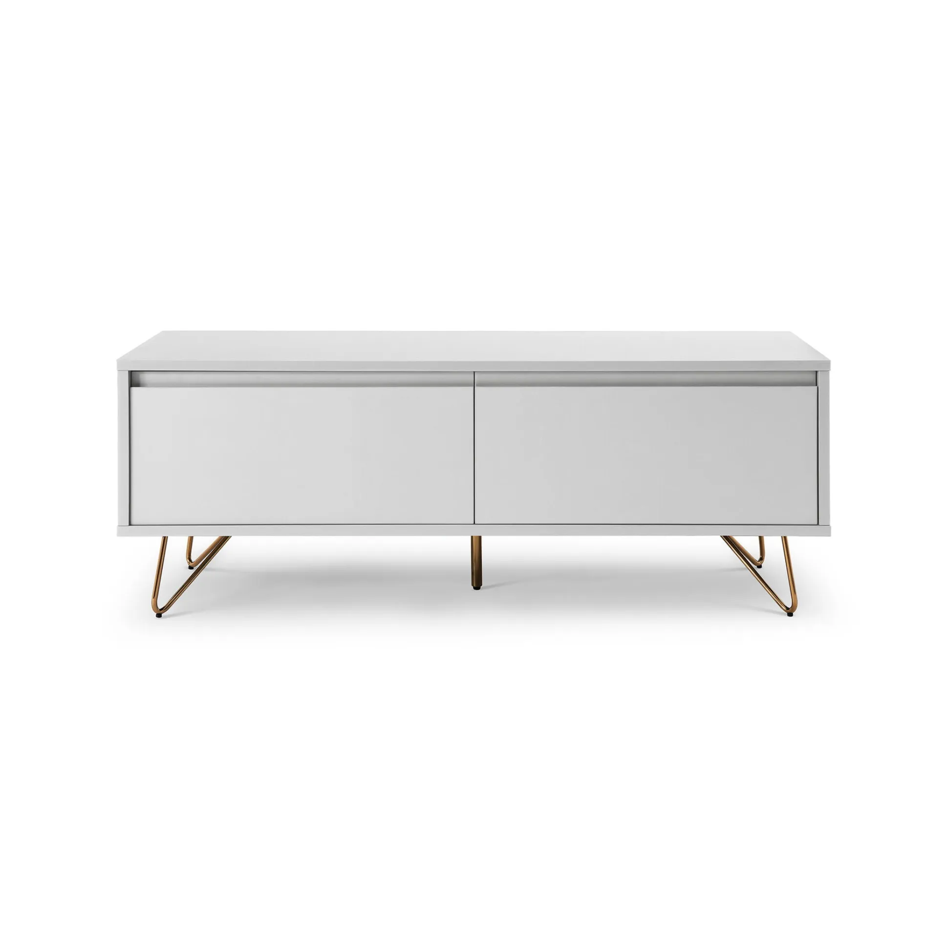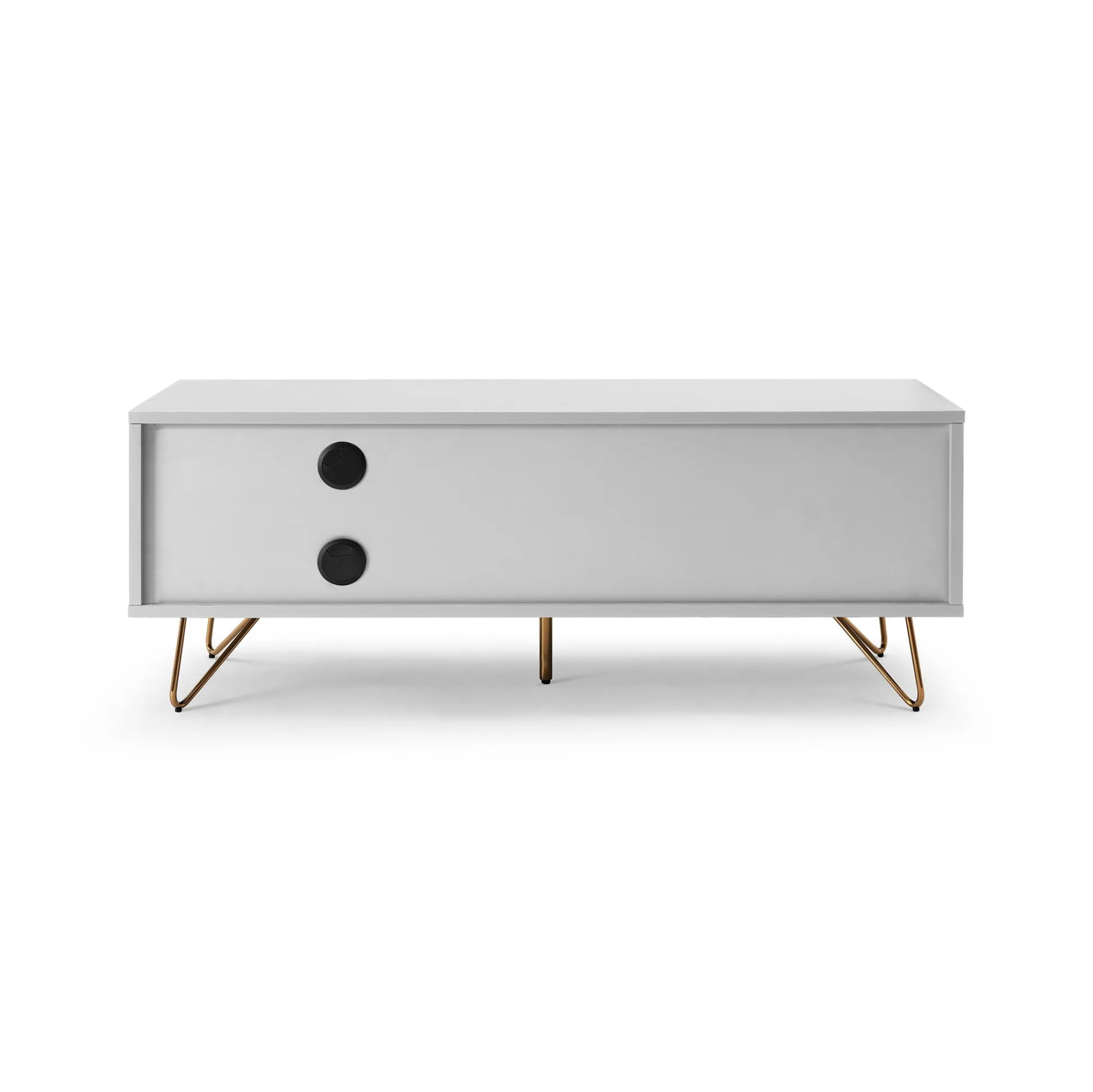 Dit stijlvolle tv-meubel biedt voldoende ruimte voor al je spullen achter de deur en klep, de legplank achter de klep is verwijderbaar. Het tv-meubel is vervaardigd uit een stevige MDF en heeft een matte afwerking. Door de combinatie met zijn gouden metalen poten een echte eyecatcher in je interieur. Gemakkelijk te monteren doormiddel van bijgeleverde montagehandleiding. Bekijk ook de andere elementen uit deze serie.