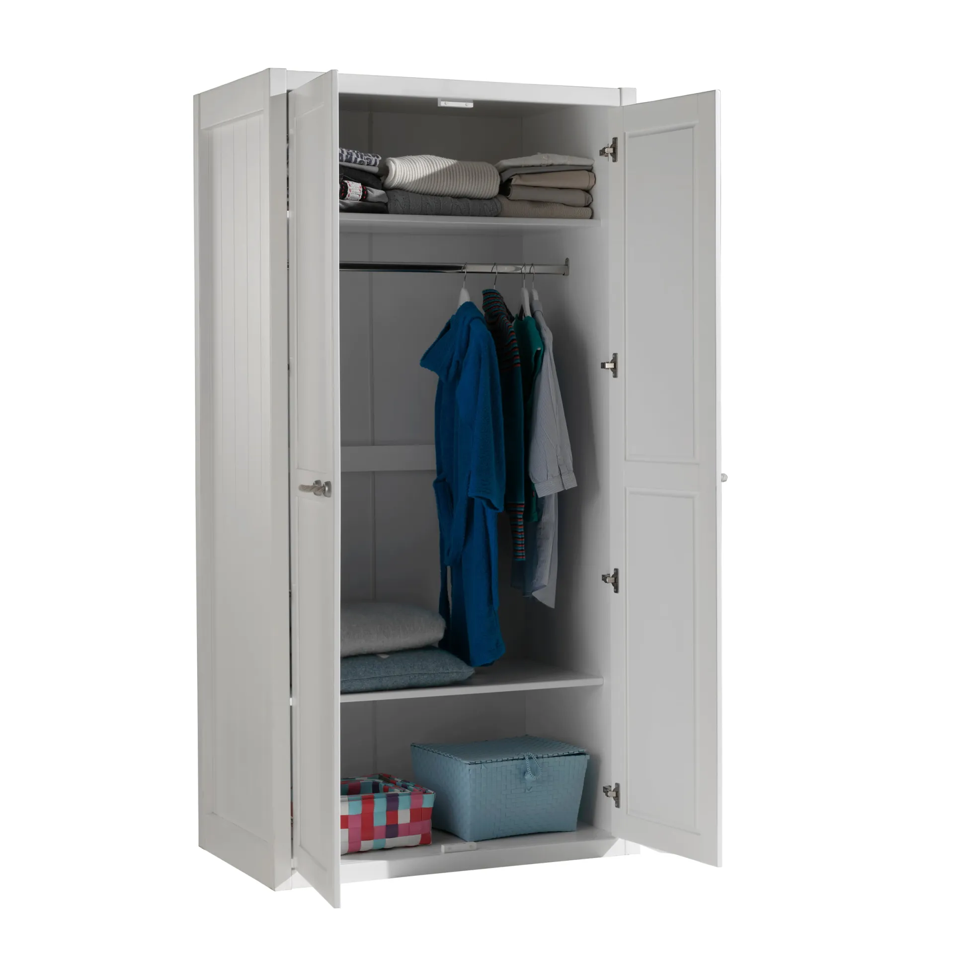 Deze 2-deurs-linnenkast heeft achter de 2 deuren met touwgrepen over de volle breedte boven een legpank, waaronder een kledingroede en daaronder beneden nog een legplank. Dit schept een zee aan bergruimte. De deuren en zijkanten van de kast zijn vervaardigd uit hoogwaardig MDF met verticale infrezingen, wat de kast een aparte look geeft.