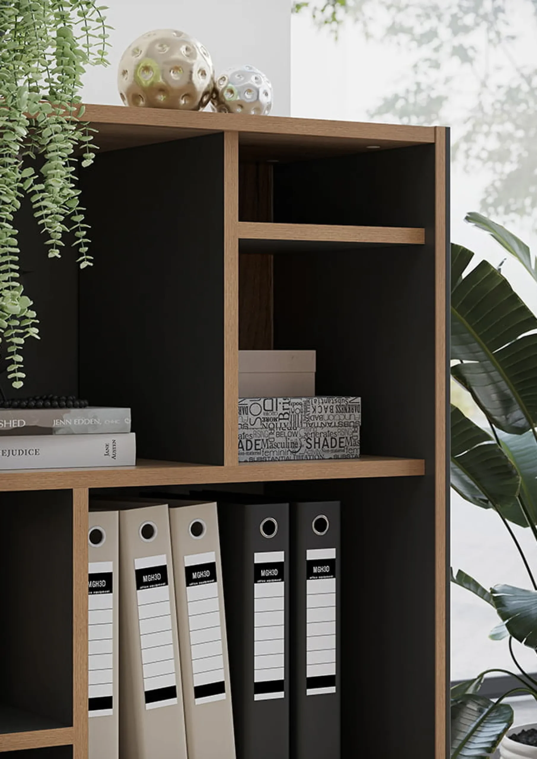 Voeg eenvoudig extra opbergruimte toe aan je kantoorkast met de Vakkenverdeling Kantoorkast Pytheas 5 stuks Grafiet Eiken. Deze set van 5 vakken, elk belastbaar tot 5 kg. Ze zijn uitgevoerd in een stijlvolle combinatie van antraciet en eiken.