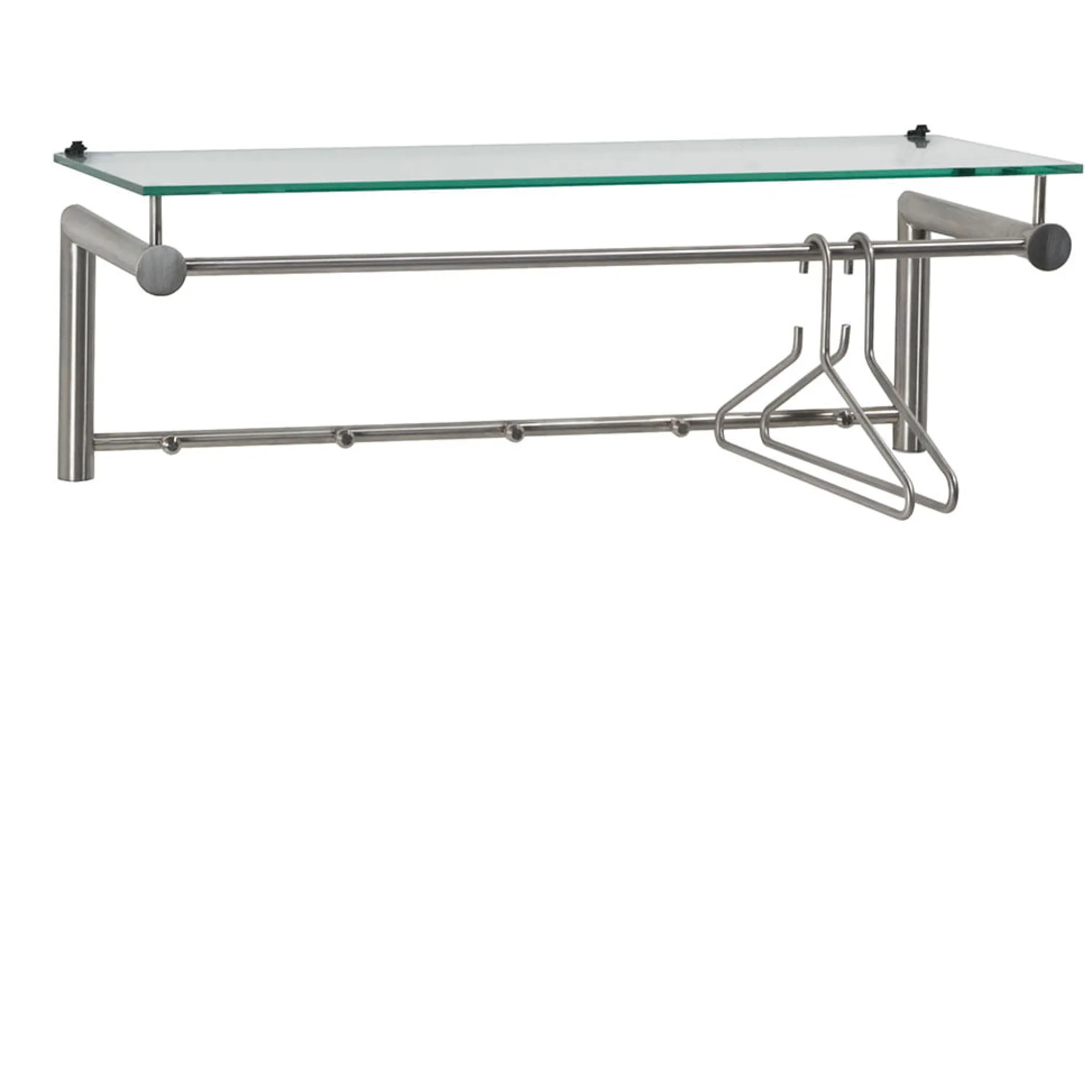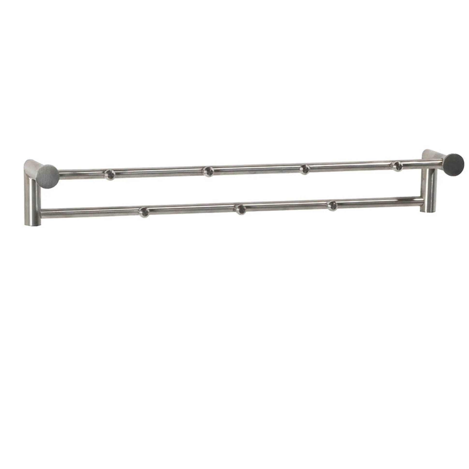 Aan de dunnere buizen bovenin kunnen kapstokhaken hangen. Onderaan tussen de 2 haakse buizen is nog een stang met 5 knophaakjes. Volledig uitgevoerd in hoogwaardig RVS. Daardoor krijgt deze kapstok een prachtige en duurzame uitstraling.
