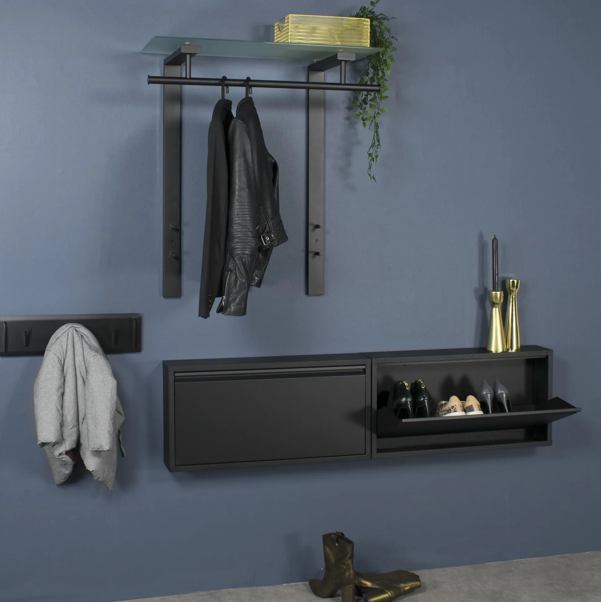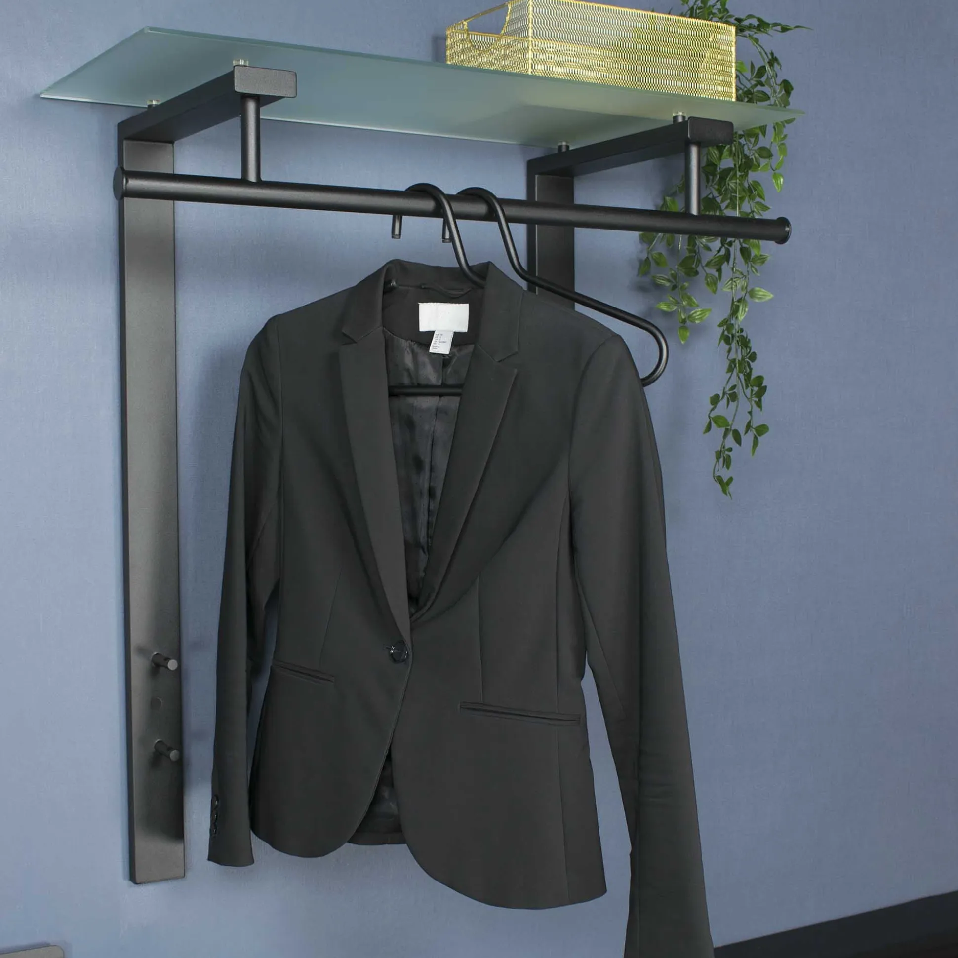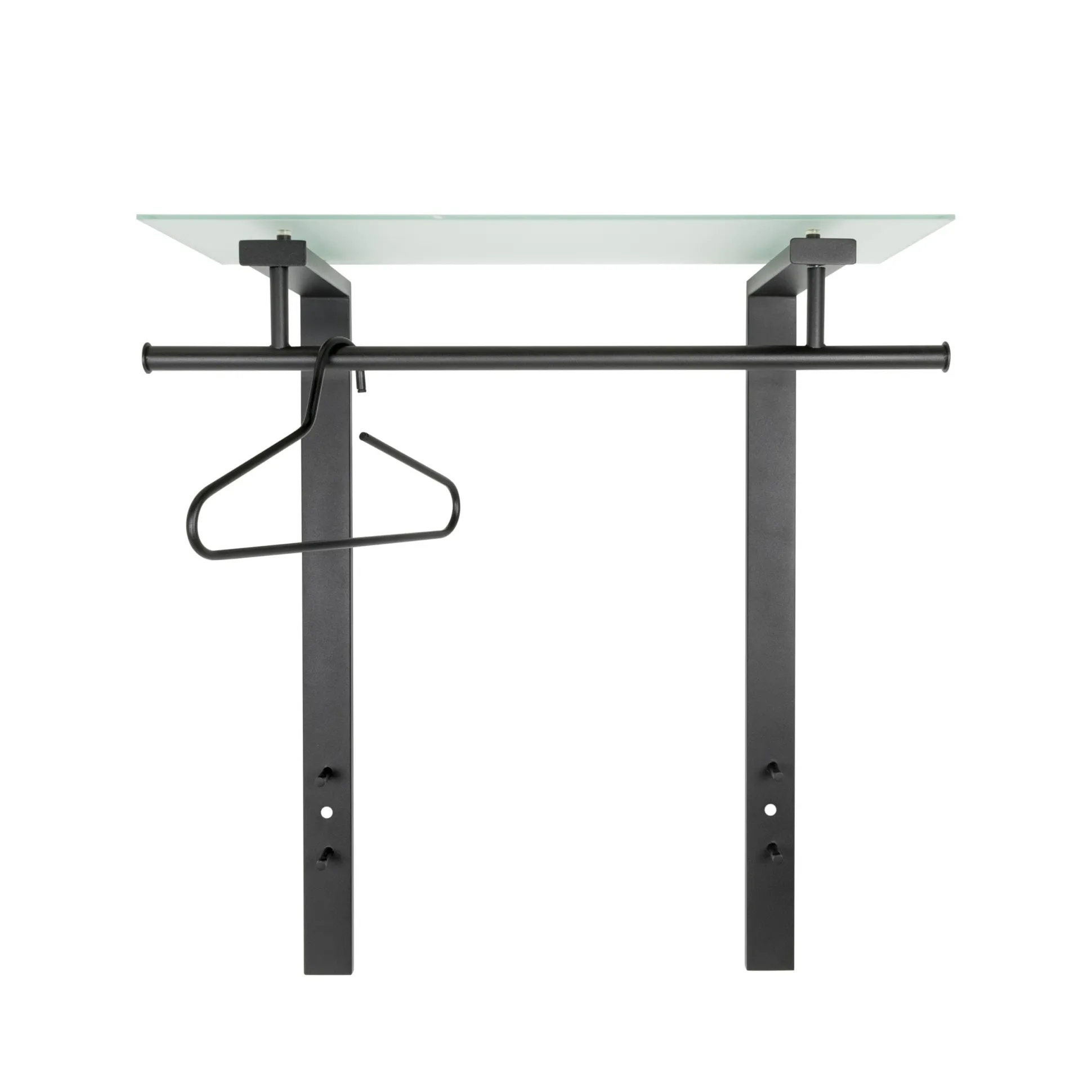 Moderne handige kapstok met bovenaan ruimte voor de kledinghaken. Bovenop een melkglazen blad met ruimte voor diverse kledingstukken. Exclusief de afgebeelde kledinghanger.