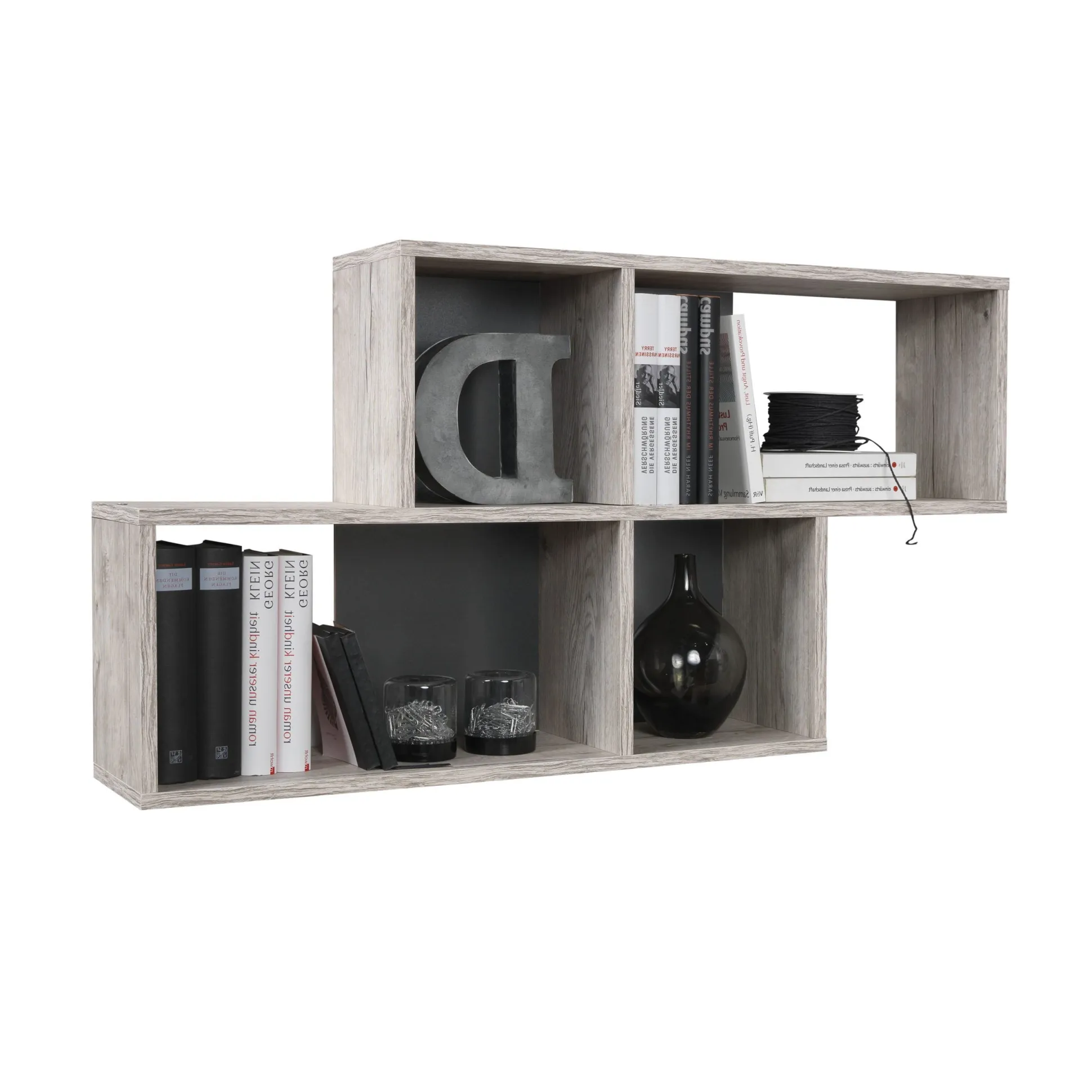 Dit open design wandrek van 100cm breed heeft 4 open vakken met een antraciete achterwand. Het is vervaardigd uit stevige milieuvriendelijke meubelplaat met een mooi melamine afwerking. Geschikt voor je lectuur, een vaasje, een potje etc.