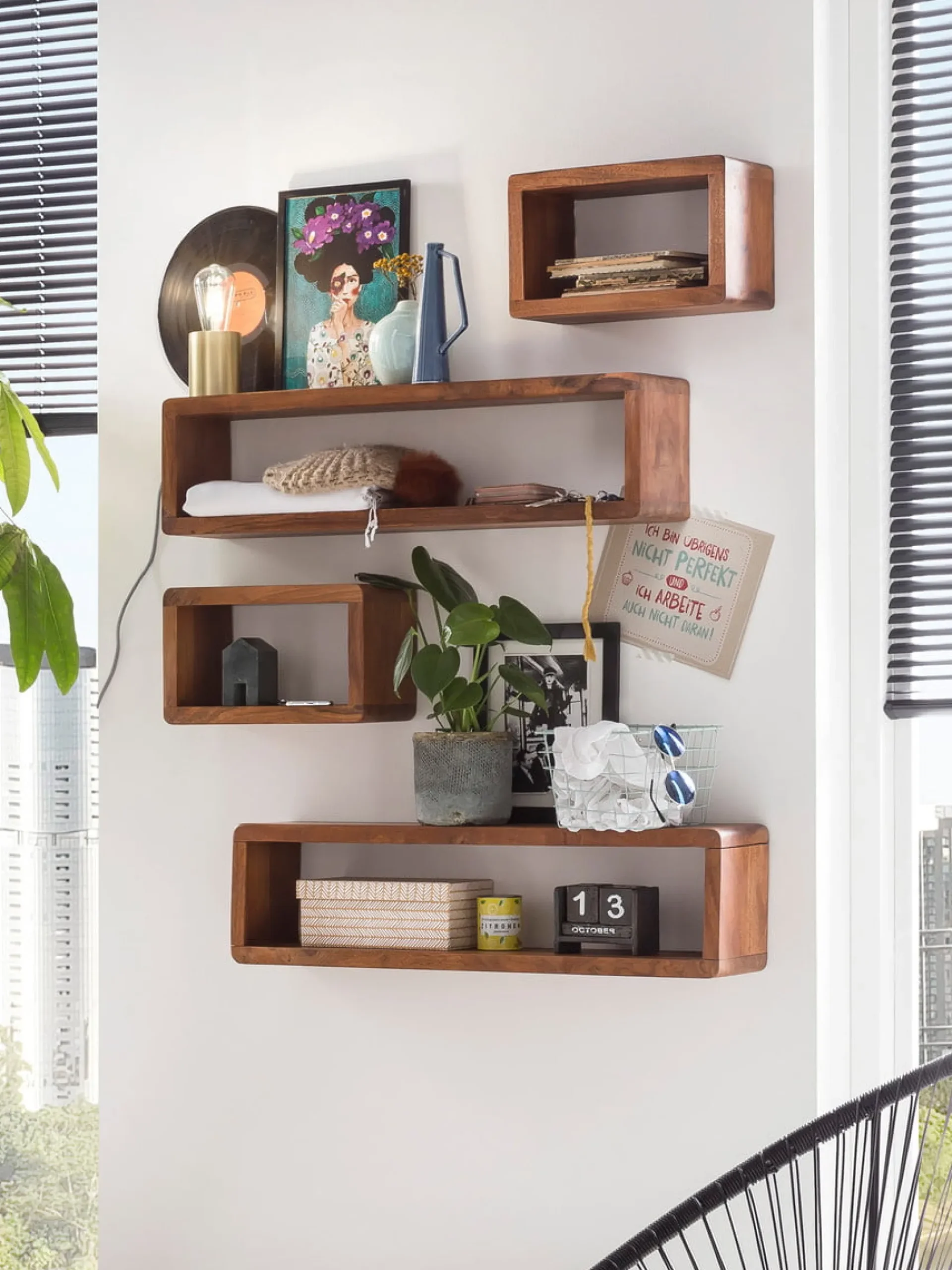 Geef je favoriete decoratiestukken een stijlvolle plek met dit robuuste wandrek. Het is gemaakt van massief mango hout en heeft een open ontwerp, ideaal voor diverse ruimtes.