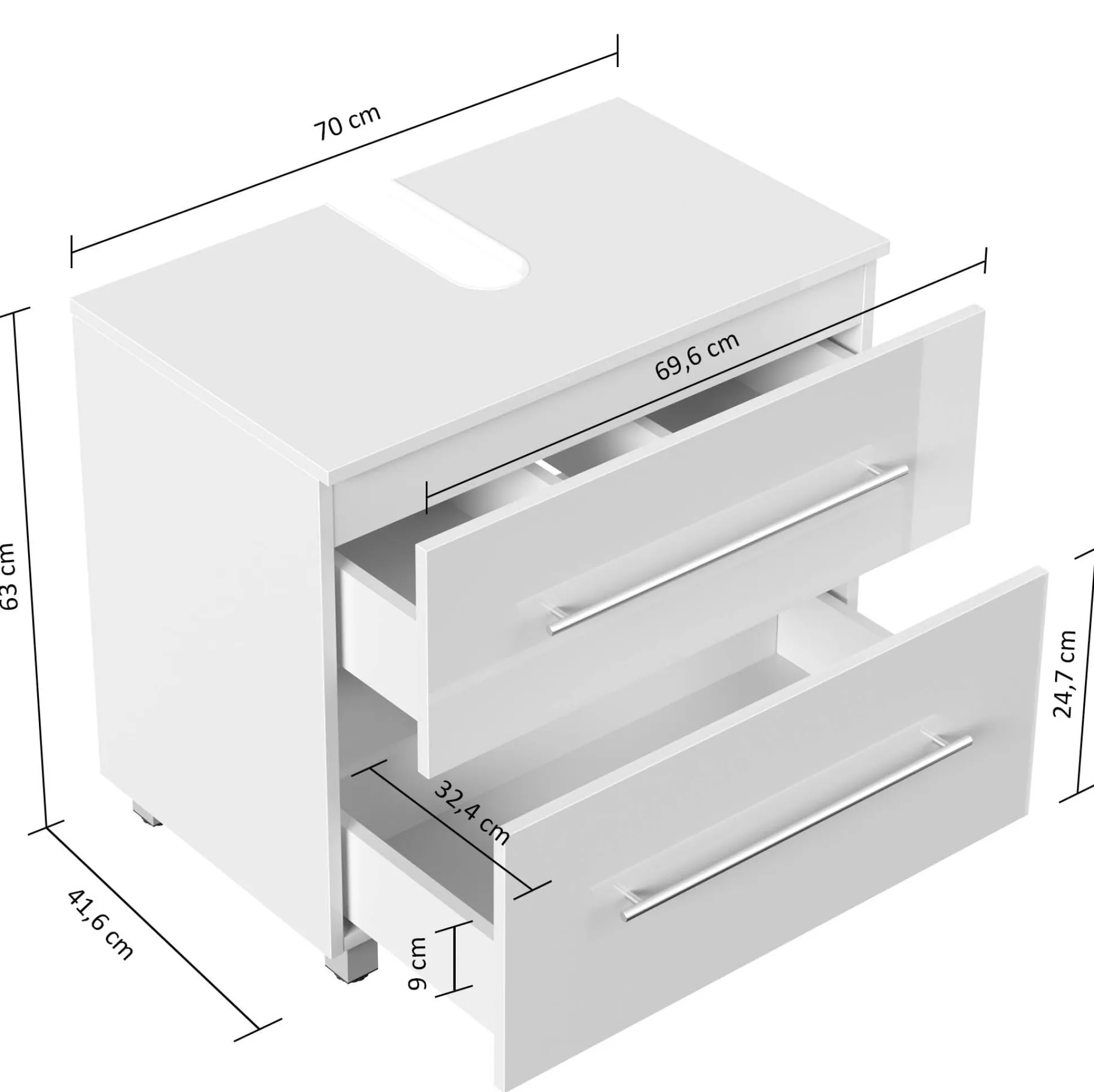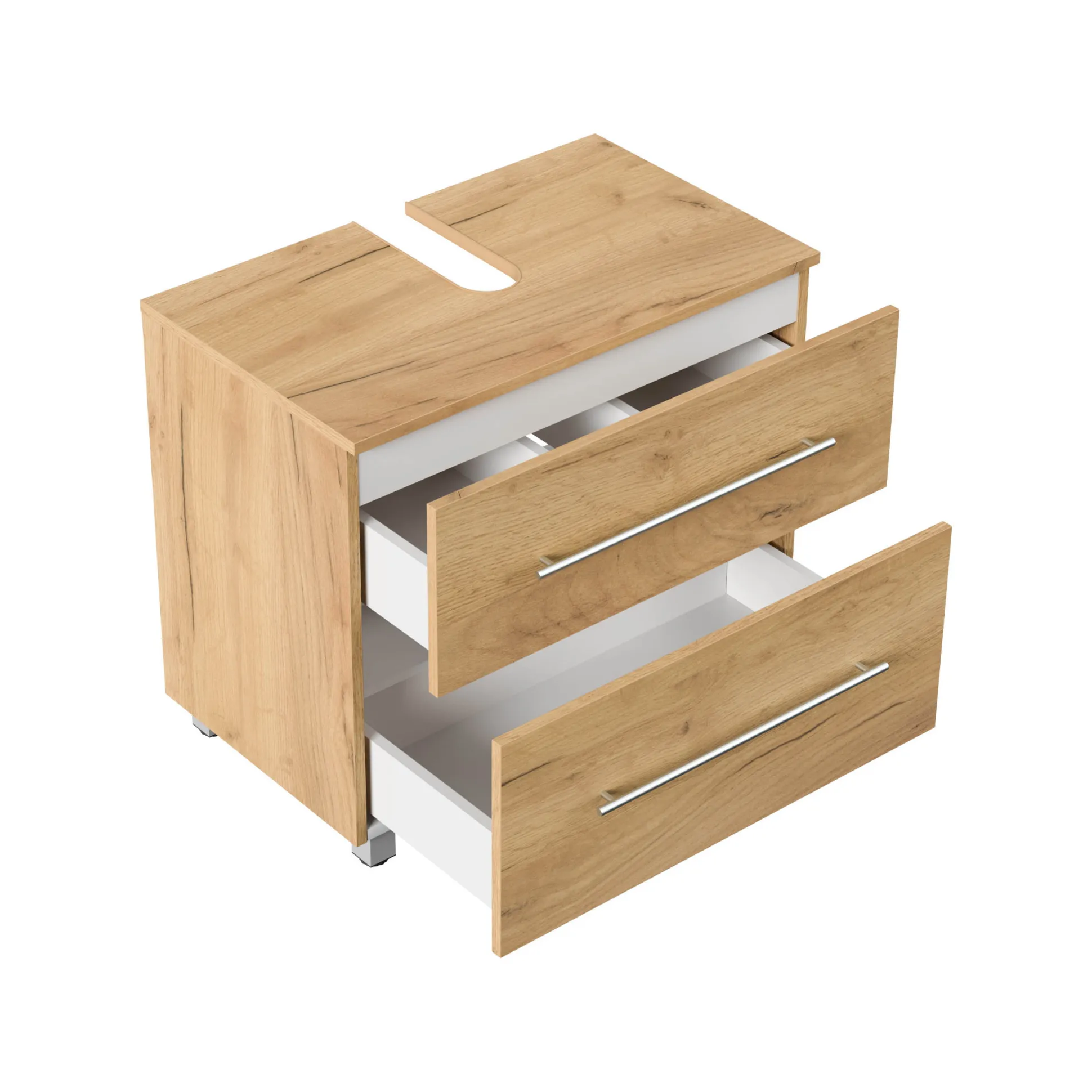 De wastafelkast Glasgow Eiken 70 cm brengt een warme, natuurlijke sfeer in uw badkamer. Ontworpen in Duitsland en vervaardigd uit hoogwaardig spaanplaat, is deze kast afgewerkt in een realistische eiken Gold-look die zorgt voor een authentieke houtuitstraling. Met afmetingen van 70 cm breed, 63 cm hoog en 41,6 cm diep, en met deuren en laden voorzien van soft-close functies, is dit een ideale keuze voor een functionele en sfeervolle badkamer.