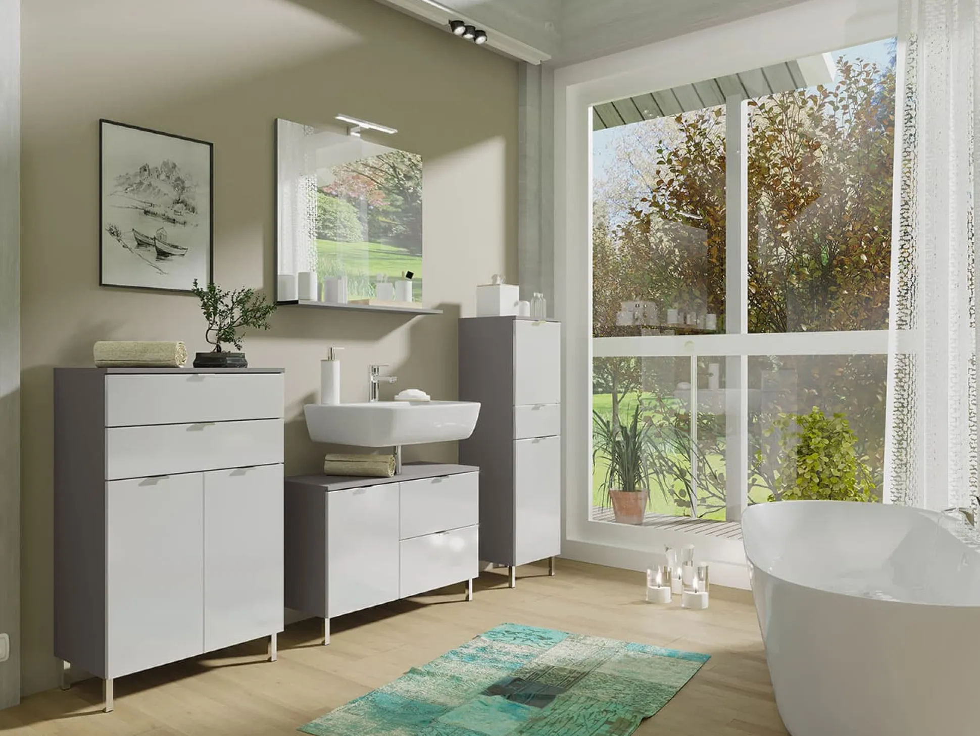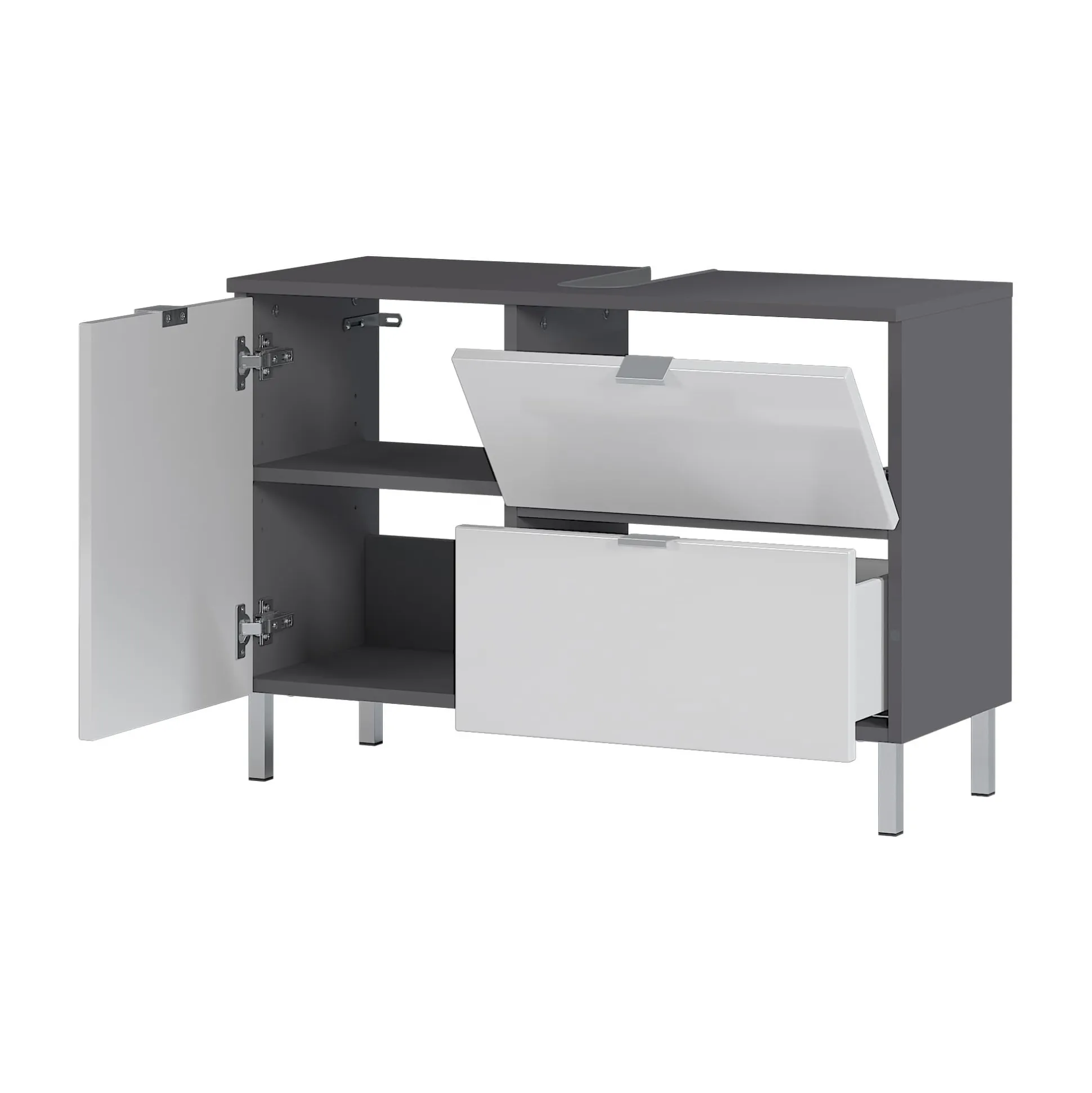Met deze stijlvolle wastafelkast geef je je badkamer snel een luxe uitstraling. De badkamerkast heeft een lade, een klep en een deur met daarachter een verstelbare legplank waardoor er voldoende ruimte is om al je spullen op te bergen. Allen voorzien van soft-close waardoor ze geruisloos sluiten. Het meubel is afgewerkt met een degelijke melamine waardoor deze goed schoon te maken is. Maak je badkamer compleet met de andere meubelen uit deze serie.