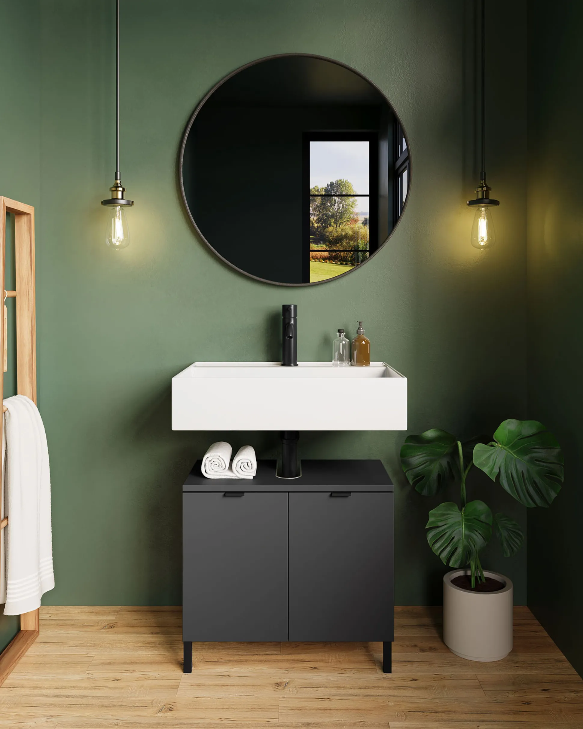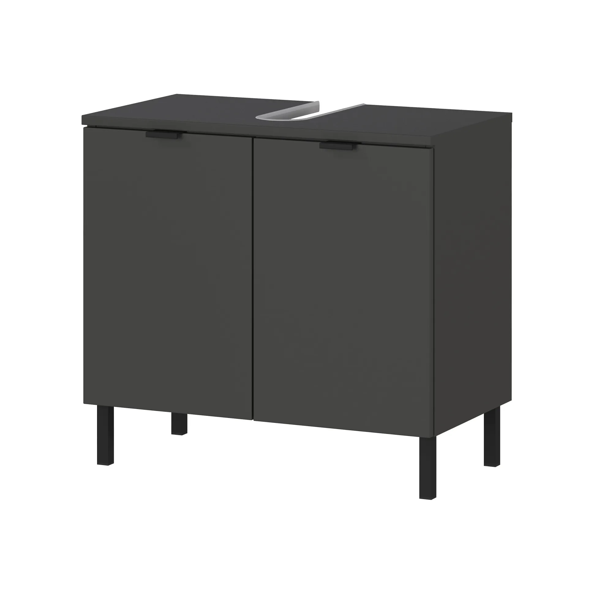 De wastafelkast Zadar Grafiet 60 cm is een stijlvolle en functionele toevoeging aan elke badkamer. Dit meubel is voorzien van twee deuren met een verstelbare plank erachter, belastbaar tot 10 kg. De bovenste plank heeft een uitsparing voor de sifon en kan tot 3 kg dragen, terwijl de onderste plank tot 10 kg belastbaar is. De kast staat op vier stevige, zwarte metalen poten en heeft metalen randgrepen in dezelfde afwerking. Dankzij de krasbestendige melamine coating en stootvaste randen blijft het meubel langdurig mooi, terwijl de geïntegreerde demping zorgt voor een zacht en geruisloos sluitmechanisme.