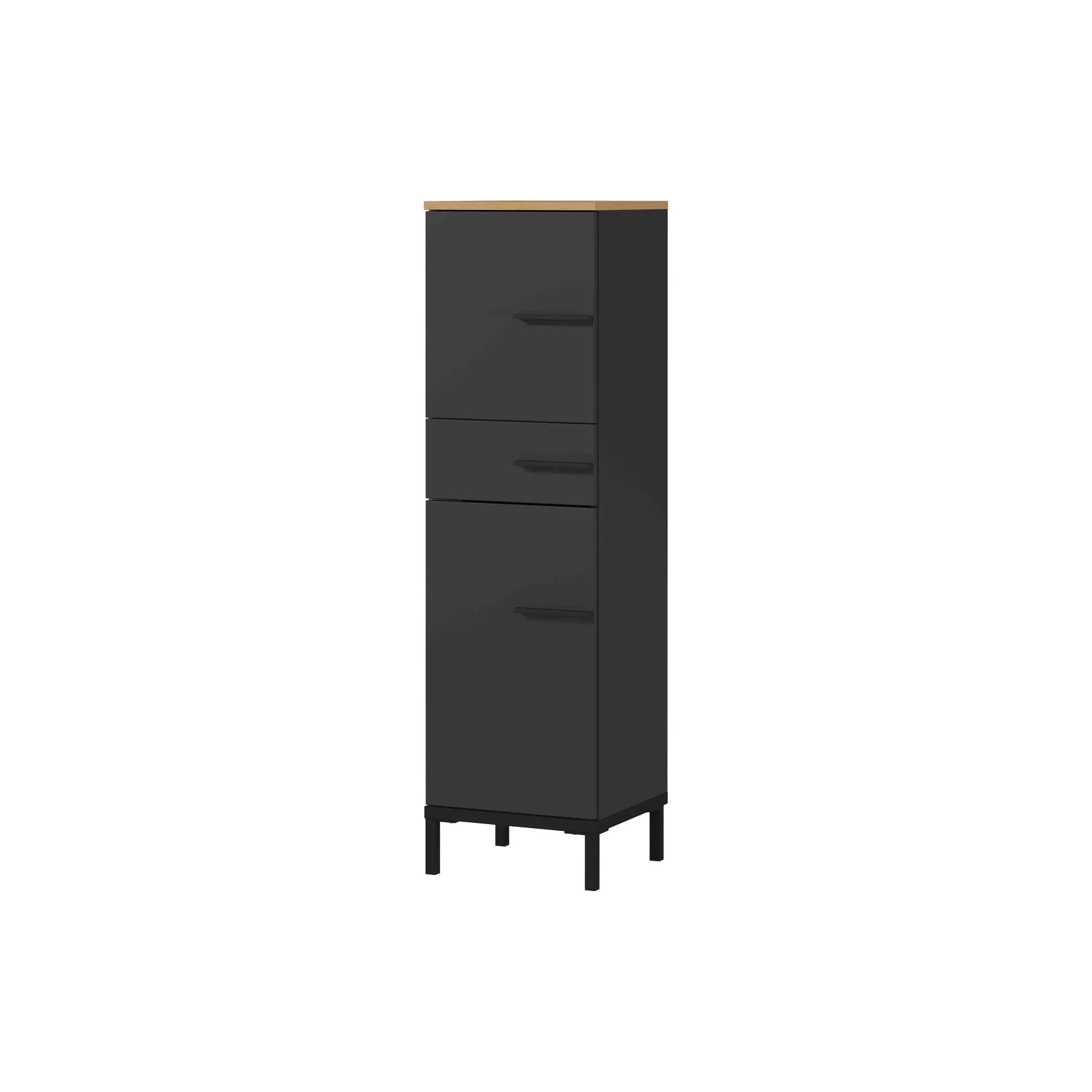 Deze stijlvolle badkamerkast vindt gemakkelijk zijn plaats. Voldoende opbergruimte achter de deuren op de 2 verstelbare legplanken. Zwart metalen handvatten en pootjes in combinatie met geruisloos sluitende deuren maken dit meubelstuk helemaal af. Geproduceerd in Duitsland, dit staat voor degelijke kwaliteit en een lange levensduur. Gemakkelijk te monteren doormiddel van de meegeleverde montagehandleiding. Bekijk ook de andere elementen uit deze badkamerserie!