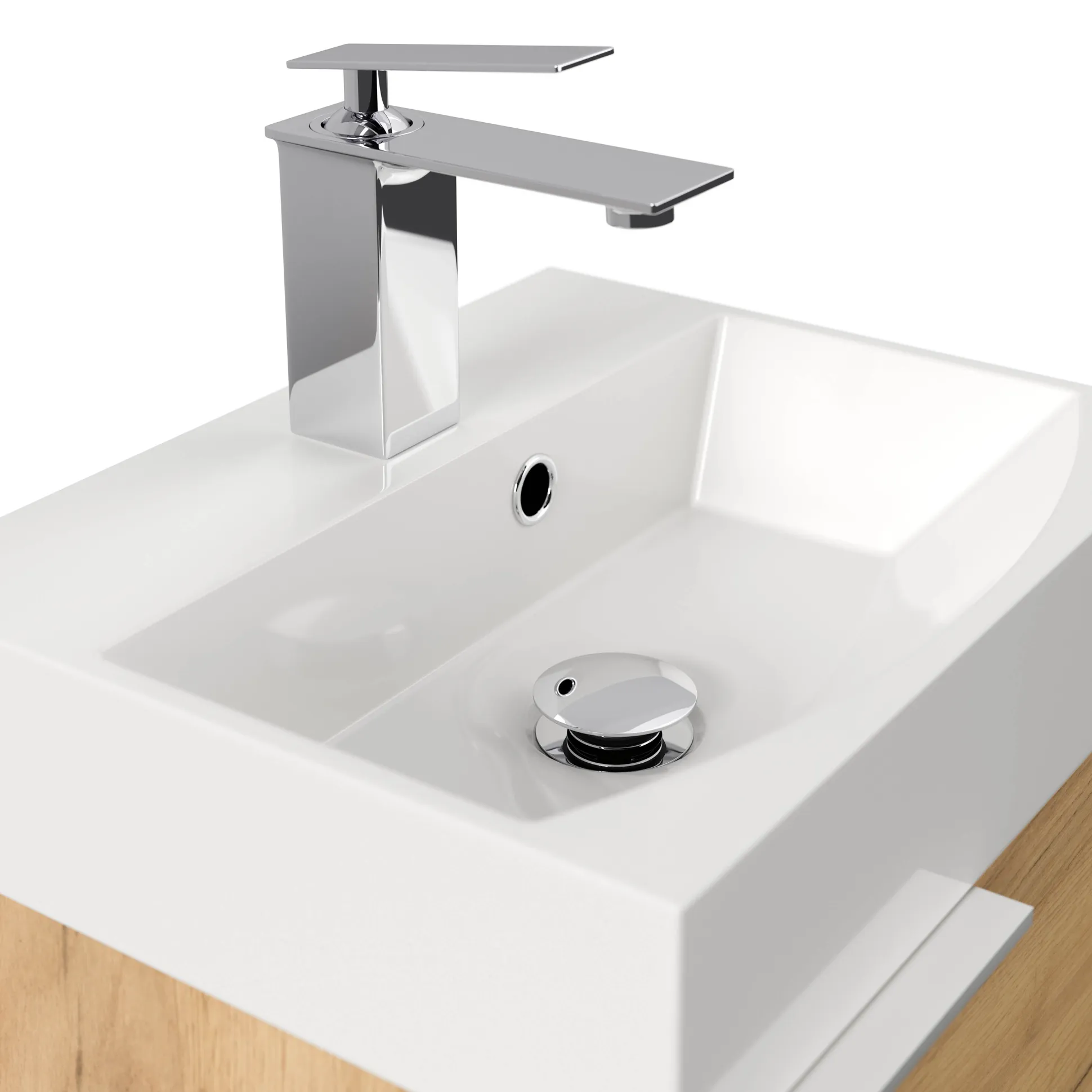 De wastafelkast wordt geleverd exclusief kraan, toevoerleidingen naar de kraan, afvoerplug en zwanenhals.