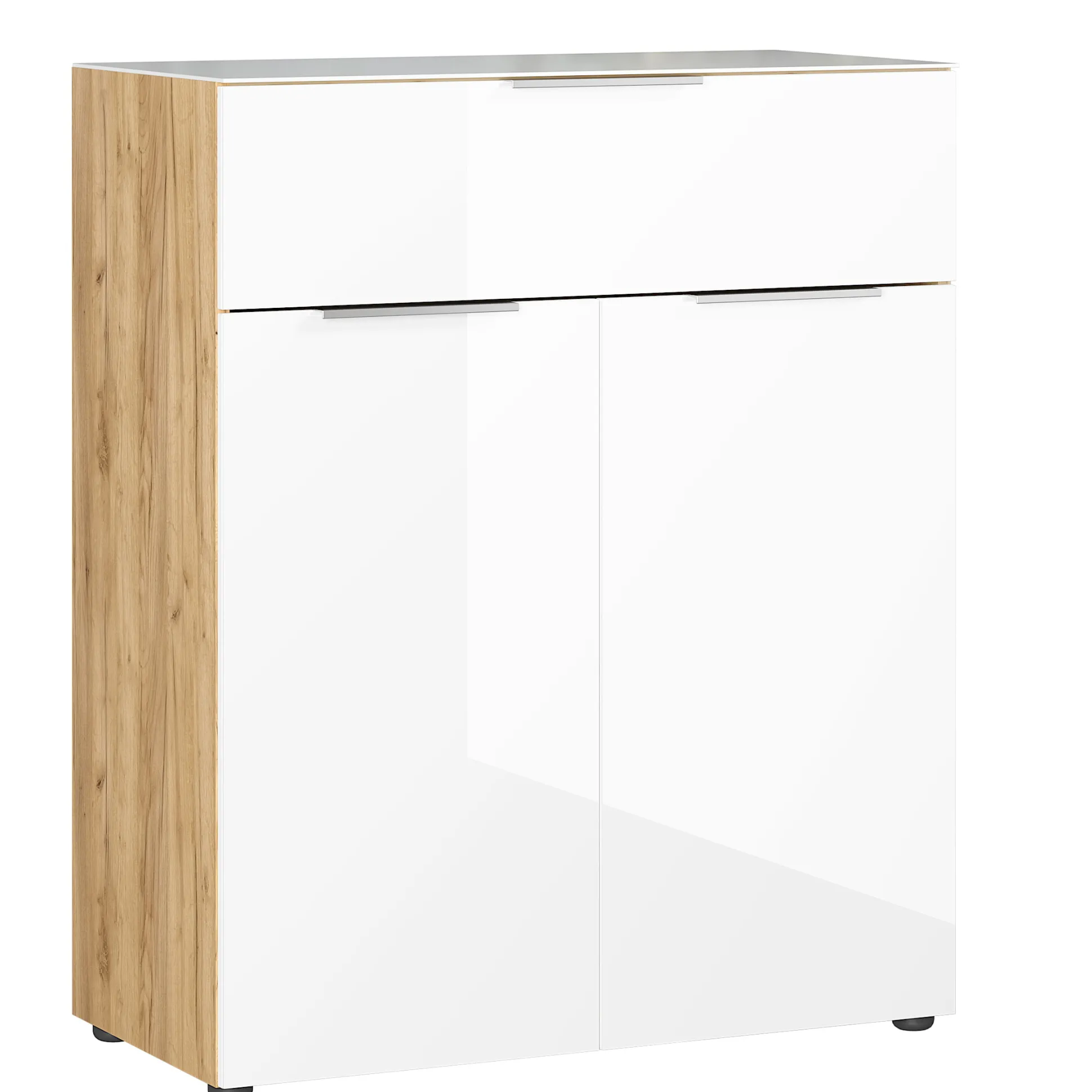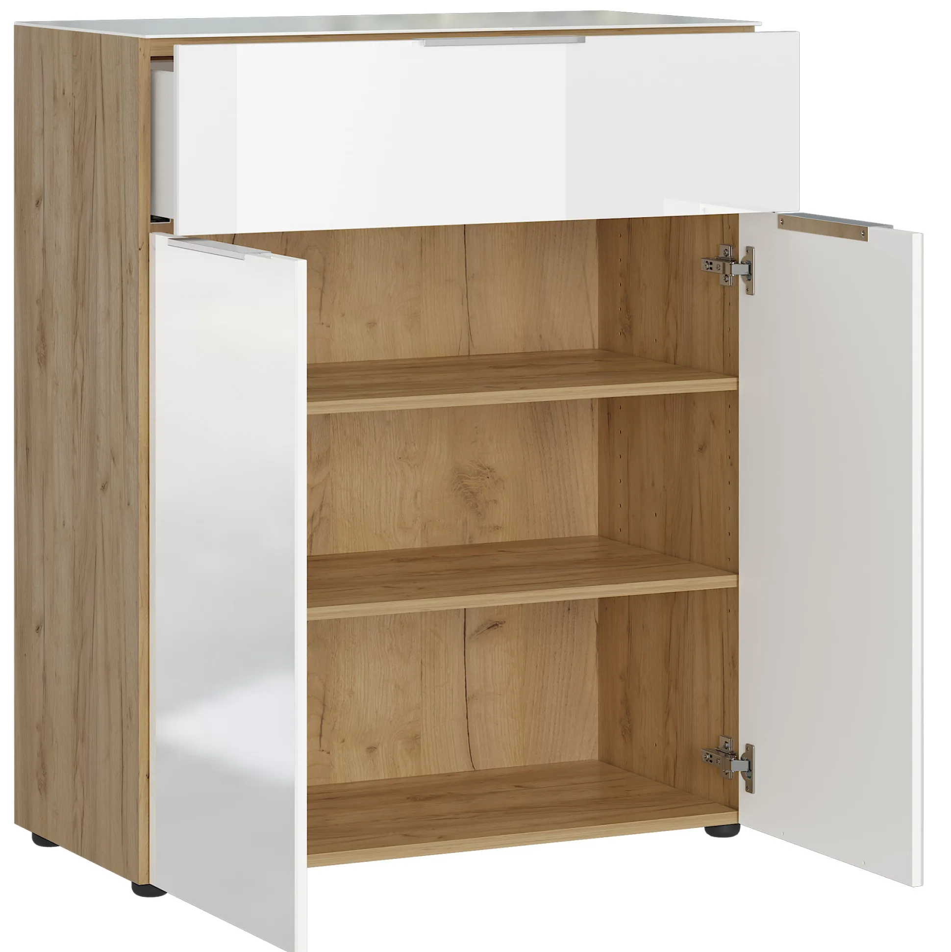 Deze bergkast heeft een combinatie van een deur en een lade. Achter de deuren met softclose-systeem liggen 2 legplanken zodat je 3 opbergvakken hebt.