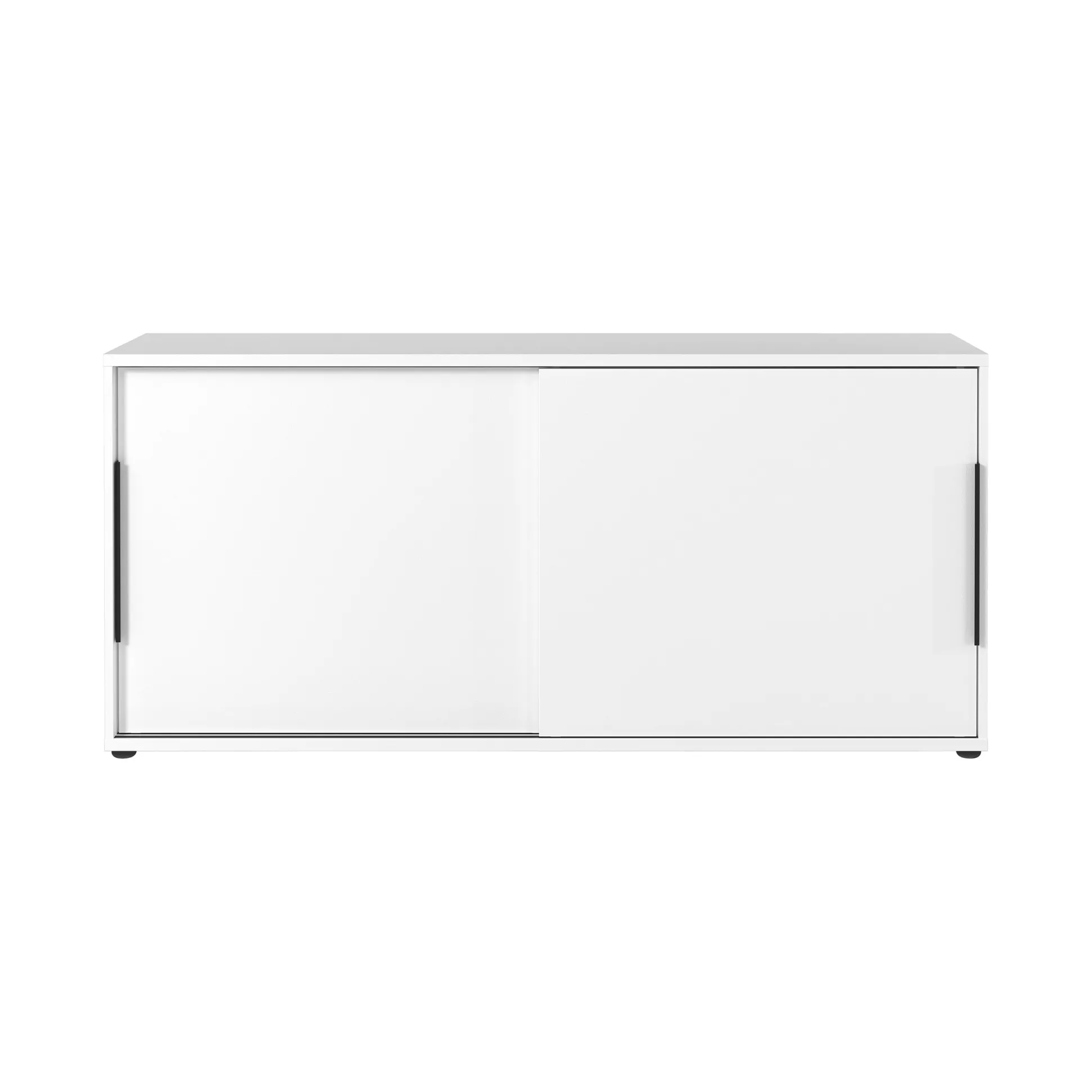 De kast is uitgevoerd in de kleur wit en heeft twee zwarte handgrepen van poeder gecoat metaal. Naast zijn duurzame oppervlaktecoating en schok- en stootbestendige randen, biedt deze kast ook flexibiliteit met zijn schuifdeuren voor gemakkelijke toegang tot de inhoud.