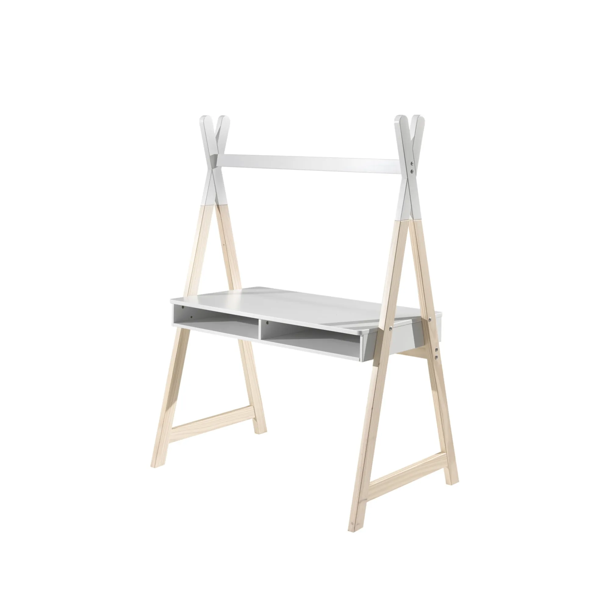 Dit bureau in de vorm van een tipi is goed te combineren met de rest van de meubelen uit deze serie. In het bureaublad bevinden zich twee vakken om al je spullen in kwijt te kunnen, hierdoor begin je al vroeg met een opgeruimd bureau! Het functionele en speelse design geeft dit bureau een Scandinavische look.