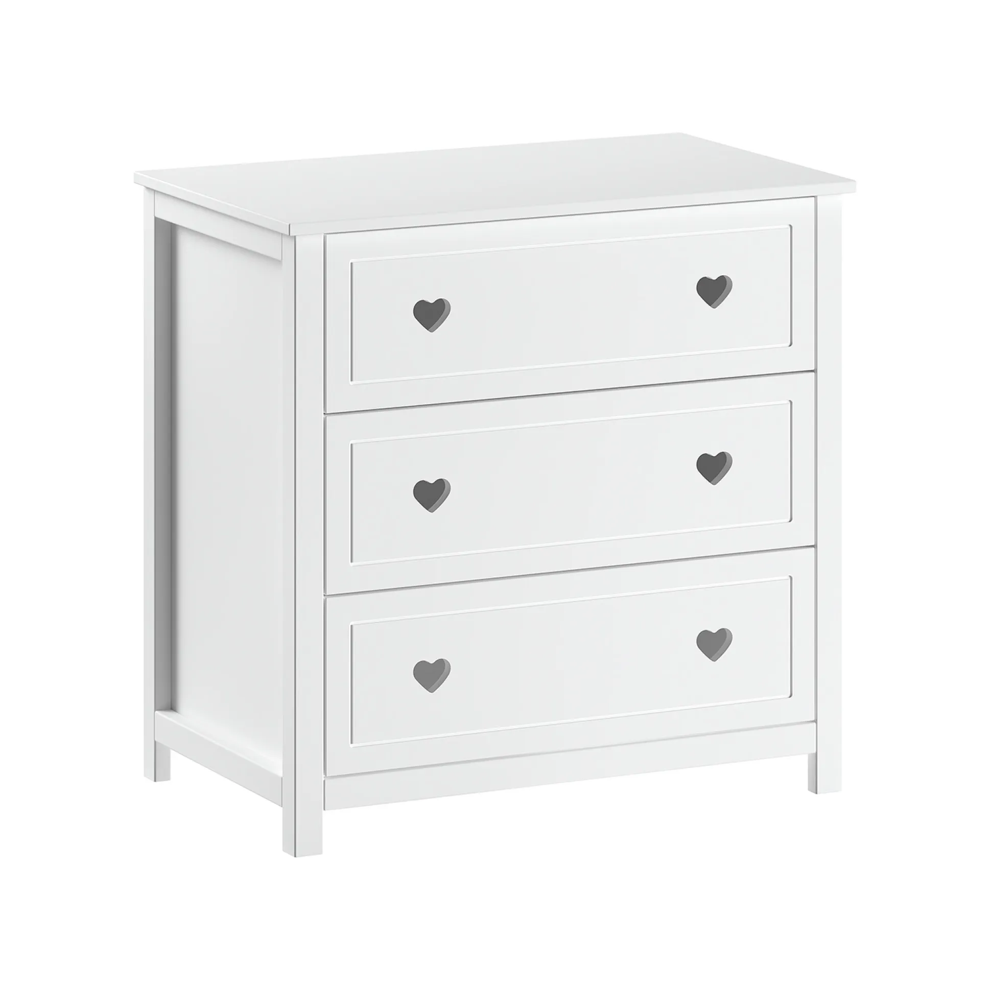 - Drie ruime laden met een hartvormige uitsparing als decoratieve handgreep.