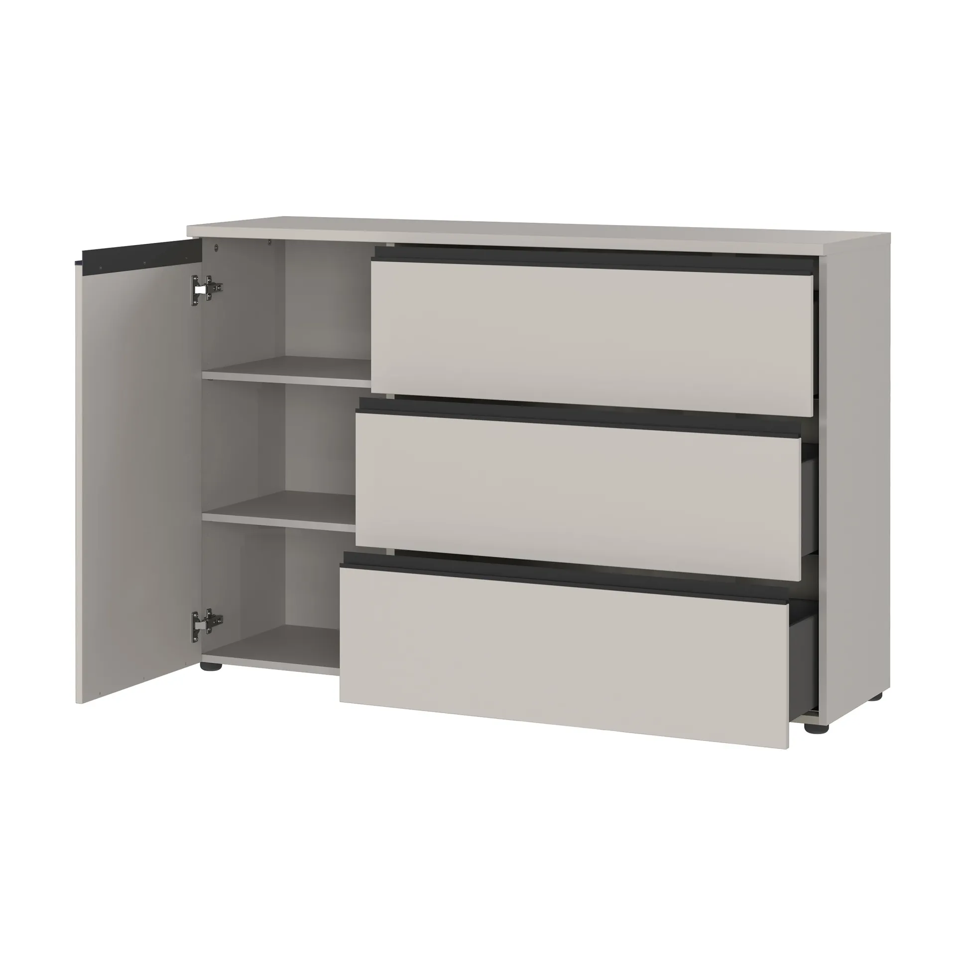Het meubelstuk is uitgevoerd in de kleur steengrijs, met 4 handgreepstrips gemaakt van zwart poeder gecoat metaal en 6 zwarte kunststof meubelglijders. Het is voorzien van een krasbestendige en duurzame oppervlaktecoating, evenals schok- en stootbestendige randen. De deuren en laden sluiten langzaam, zacht en geruisloos vanwege geïntegreerde dempers, wat zorgt voor een rustige gebruikerservaring. Het dressoir is milieuvriendelijk verpakt en geproduceerd in Duitsland.