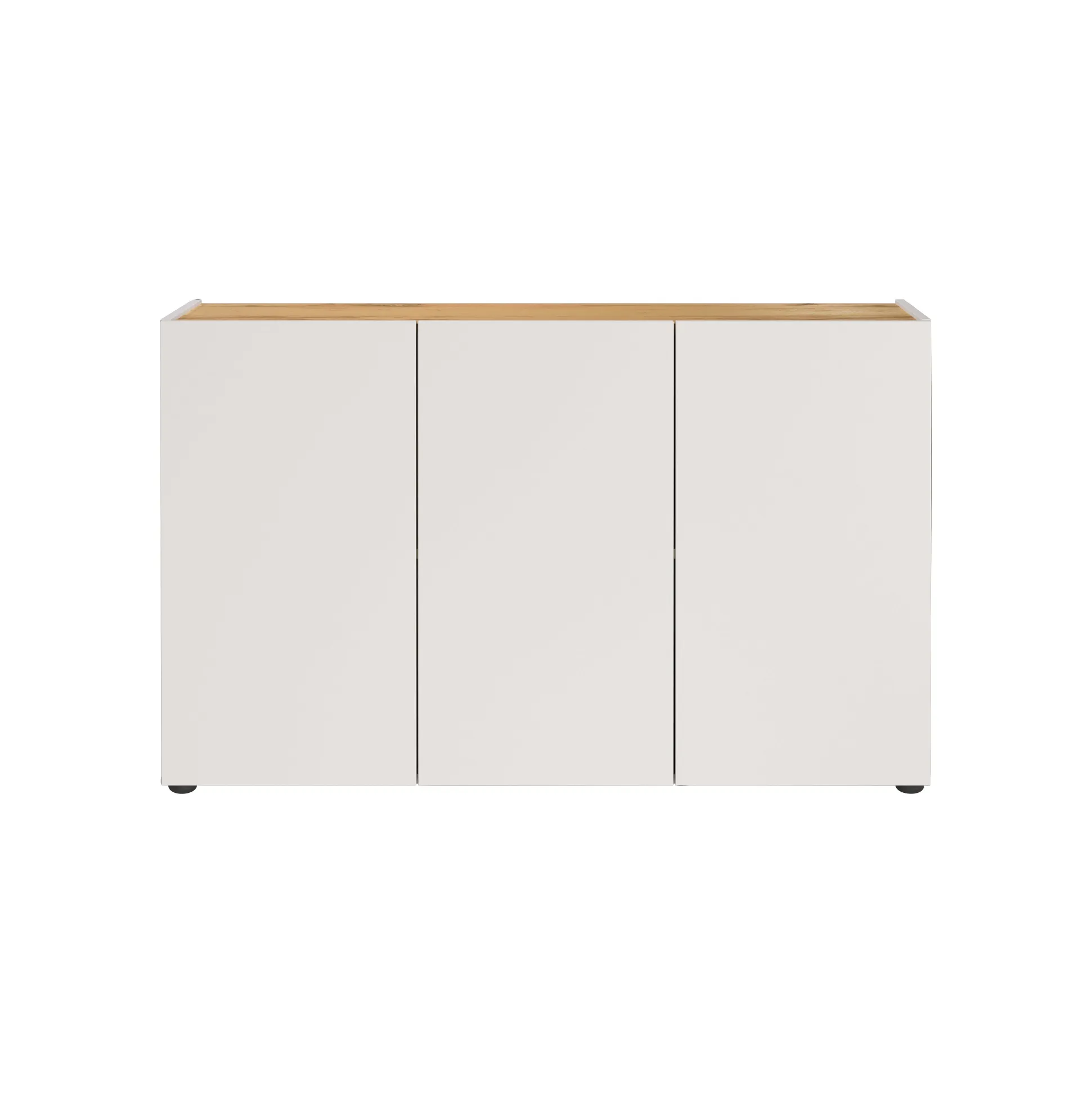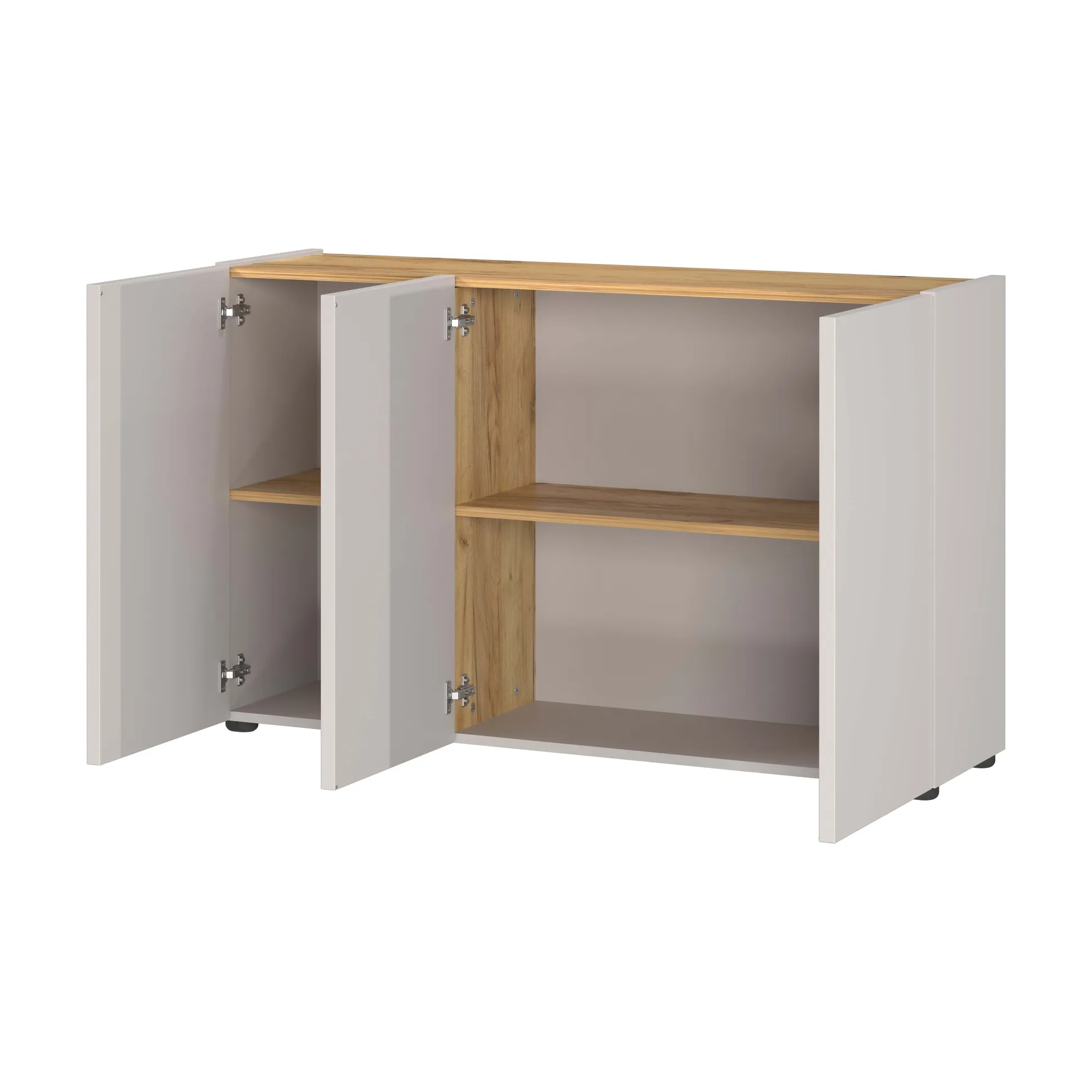 Het dressoir Orlando Kasjmier 120 cm combineert een eigentijds ontwerp met praktische opbergruimte. Het meubel heeft drie deuren met daarachter verstelbare planken, belastbaar tot 10 kg per plank. De handgreeploze deuren sluiten zacht dankzij de geïntegreerde demping. De kasjmier en Navarra eiken afwerking zorgen voor een warme, moderne uitstraling.