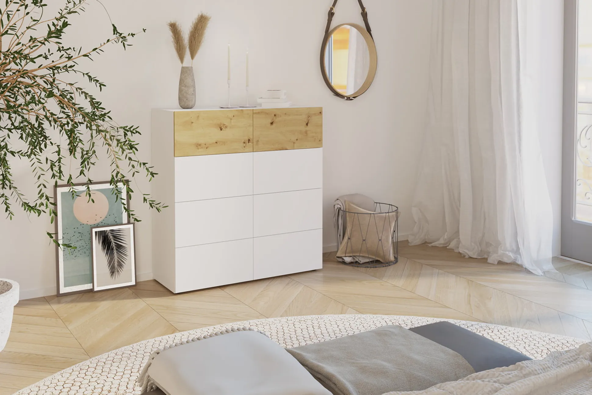 Het dressoir Zeger in wit en artisan eiken biedt een perfecte balans tussen functionaliteit en stijl. Dankzij de ruime opbergmogelijkheden is het ideaal voor woon- en eetkamers. Verkrijgbaar in verschillende afmetingen.