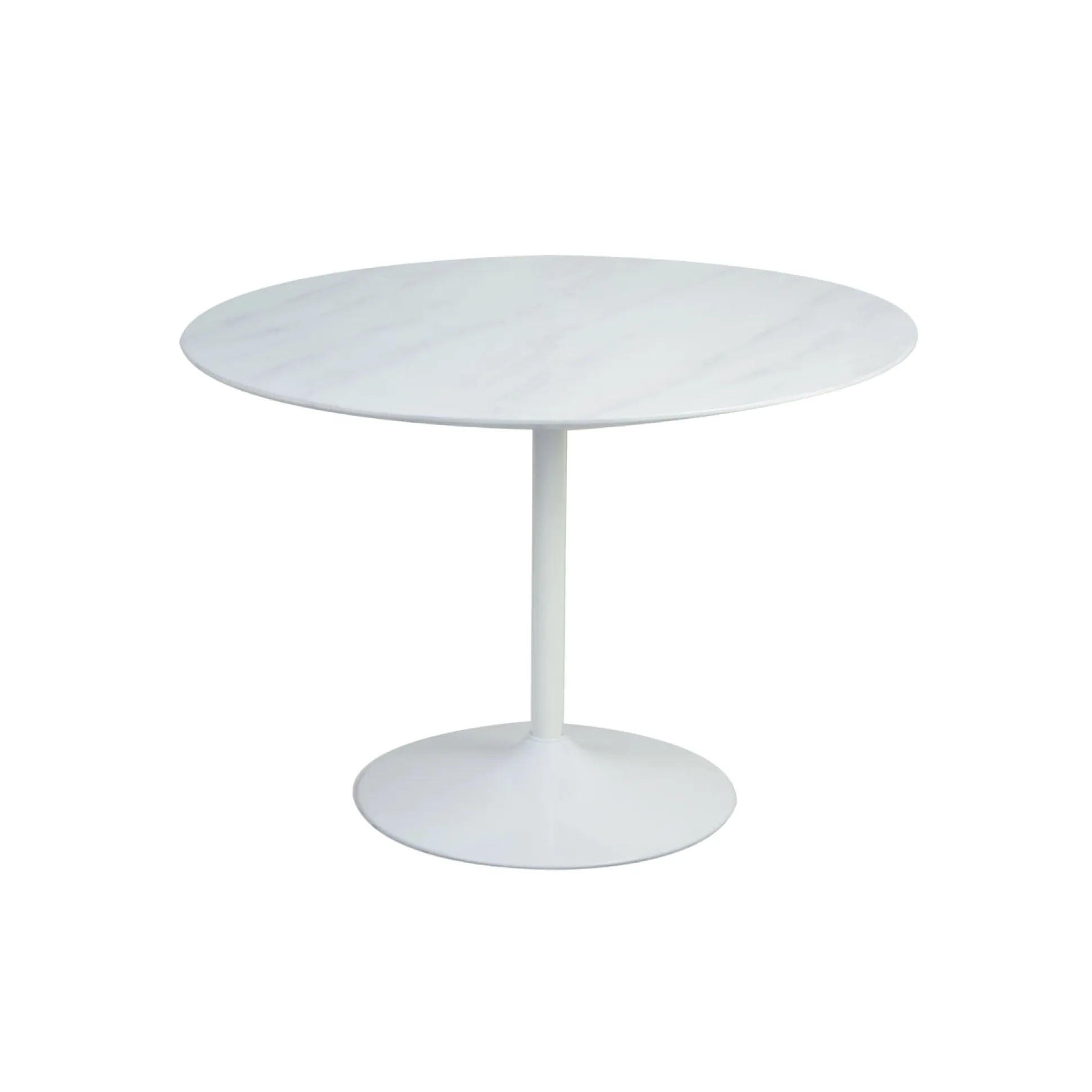 Deze ronde tafel kan gebruikt worden voor meerdere doeleinden. Het MDF-tafelblad met een doorsnede van 110 centimeter is afgewerkt met een marmeren melamine. Door zijn gepoedercoate metalen frame staat deze tafel stevig op de grond.