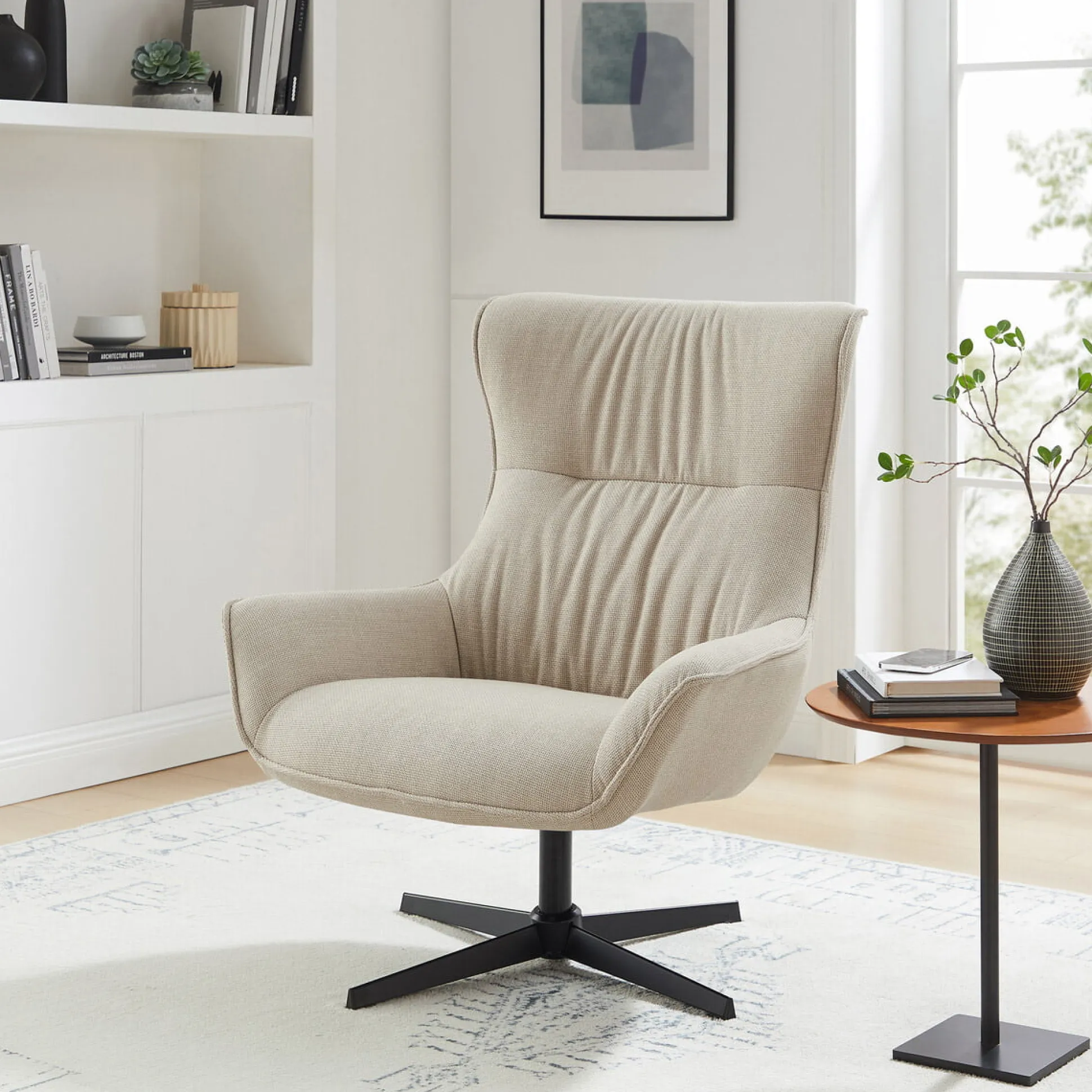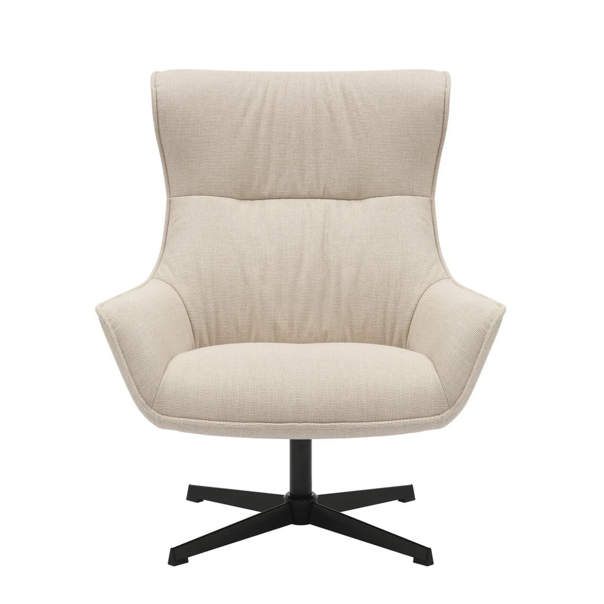 Met zwart gepoedercoate metalen poten en een rotatiefunctie, is deze fauteuil zowel stijlvol als praktisch. De bekleding is Oeko-Tex gecertificeerd en PFC-vrij, met een slijtvastheid van 50.000 Martindale-cycli en een lichtbestendigheid van 5. De maximale draagcapaciteit bedraagt 150 kg, en de fauteuil is vrij van vering voor een stevige zit.