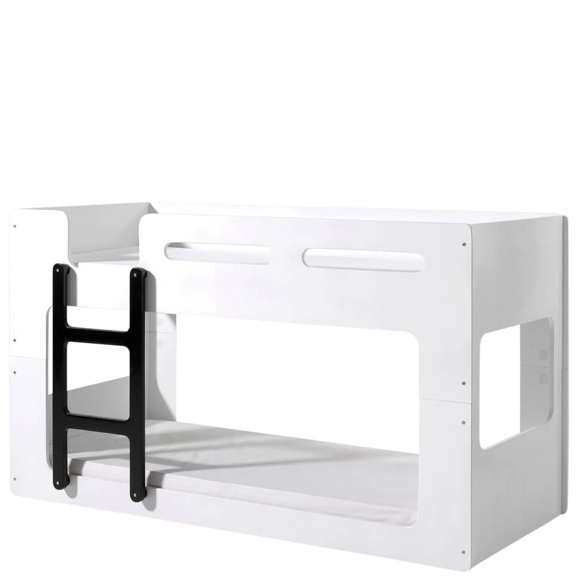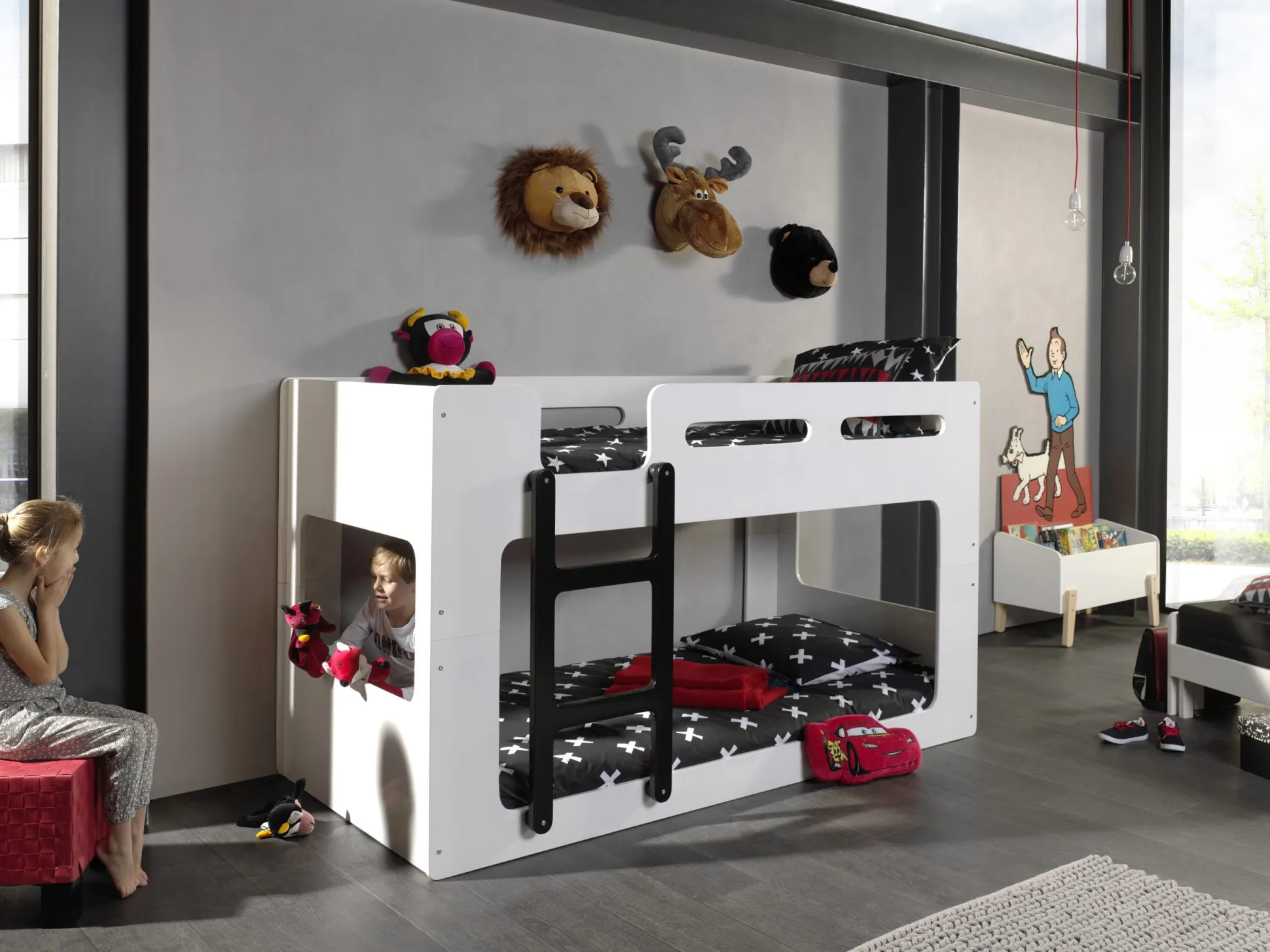 Deze strak gevormde halfhoogslaper is vervaardigd uit wit gelakt MDF met een zwarte ladder en biedt plaats aan 2 kinderen. Het bed is inclusief een 2 lattenbodems, maar de matrassen van 90×200 cm. dien je wel los bij te bestellen. In de collectie van huisenthuis.nl heb je hierin een prima assortiment.