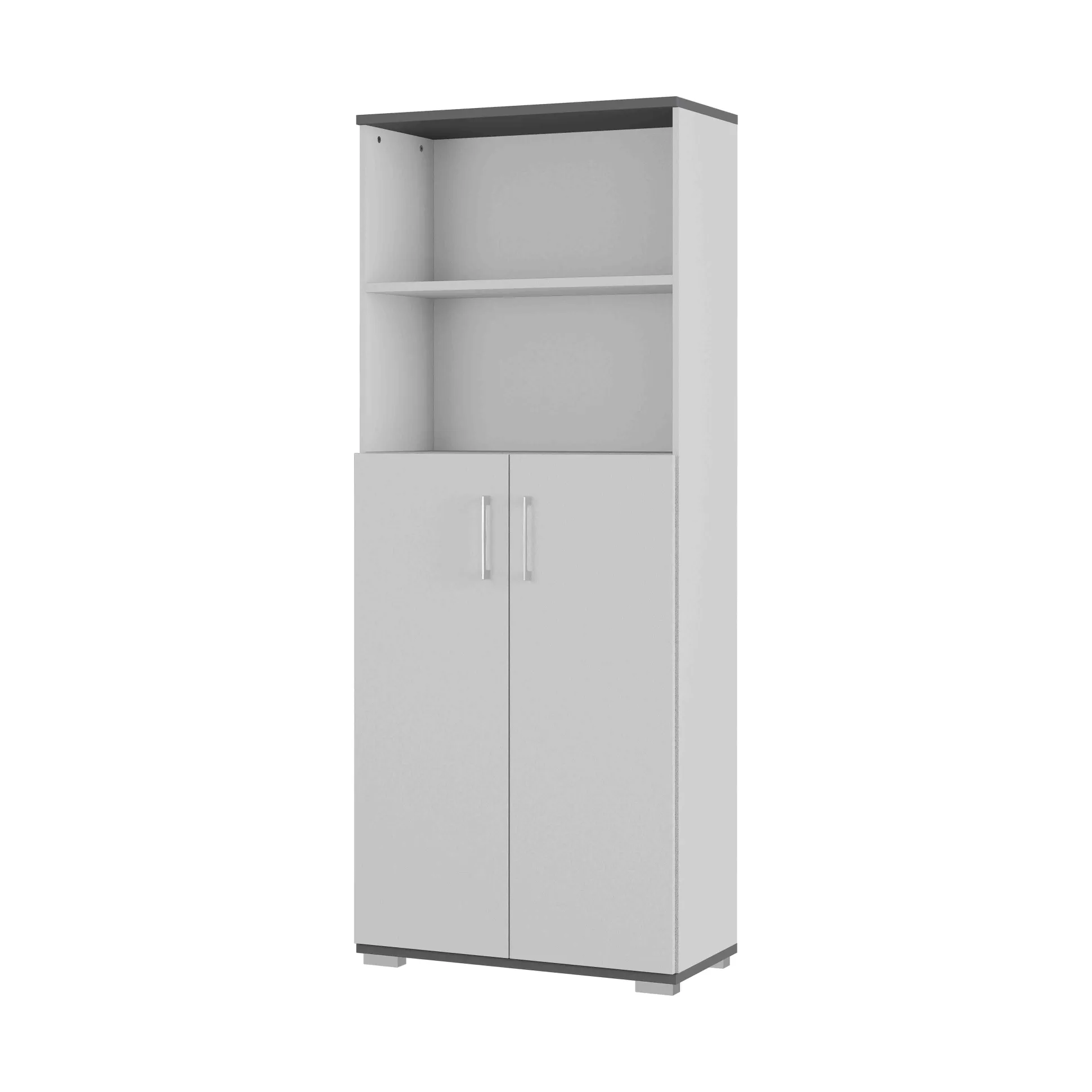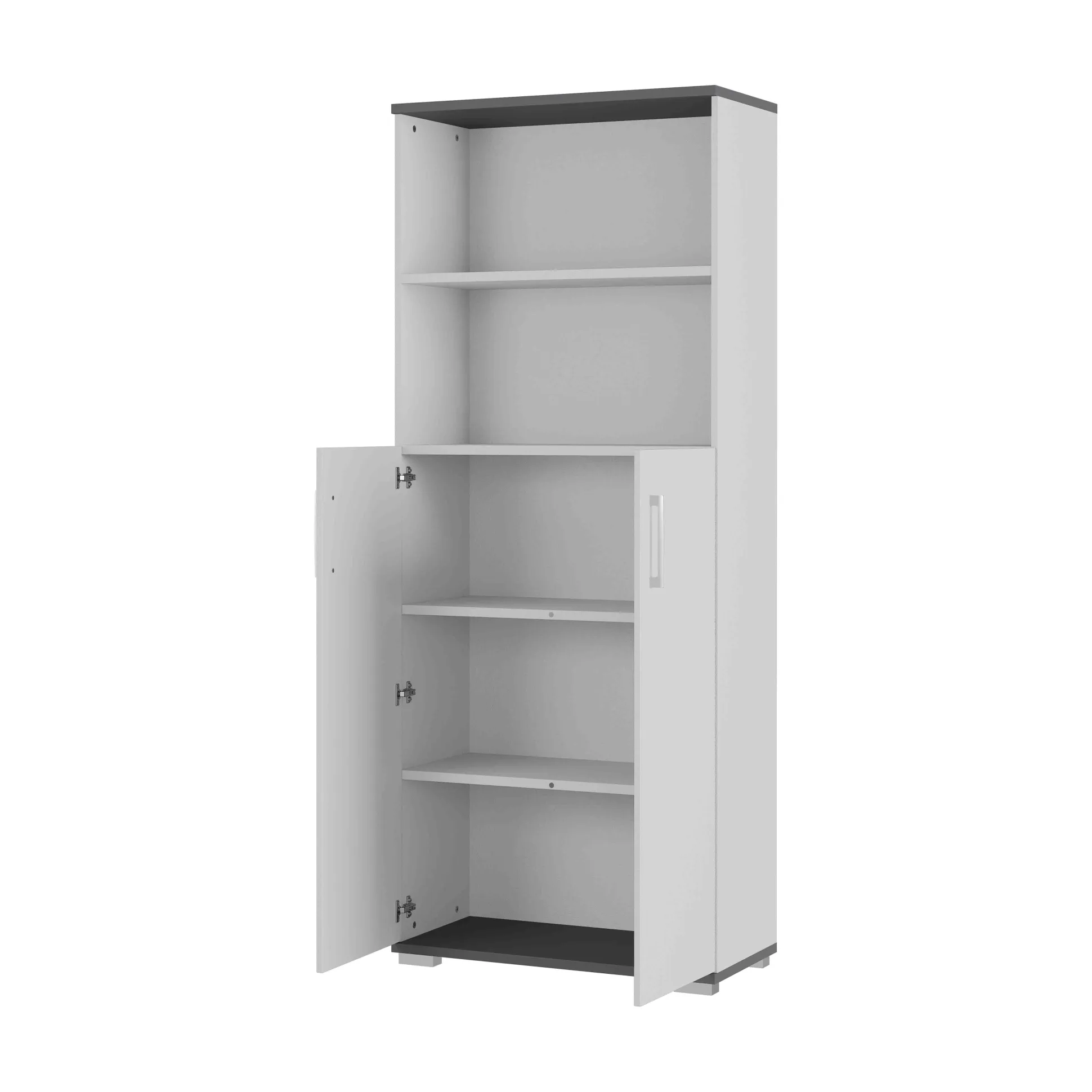 Deze hoge halfopen kantoorkast is 80cm breed, 200cm hoog en 40cm diep. Achter de twee deuren bevinden zich drie compartimenten om spullen op te bergen zoals ordners, mappen of boeken. Boven de twee deuren bevinden zich nog twee compartimenten voor nog meer opbergruimte voor al uw andere (kantoor)spullen.