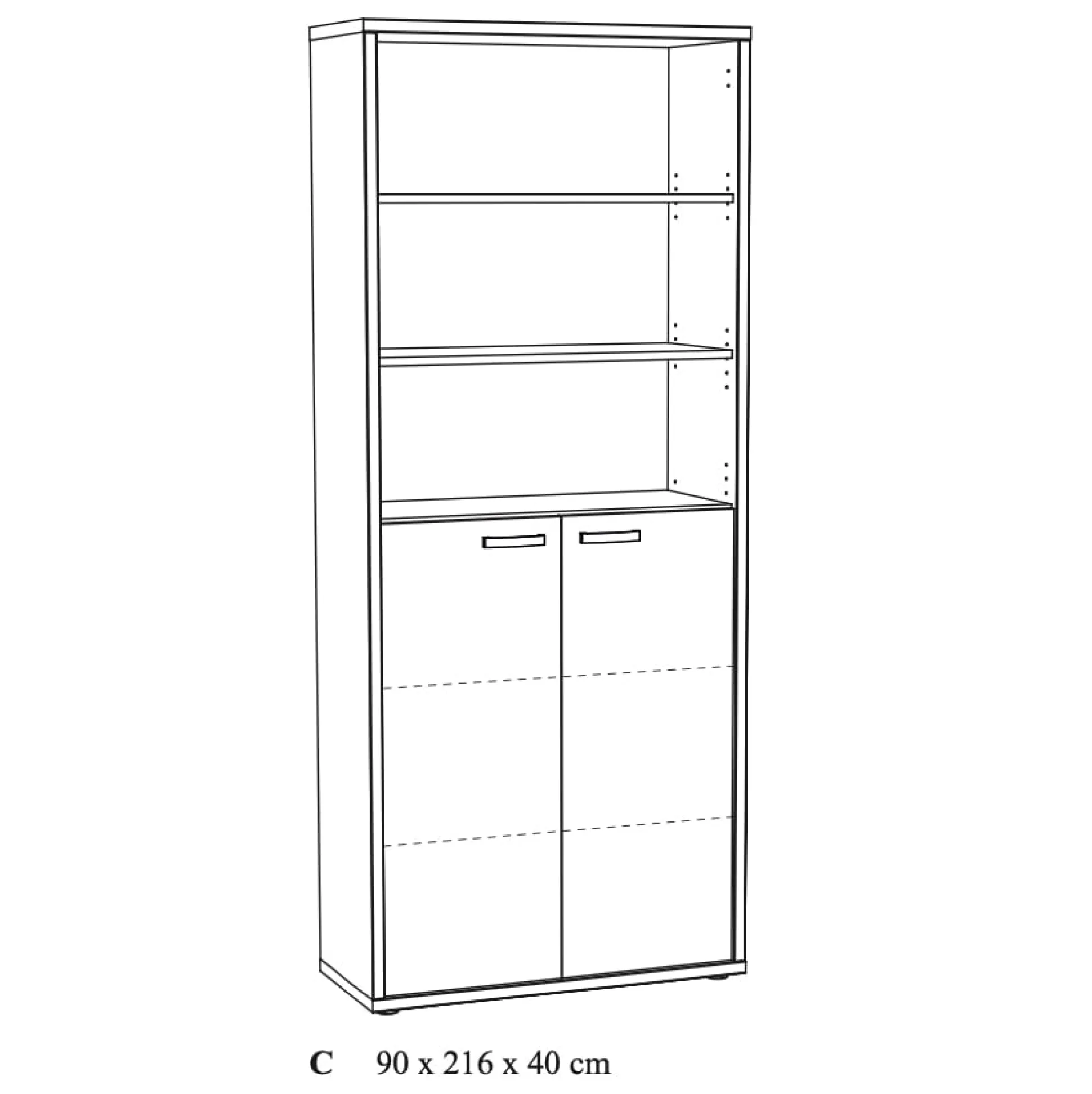 Deze hoge halfopen kast uit de kantoorcollectie Spinoza heeft een trendy uitstraling door de afwerking in lichtkastanje hout met zwart accenten. De strakke zwarte handvatten maken het moderne meubel helemaal af. De platen zijn afgewerkt met een sterk krasvast melamine toplaag. Achter de twee openslaande deuren bevinden zich nog twee extra planken om uw spullen op te bergen. In combinatie met de andere kasten van de kantoorcollectie Spinoza kunt u een mooie wandcombinatie maken.