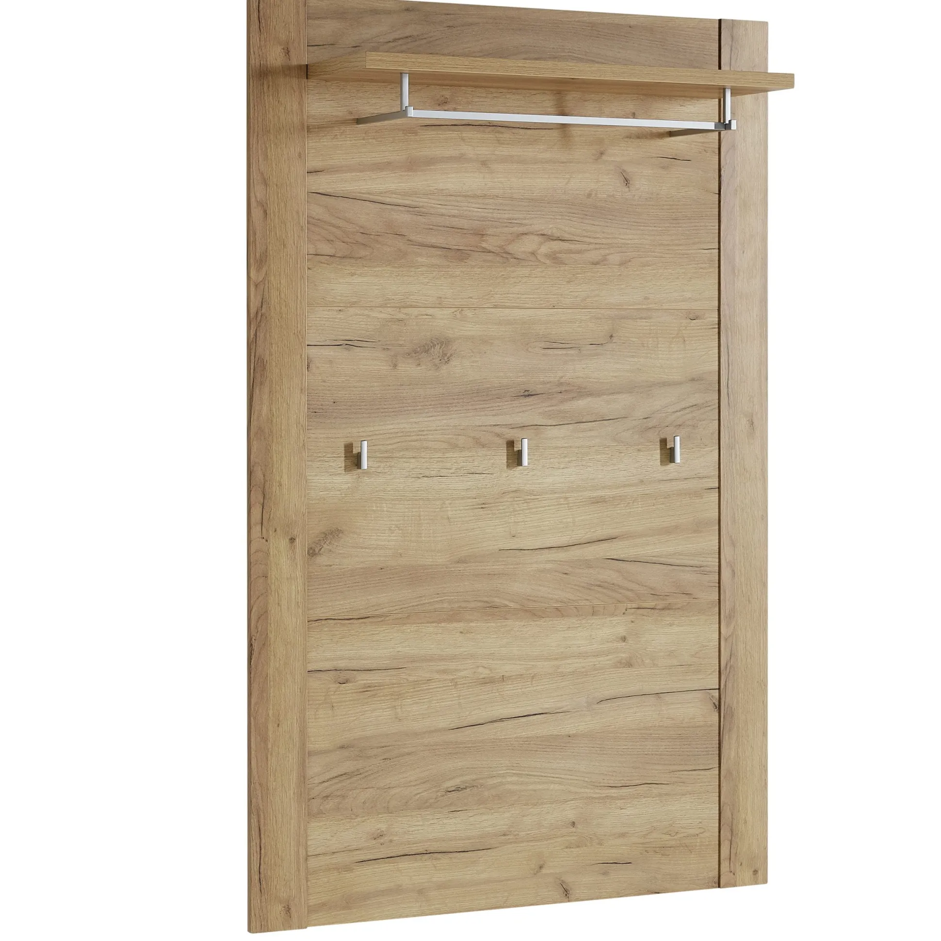 Een breed kapstokpaneel voor aan de muur in repro eiken voor boven de zit-/halbank met boven een plank, waaronder een metalen kledingstang en 3 kapstokhaken voor uw jassen etc.
