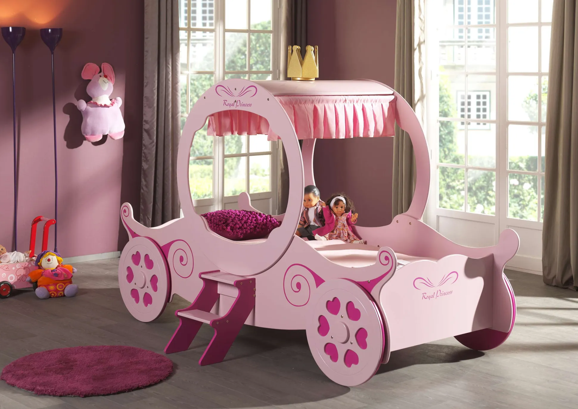 Een elegant bed in de vorm van een prinsessenkoets met gordijntjes en een kroon, dat geschikt is voor elke prinses. De koets is voorzien van een trapje die een opstap geeft naar het bed en is omringd met een verhoogde rand die ervoor zorgt dat je prinses veilig in bed kan slapen. Het bed is vervaardigd uit hoogwaardig MDF. In het bed past elke matras van 90 x 200cm uit de collectie van huisenthuis.nl.