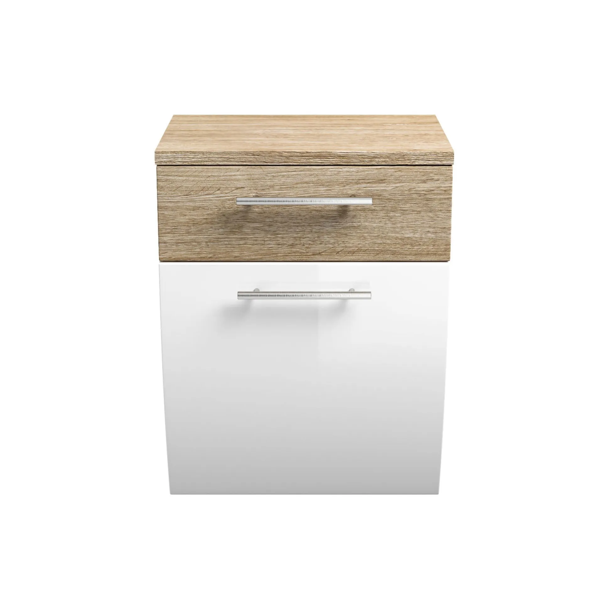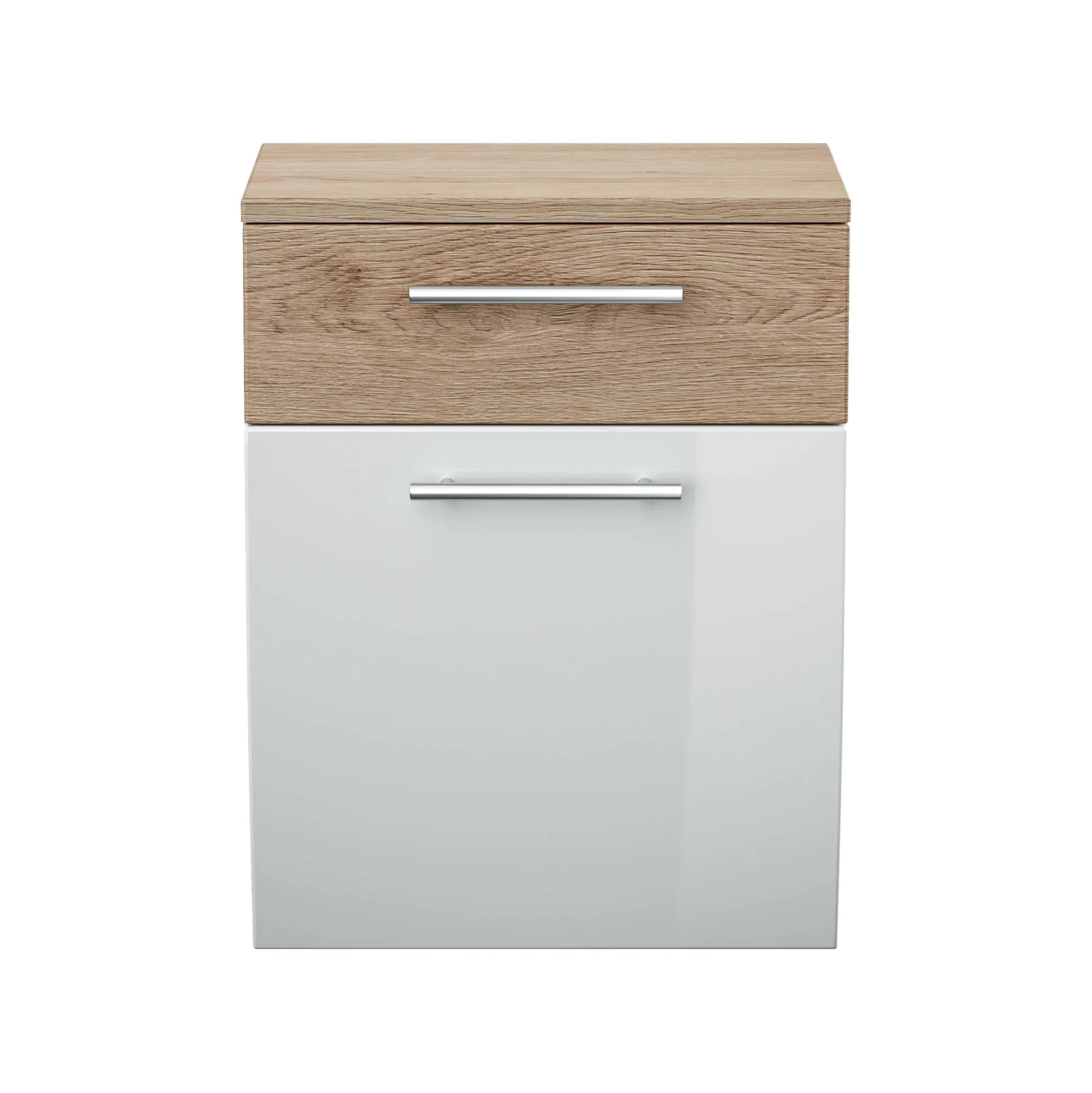 Deze klassieke badkamer kast biedt voldoende opbergruimte voor al je badkamerbenodigdheden. In de lade kun je gemakkelijk je dagelijks spullen kwijt, achter de gebogen klep de schone handdoeken. De hoogglans fronten in combinatie met de metalen handgrepen maken deze kast af. Door zijn melamine afwerking is deze kast gemakkelijk schoon te houden en langer beschermd tegen stof, vuil en krassen. Richt je badkamer in één keer helemaal in met de bijpassende meubelen uit deze serie!